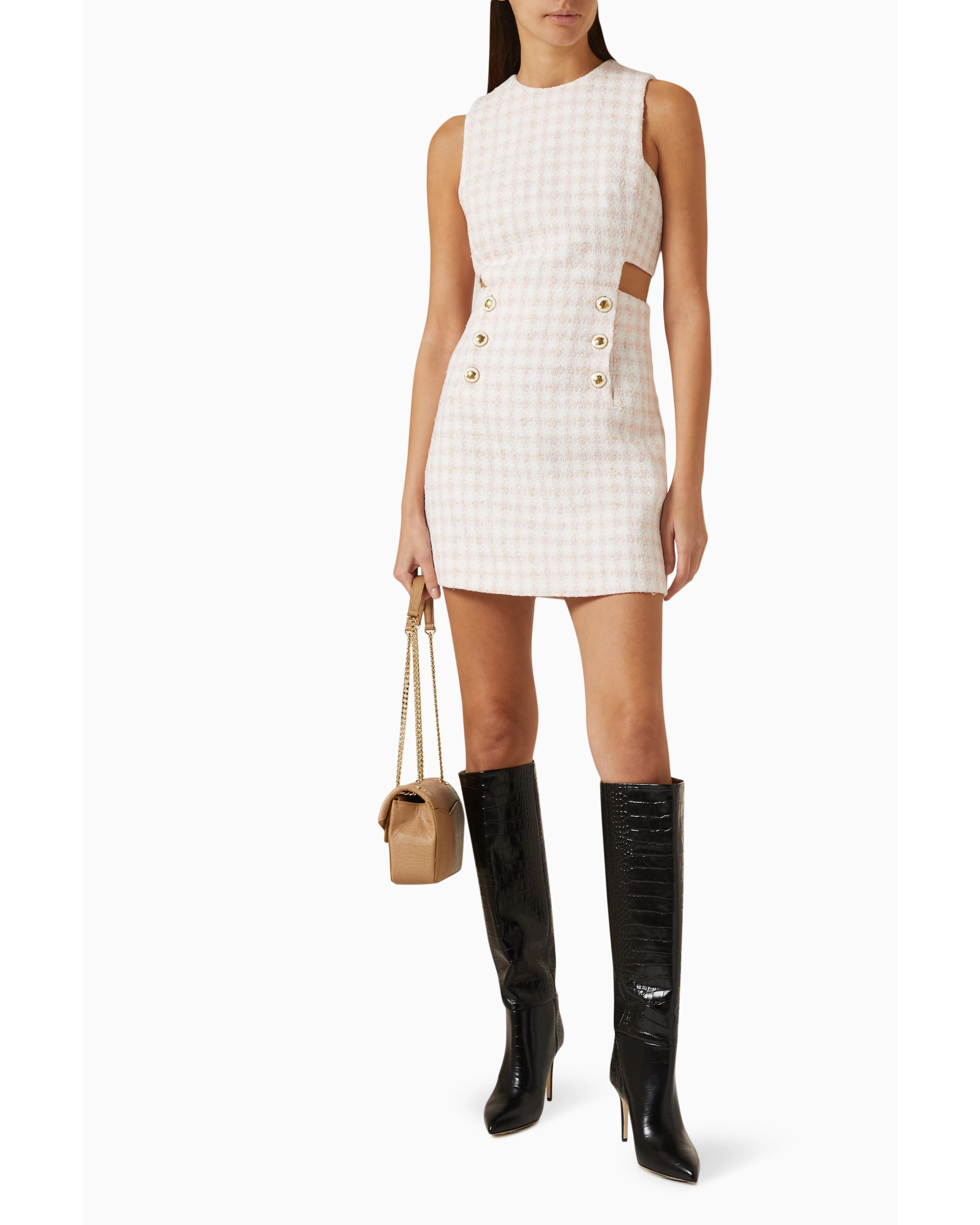 Sandro's Liana dress blurs the lines between contemporary and classic. The tweed mini was designed in Paris and modernises its shift-dress silhouette with cut-outs at the waist and gleaming gold-tone buttons.