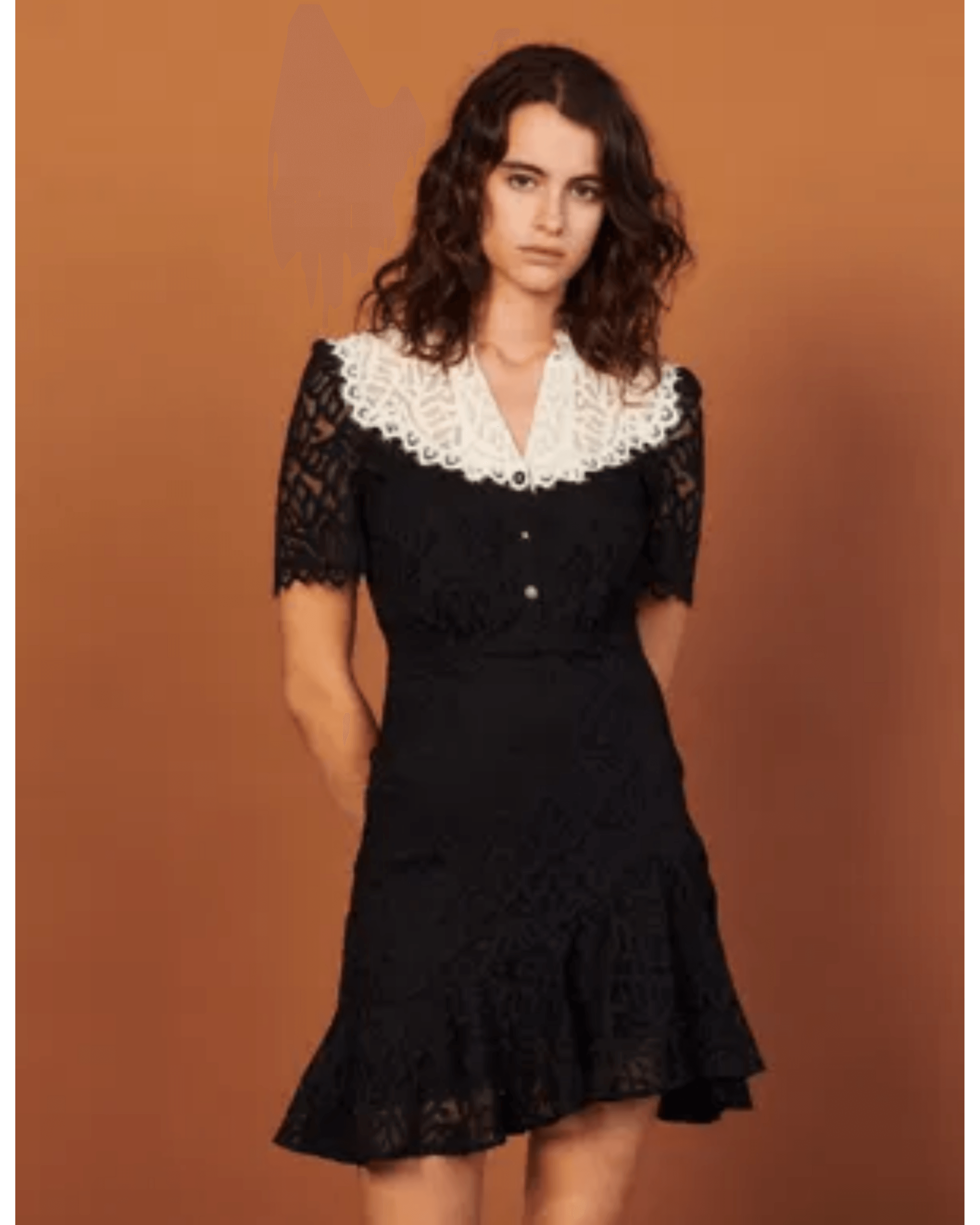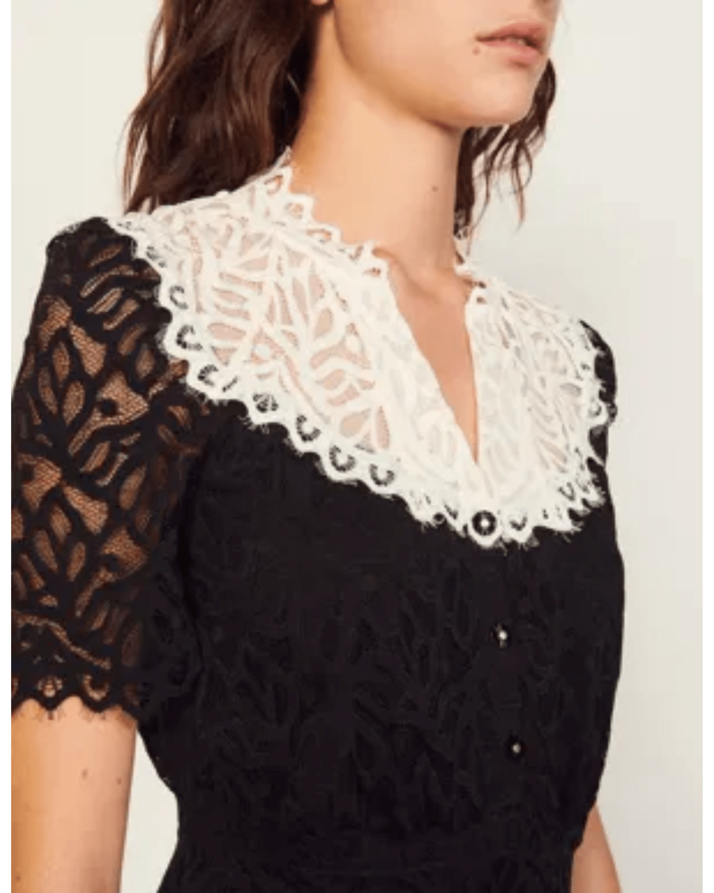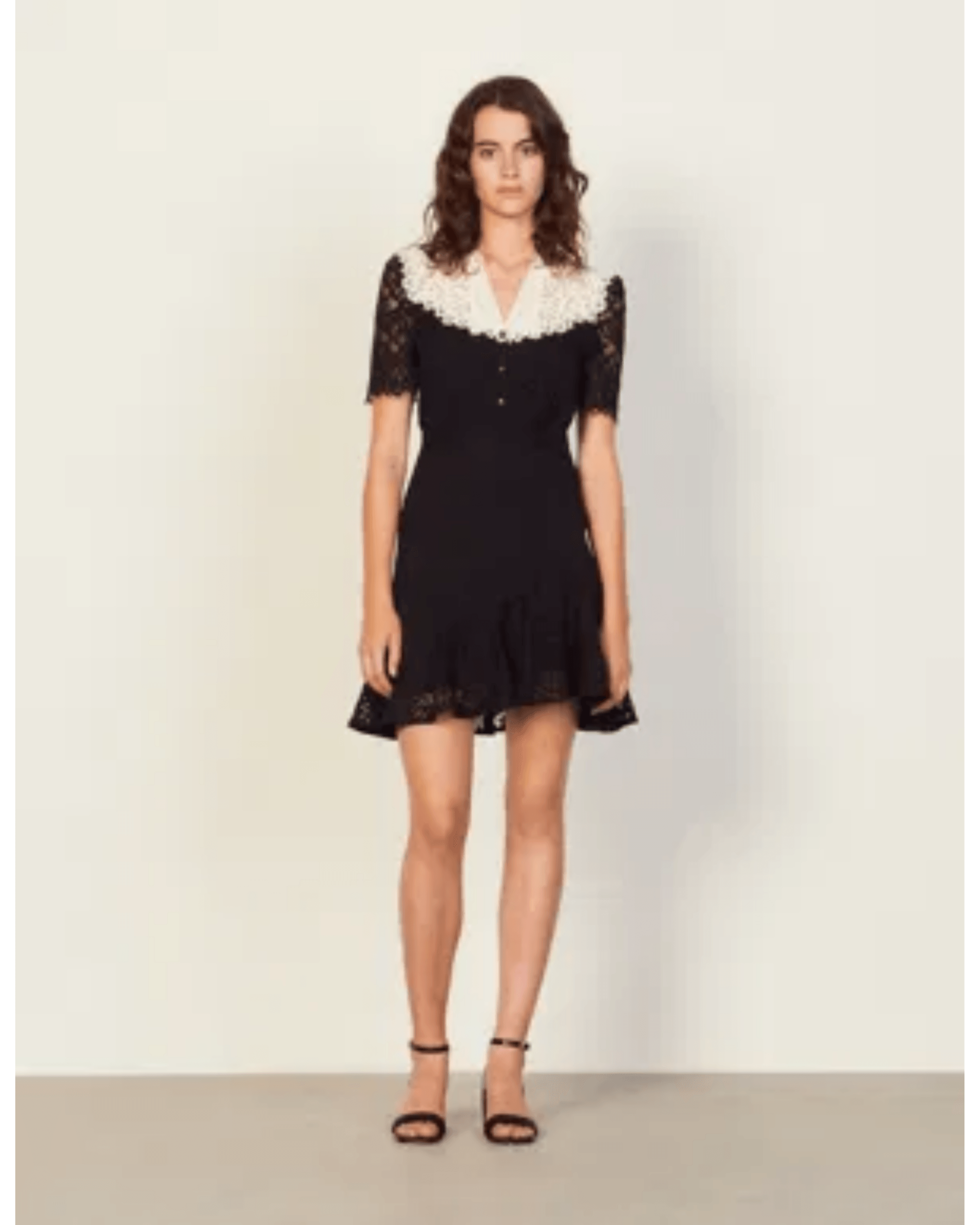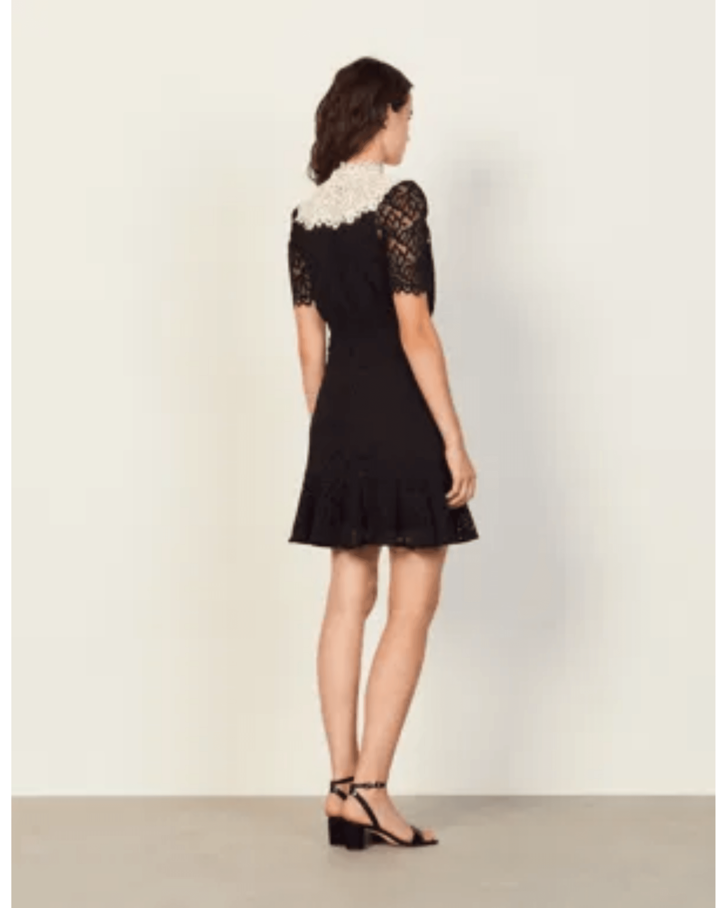 Short dress in two-tone lace. V-neck. Short sleeves. Daisy buttons at the top of the dress. Mid-thigh length with small ruffle at the hem. Fastened with a concealed zip.