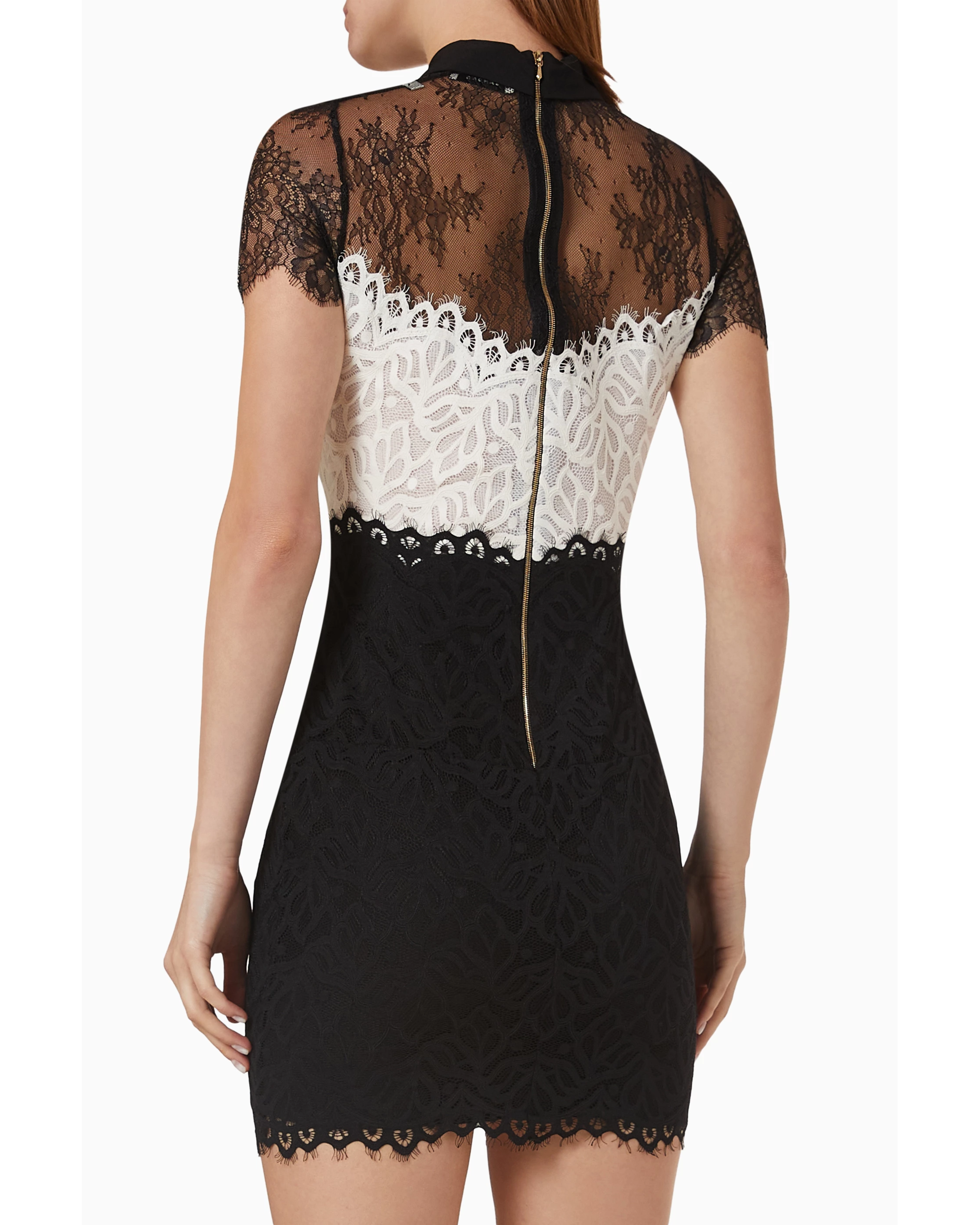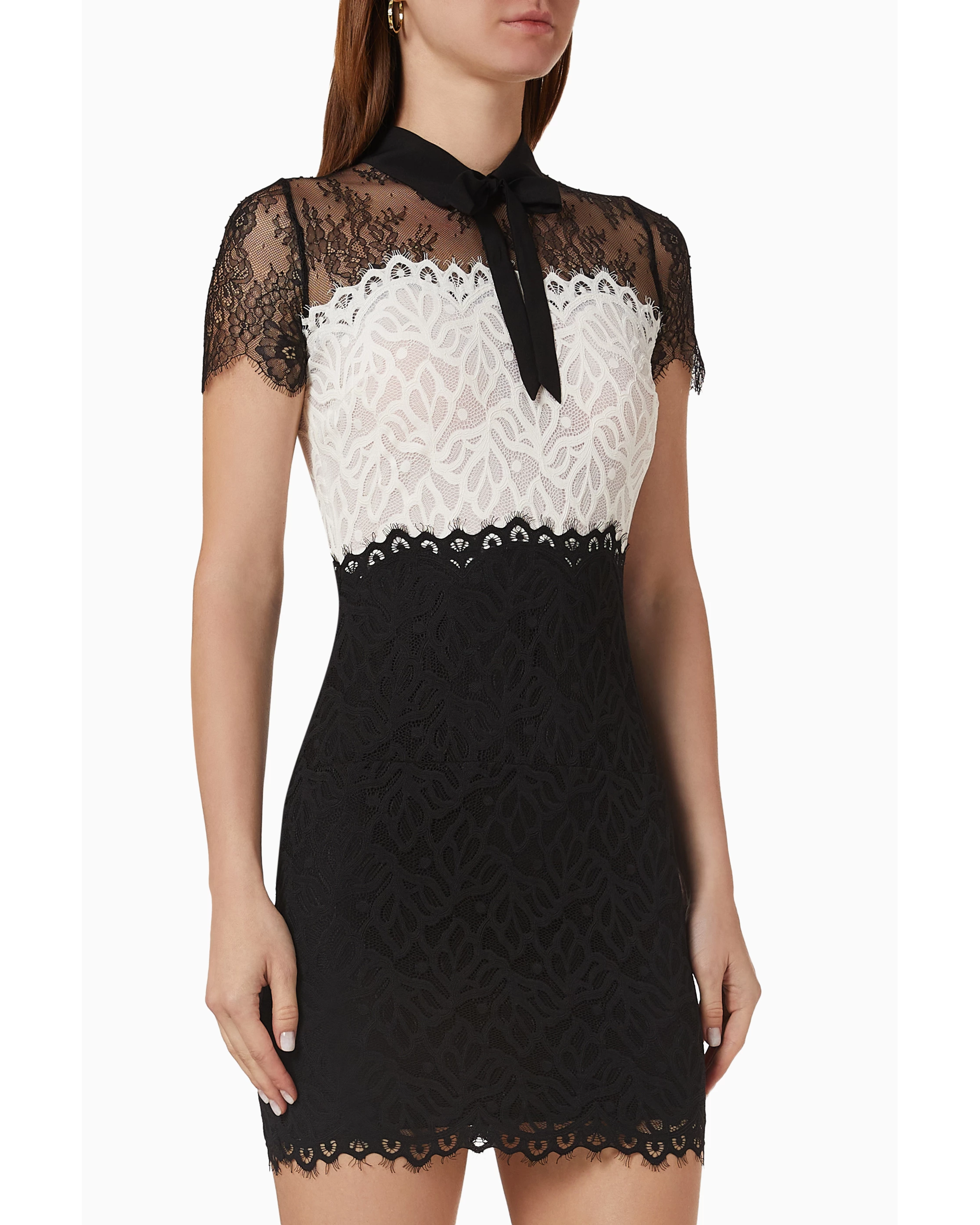 This short dress from the latest collection by Parisian brand Sandro is the perfect choice for your special occasion look this season. It features a two-tone lace bodice and a Peter Pan collar for a touch of elegance.