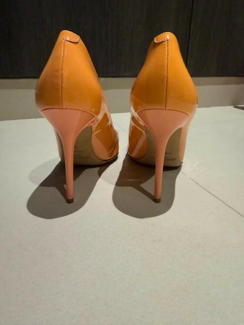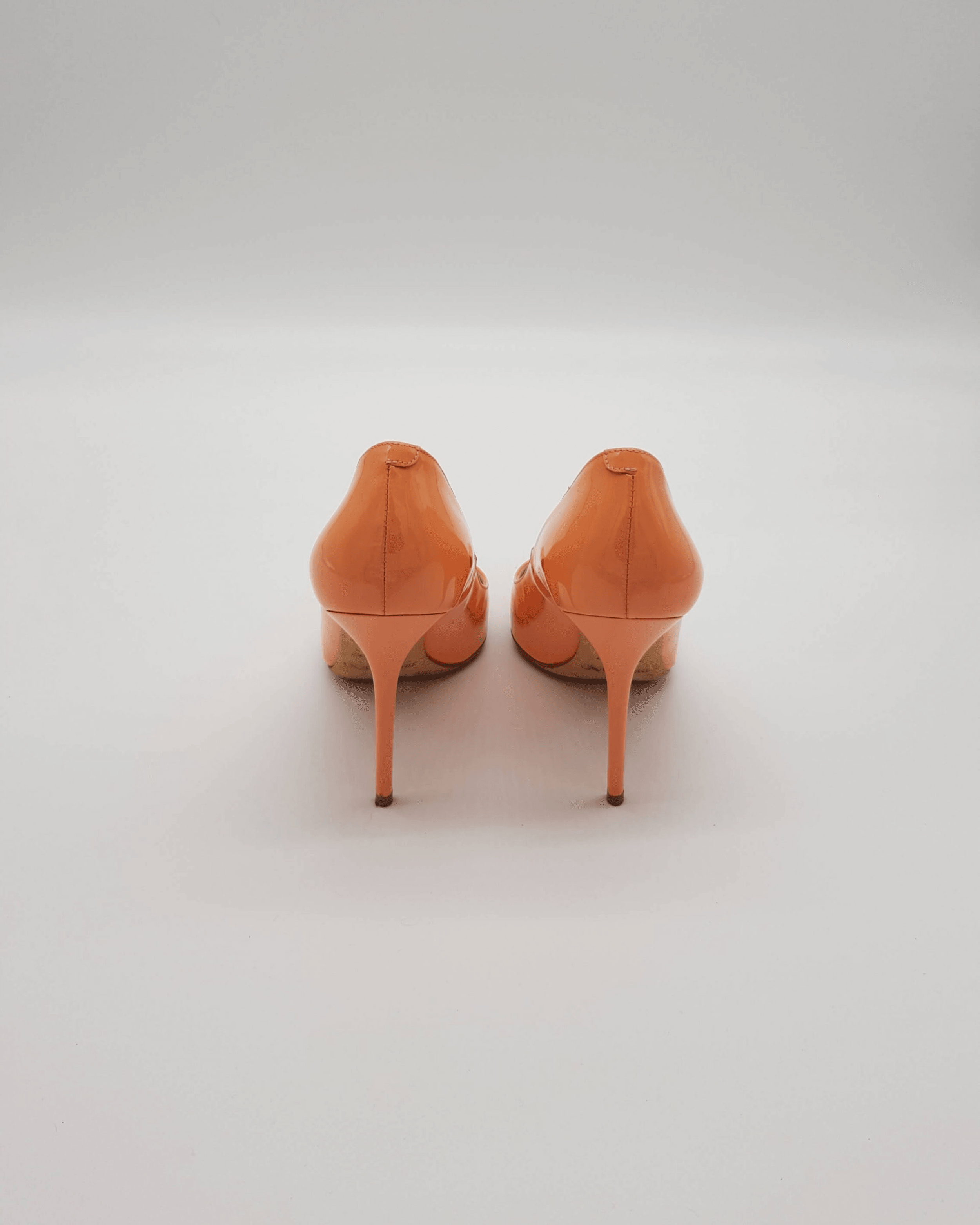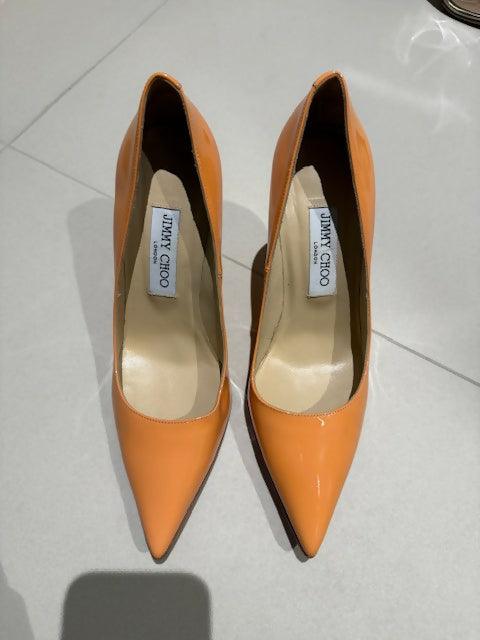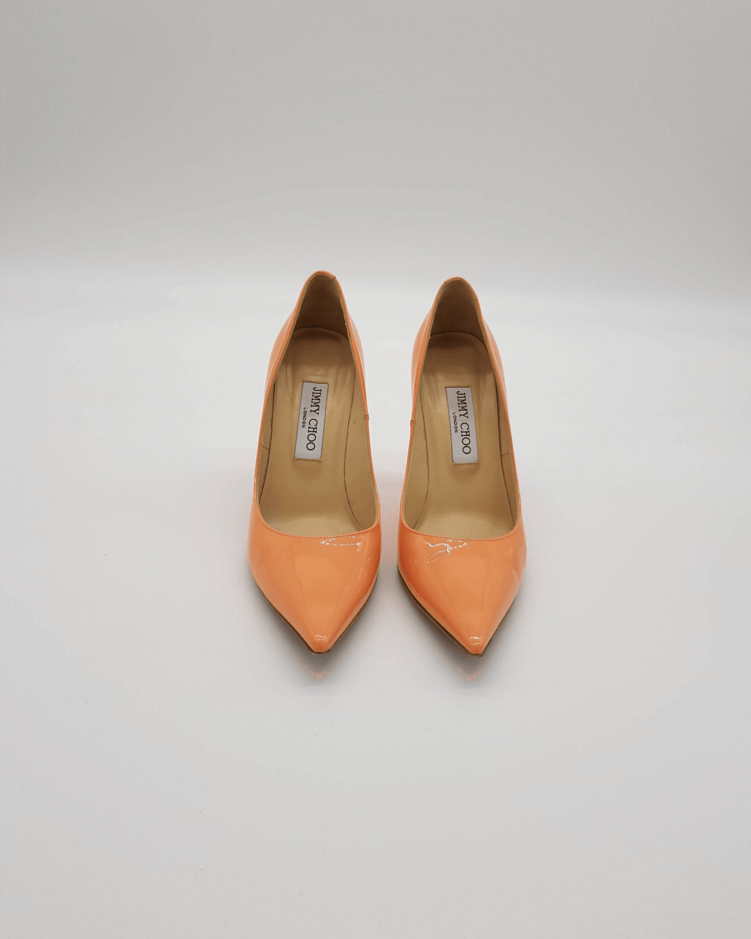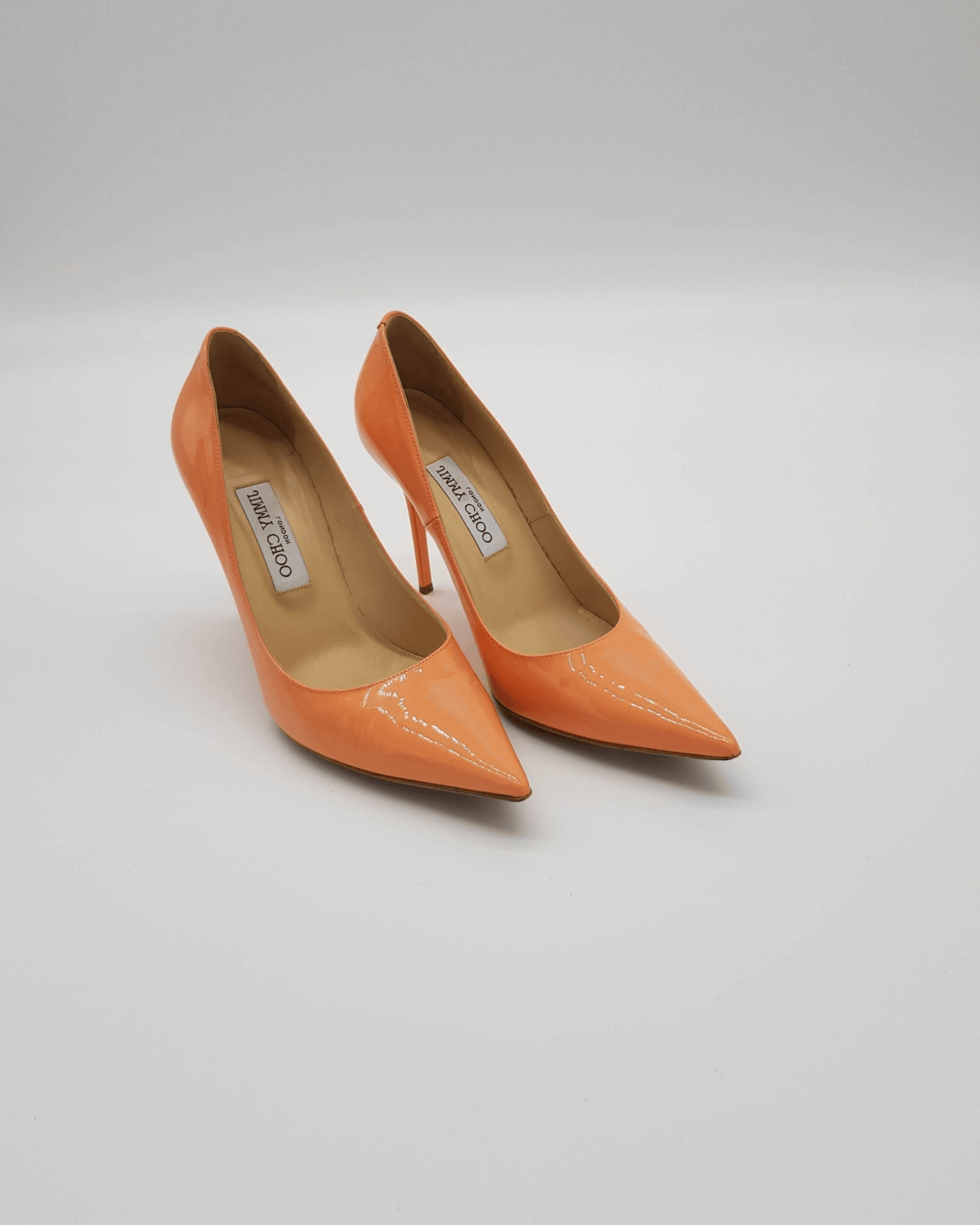 Tangerine patent leather pumps from Jimmy Choo featuring a pointed toe, a leather sole and a patent covered stiletto heel.