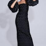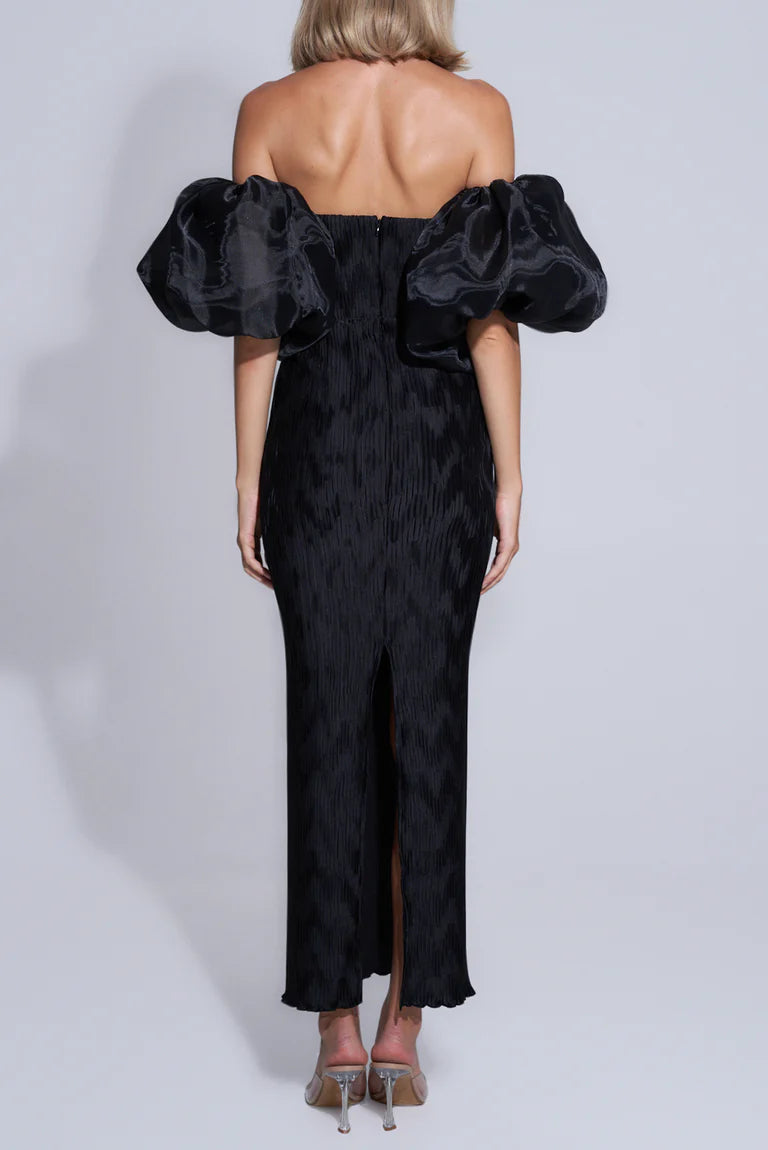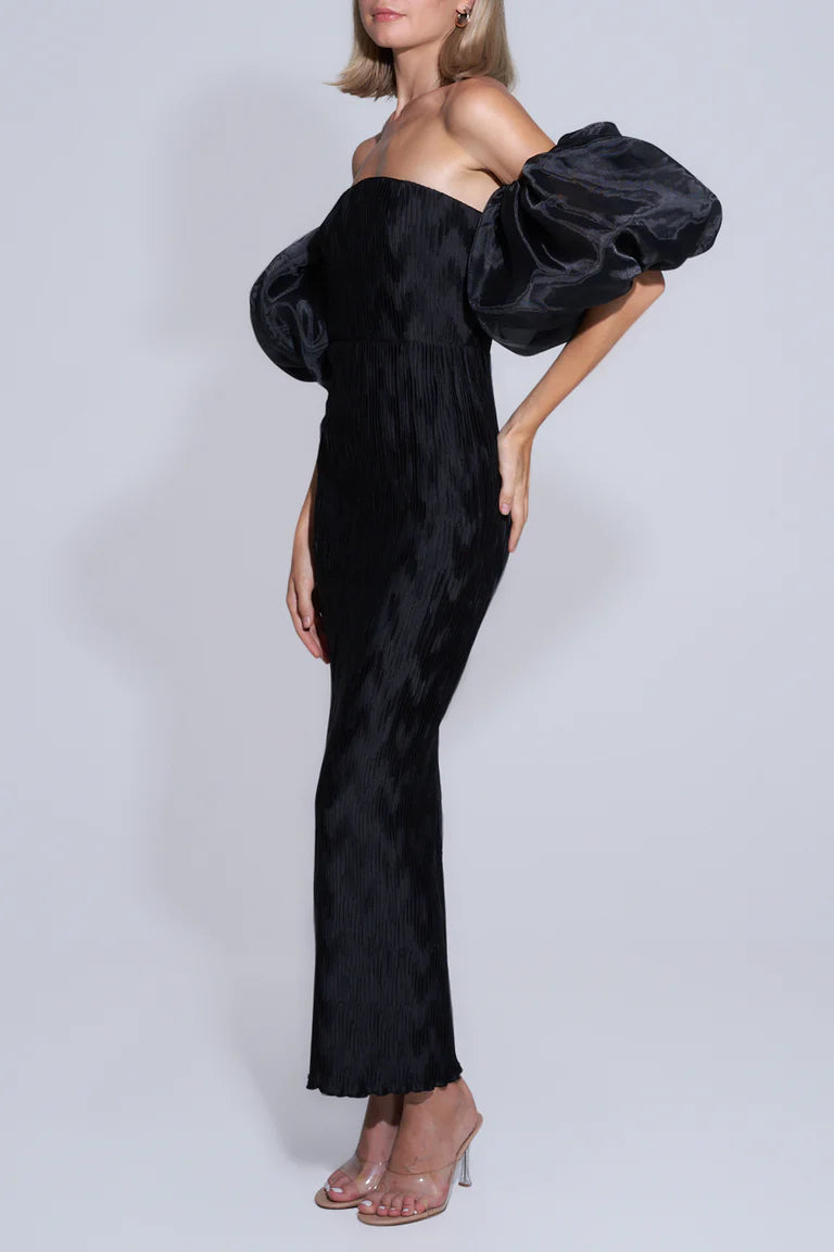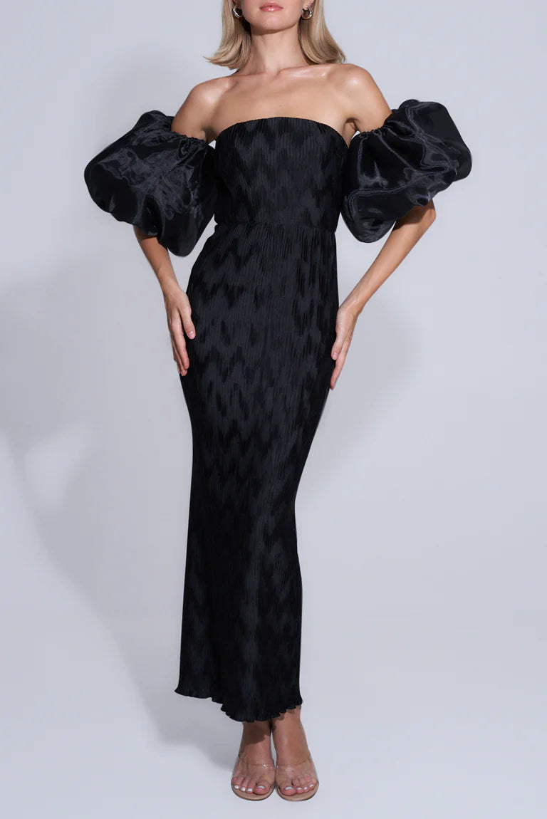 The Affaire Organza Sleeves Dress exudes timeless glamour and sophistication. Its strapless design accentuates the décolletage, while the organza sleeves and silhouette gracefully elongate the body. Crafted with exclusive chevron pleats, it embraces the female form from torso to hem, creating a flattering and figure-hugging silhouette that epitomizes classic elegance.