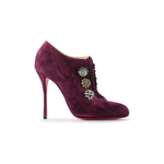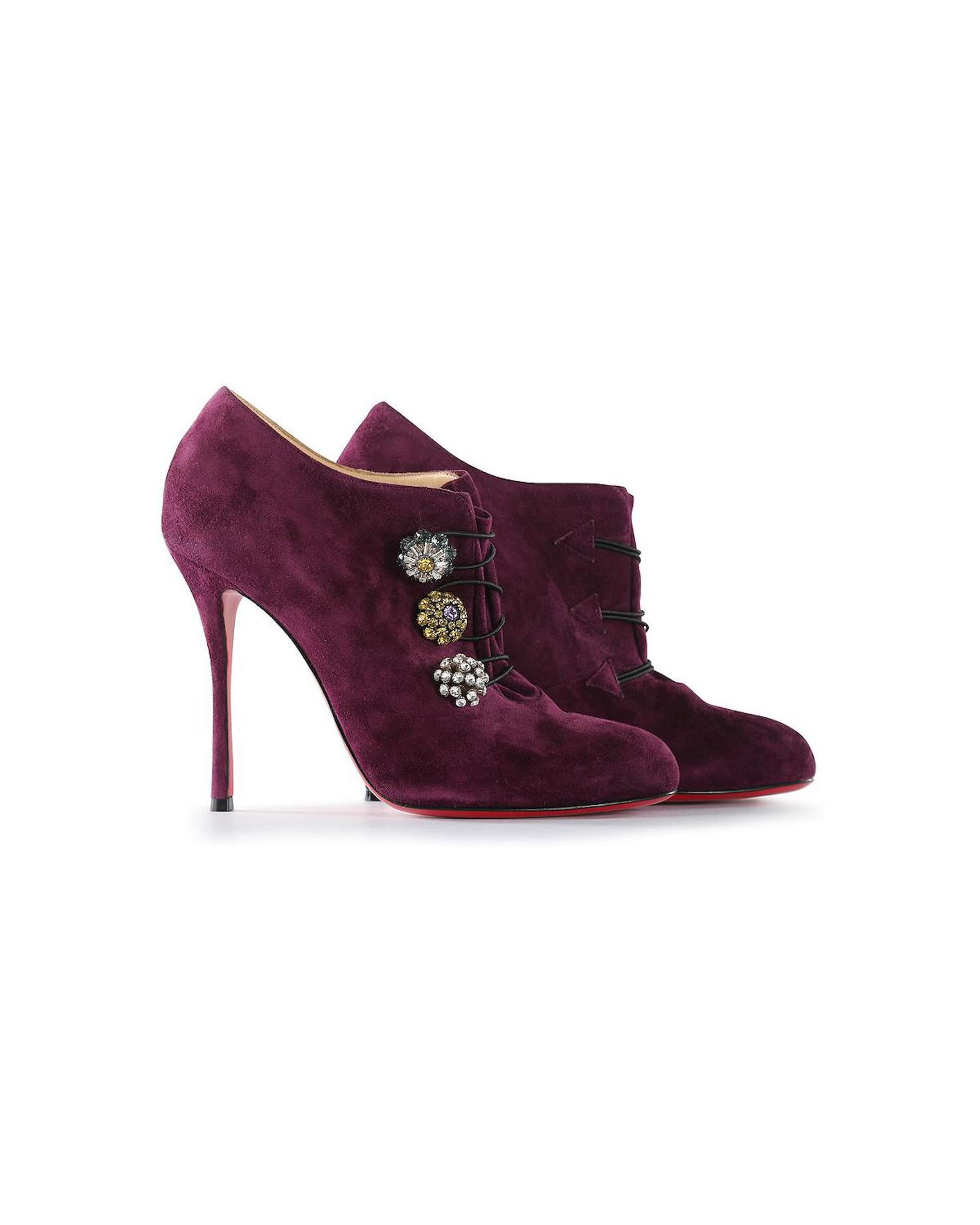 These Christian Louboutin ankle boots are crafted from purple suede. They feature round toes, three floral crystal button details with laces at the vamps, Stiletto heels, beige leather insoles, and the signature red leather soles. The ankle boots are in very good condition, yet the suede is slightly brushed.