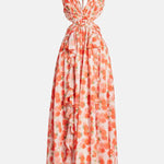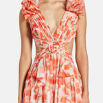 ALB London's Cassini Flutter Sleeve Cut Out Ruffle Lace Back Maxi Dress in Orange is pure wanderlust. Ruffled flutter sleeves and waist cutouts draw in the silhouette while a circular buckle and lace up back whisper bespoke charm.