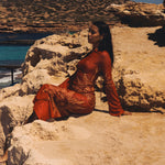 Featuring a a bold open back with tie fastening and luxury gold charm details, flared sleeve and in our signature mermaid maxi shape all perfectly completed with our Celeste print on the color of the season.