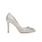 Cher II is the fearless sister of our beautiful flat, Ronda, with a 3 inch heel, and a crystal-embellished ornamental frame at its bold, pointed toe. This sparkling ivory shoe makes the perfect bridal stiletto.