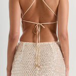 Designed to make every entrance unforgettable. The Quartz top in Champagne is crafted from our signature embellished fabric, intricately adorned with sequins and beads that catch the light from every angle. Featuring an open back with adjustable multiway straps, it offers a custom fit and effortless drape. Available in two finishes — satin lined for added coverage or mesh lined for a semi-sheer effect — it’s the ultimate party statement piece.