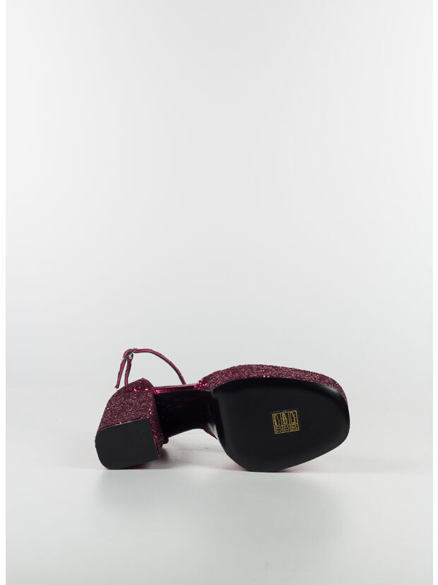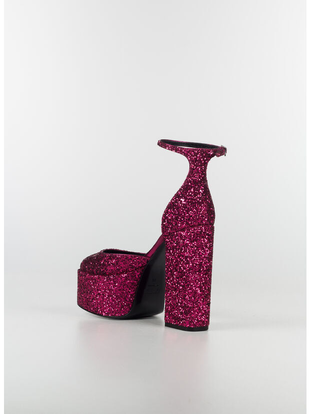 This on-trend model features a high platform, a 13 cm chunky heel, and a slimming ankle strap, entirely covered in sparkling fuchsia glitter. Made in Italy