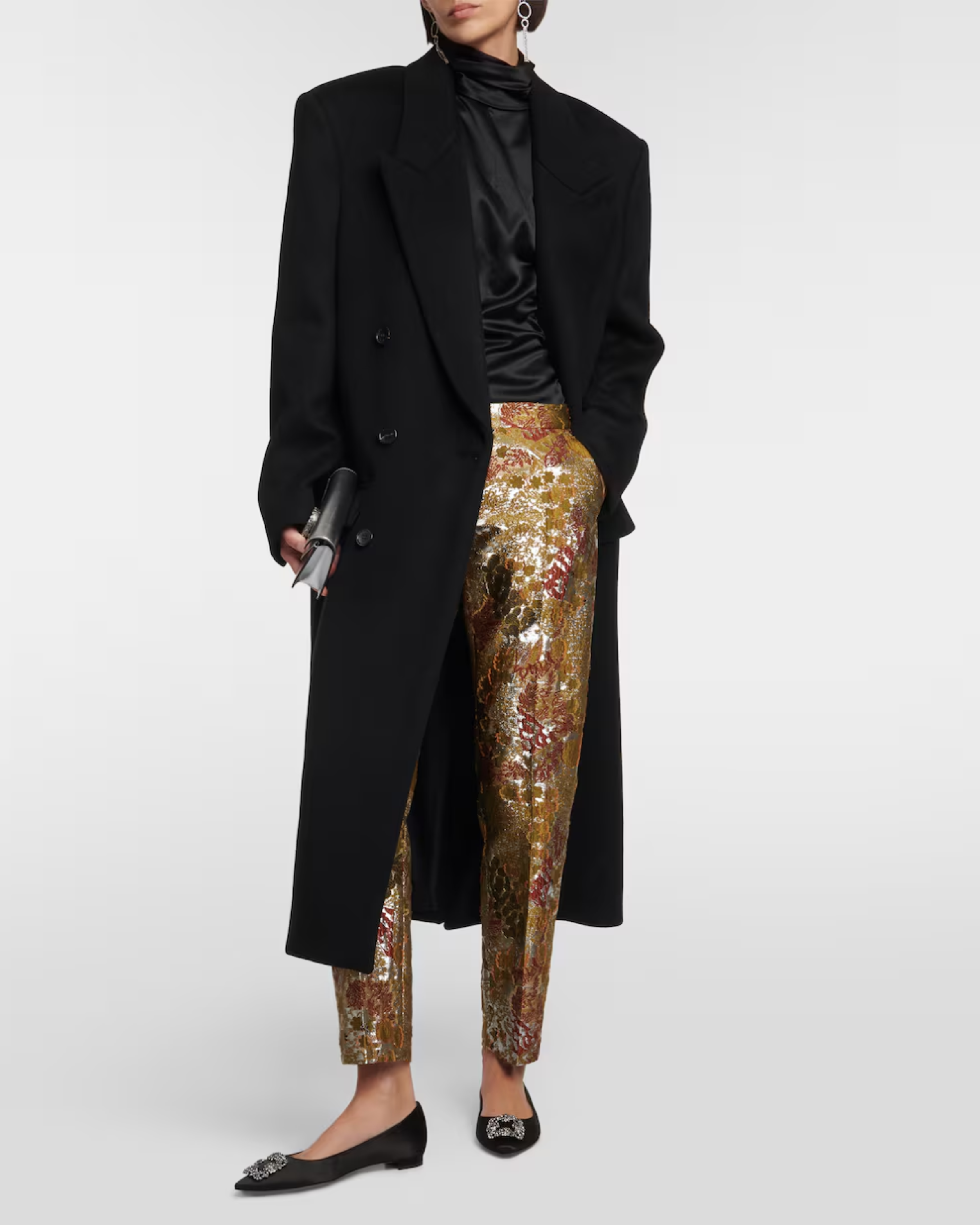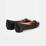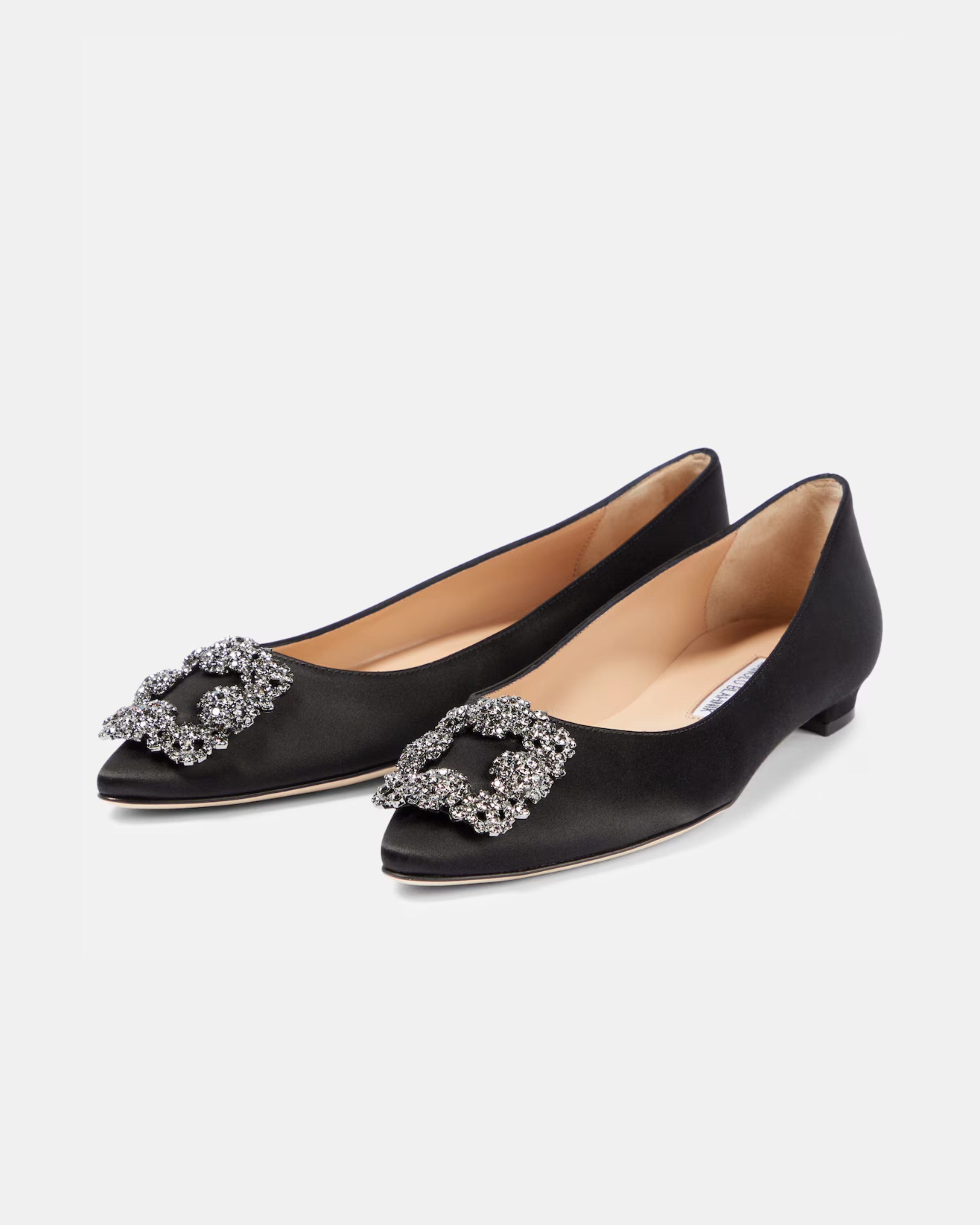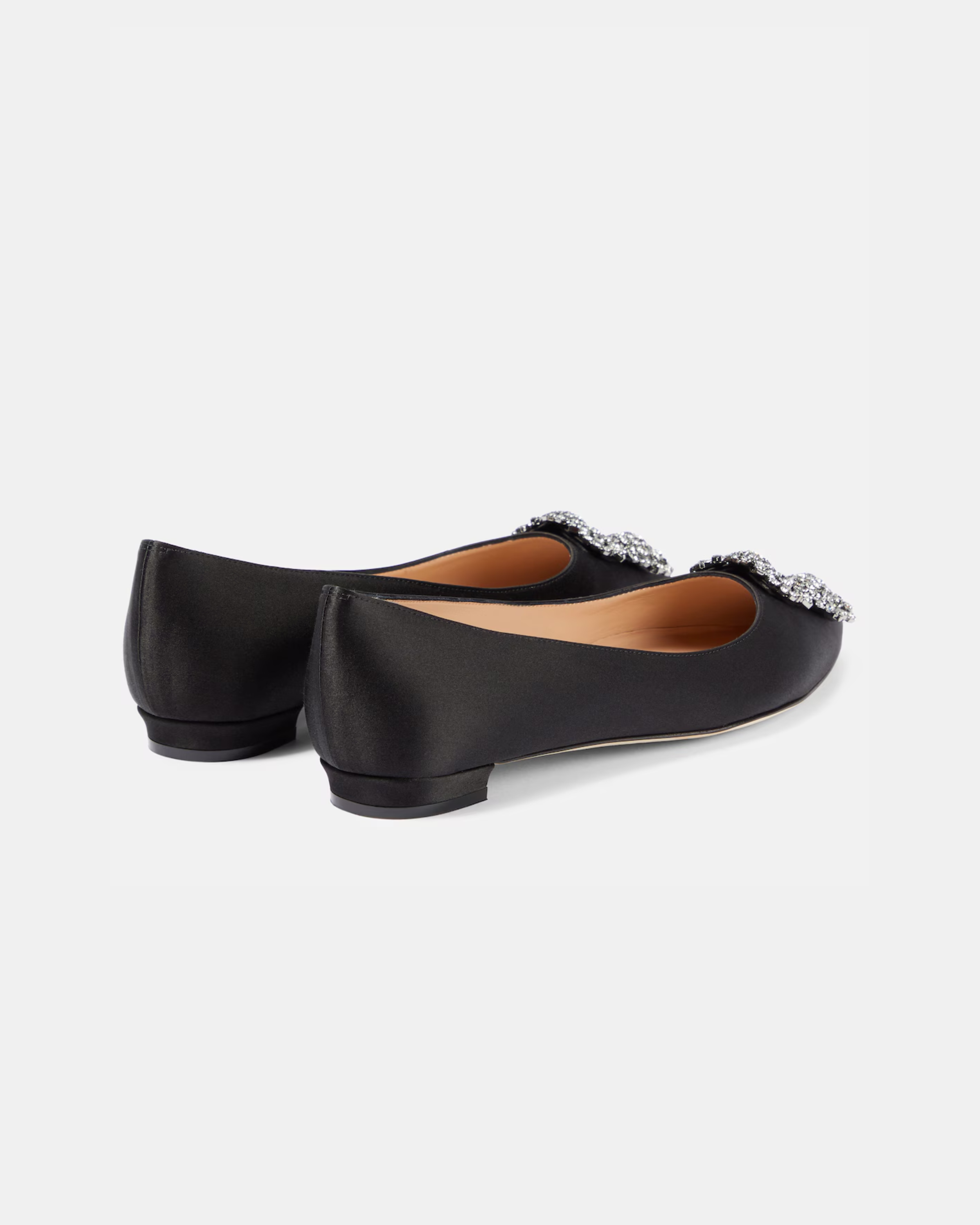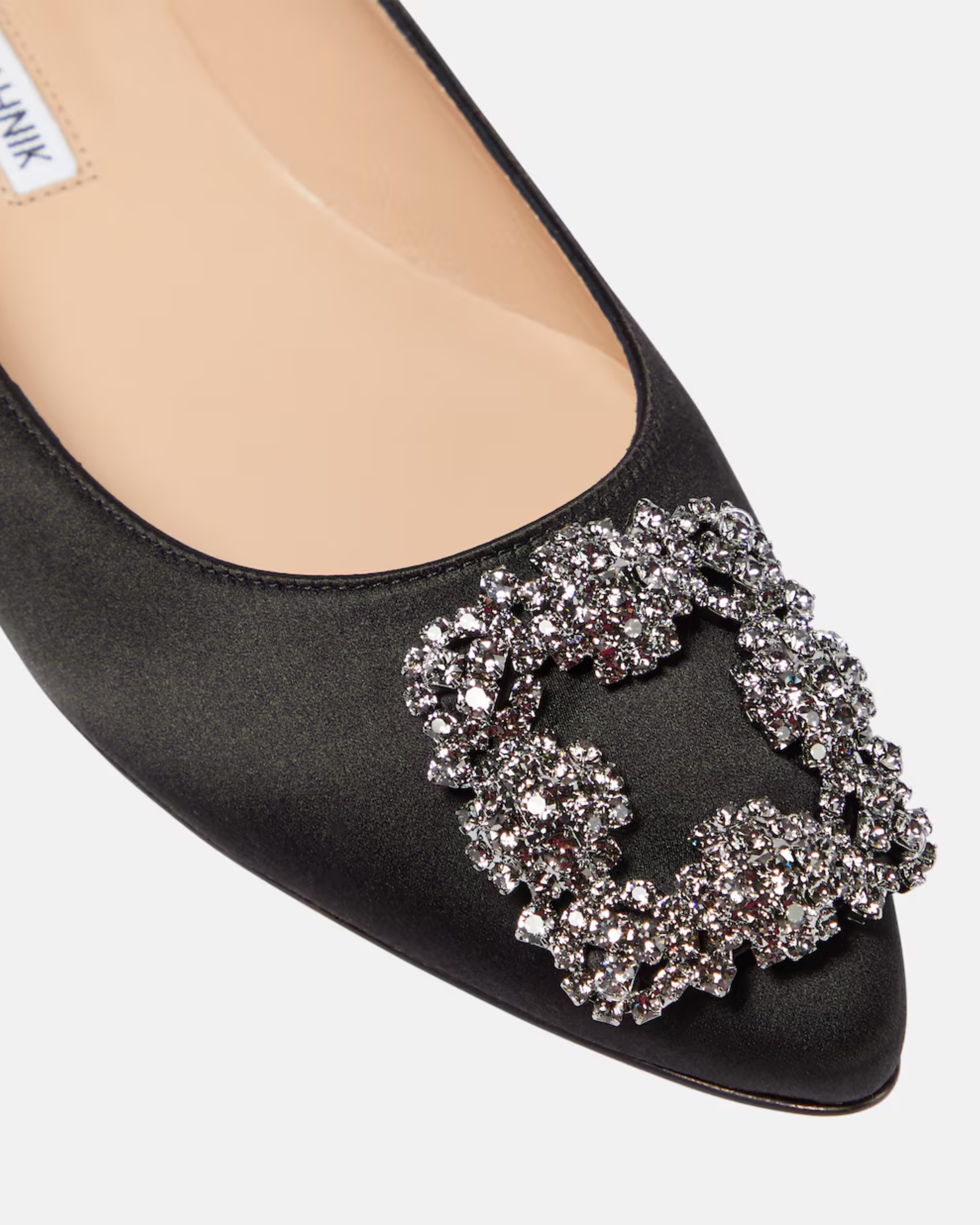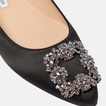 Manolo Blahnik's series of jewel-buckled shoes exemplifies the designer's penchant for sparkling accessories. The Hangisflat ballet flats are handcrafted in Italy with black satin uppers, almond-shaped toes, and purple crystal embellishments.