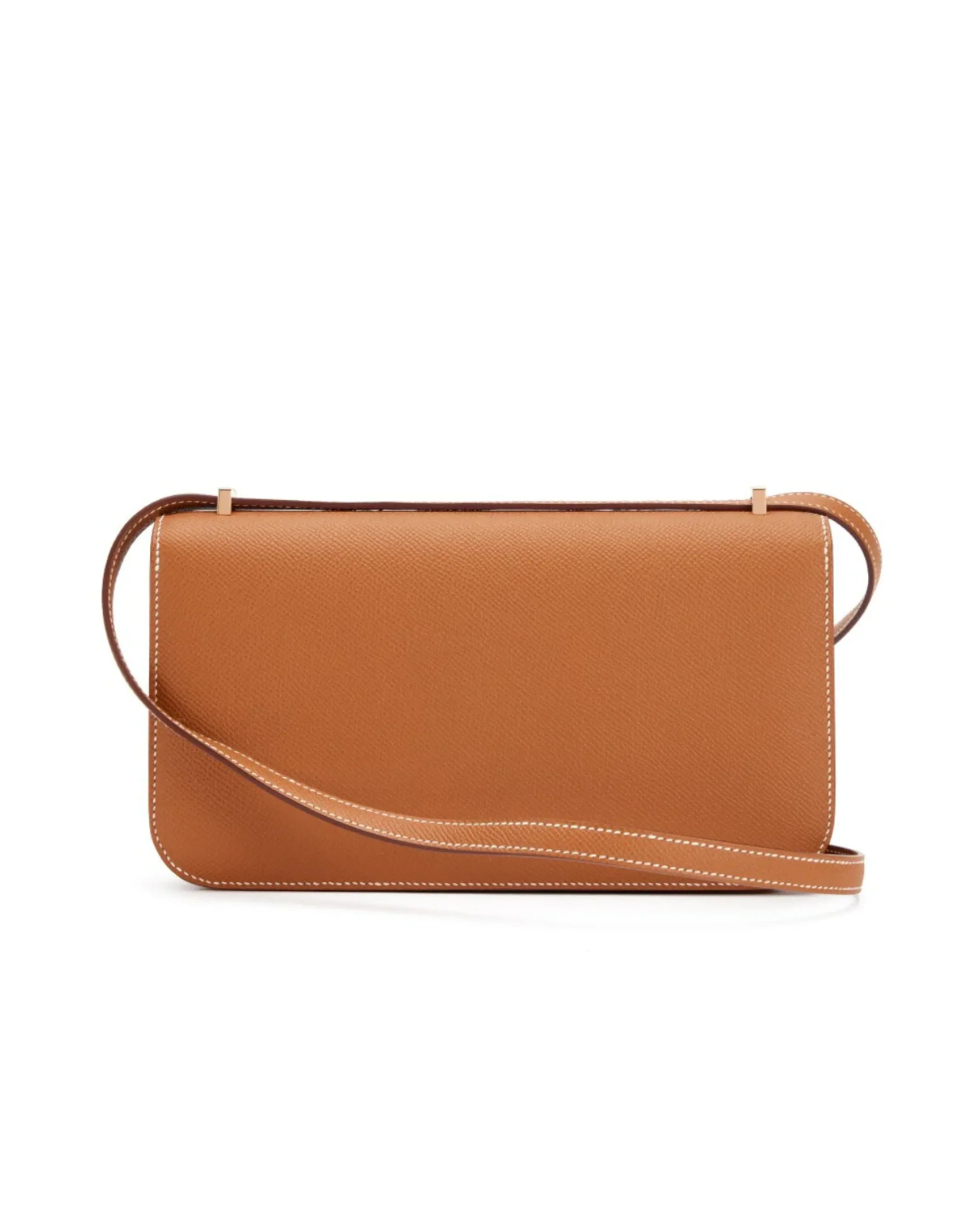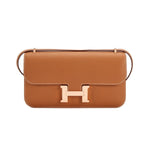 The bag features the distinctive gold-tone "H" clasp, a hallmark of the Constance line, and contrast white saddle stitching, highlighting the craftsmanship Hermes is renowned for. The elongated silhouette of the Constance Elan provides a sleek profile with ample interior space, ideal for both day and evening use.