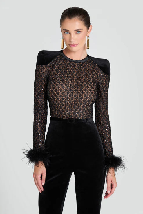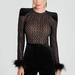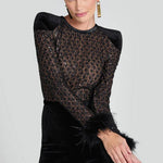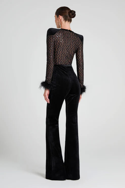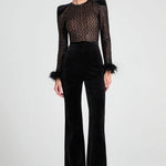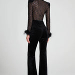 Meet Monique, our long-sleeve black velvet jumpsuit, and your next forever piece. This blend of delicate lace and plush velvet is designed to make you feel as alluring as you look. The jumpsuit has a nude lining, which provides coverage while accentuating the intricate lace detailing. The feather trim at the cuffs and contrast black belt add dramatic flair to this chic piece. This style looks equally as good paired with or without the belt.