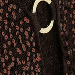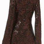 A sheer brown knit dress embellished with sequins and finished with a gold-tone ring detail at the plunging neckline. Designed unlined for a lightweight drape and crafted in a rayon blend with subtle shimmer.