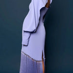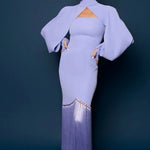 A statement gown by Nour Abdul, designed in soft lilac with sculptural cape sleeves and a sleek column silhouette. The high neckline is balanced with a subtle front cut-out, while the fitted bodice flows into a floor-length skirt finished with cascading fringe and side cutout detail. Elegant yet bold, it’s a piece made for standout moments.