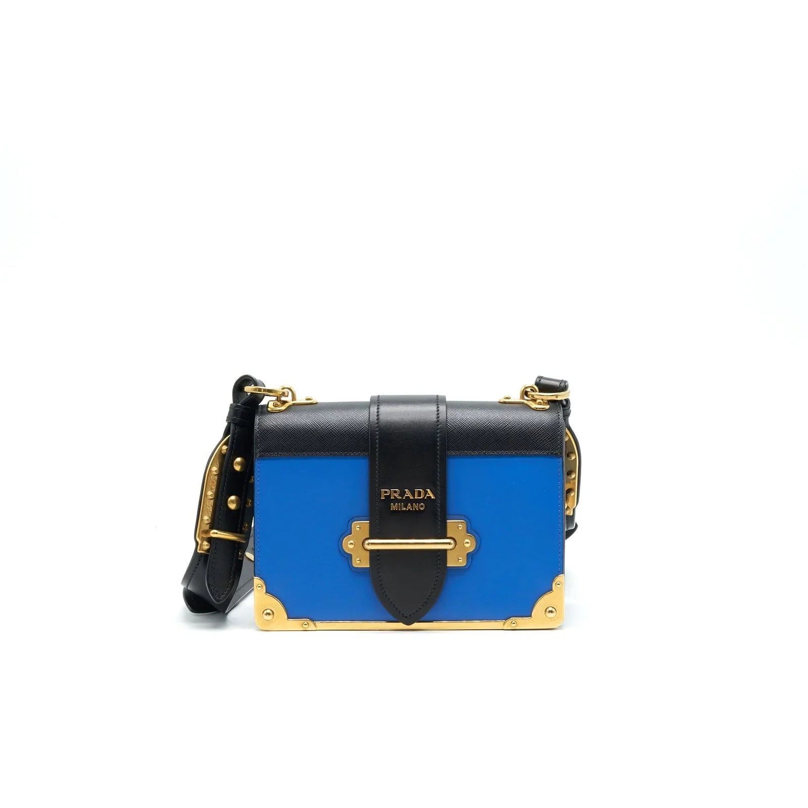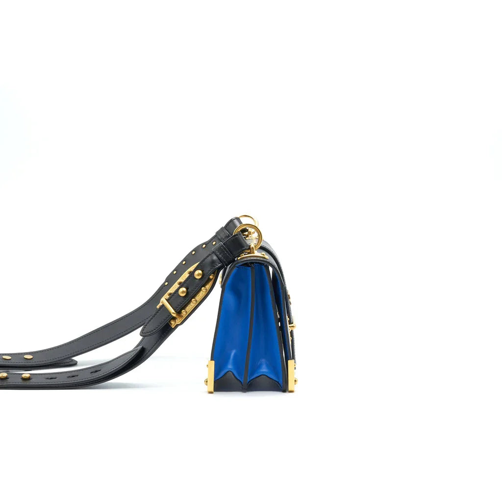 Crafted from premium calfskin leather, the bag features antiqued gold-tone metal hardware, reminiscent of historical book bindings, giving it a refined, old-world charm. The detachable, adjustable 105 cm leather shoulder strap allows for multiple carrying options, making it perfect as a shoulder or cross-body bag. The flap closure with a strap and metal loop secures your essentials, while the leather-lined interior with two pockets, one with a flap, ensures practical organization. The metal lettering Prada logo on the strap completes the look with a signature branding touch.