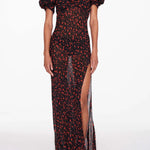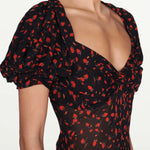 The Magnolia Maxi Dress captures Rat & Boa’s signature mix of bold prints and feminine silhouettes. Crafted from semi-sheer viscose georgette in a vibrant red floral print, it features a fitted shape with a romantic sweetheart neckline, short puff sleeves, and a thigh-high slit for a touch of allure.