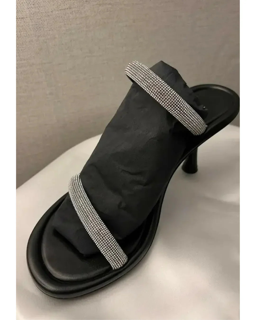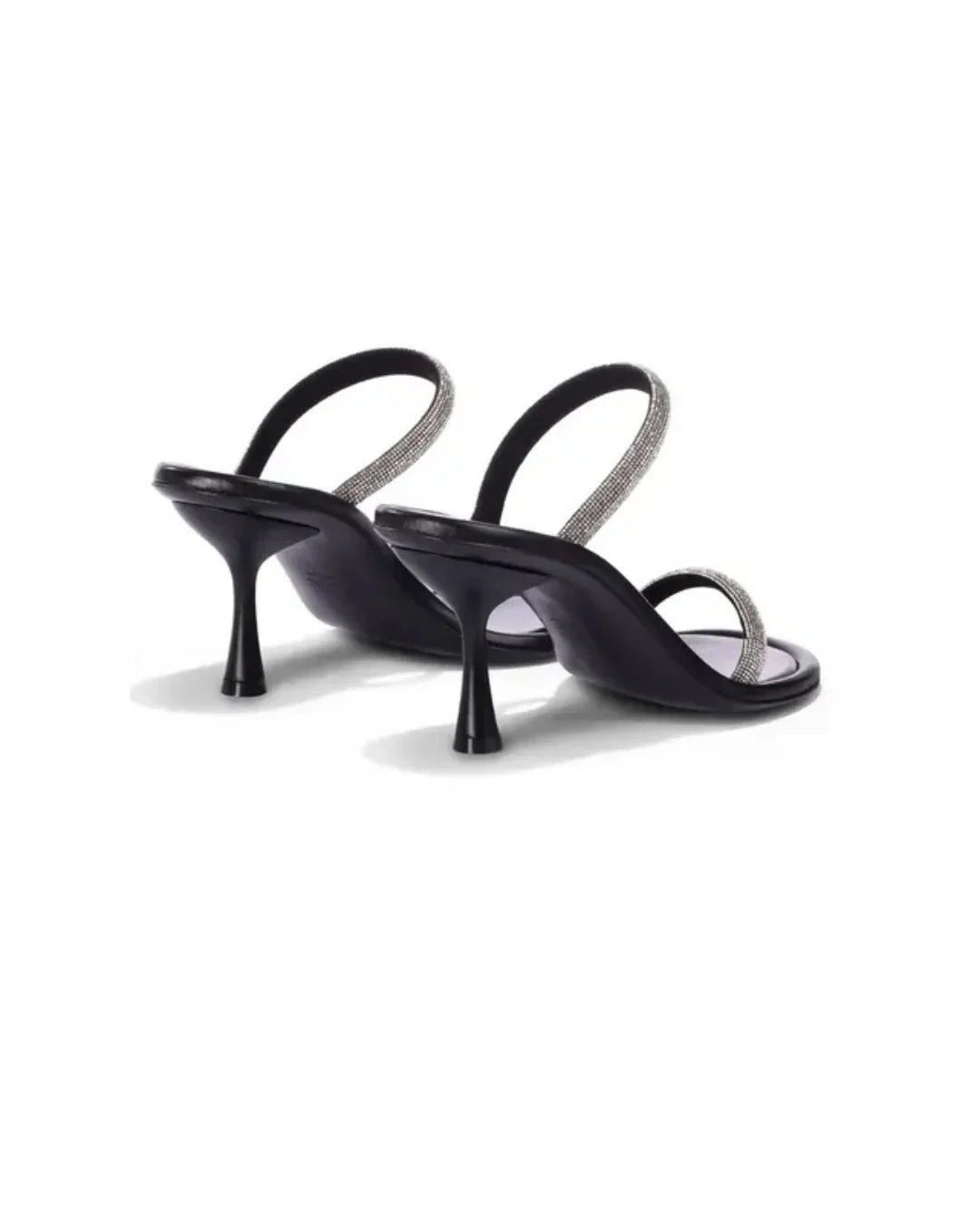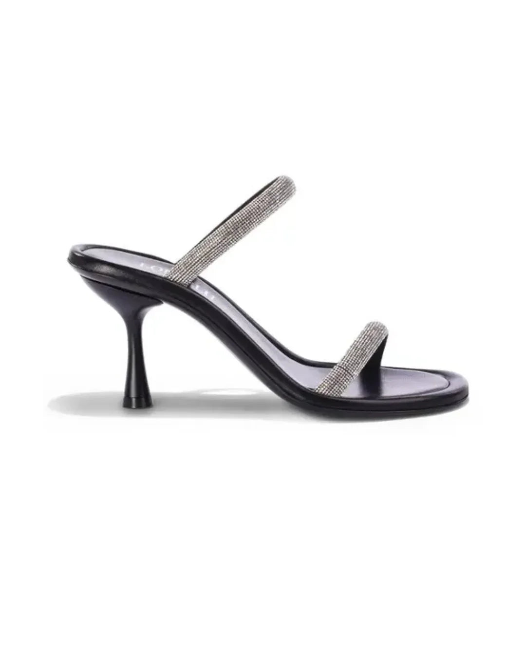 This elegant sandal by Loriblu is crafted from soft black nappa leather and features two slim straps embellished with sparkling rhinestones. The open-toe design and flared stiletto heel add a modern, feminine touch, making it perfect for evening events or special occasions. Combining Italian craftsmanship with refined glamour, it's a chic choice for dressing up any look.