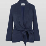 In classic navy, this oh-so-elegant jacket perfectly balances louche with pulled together. Flared sleeves, draped lapels and a cinching waist tie are signature R&B notes.