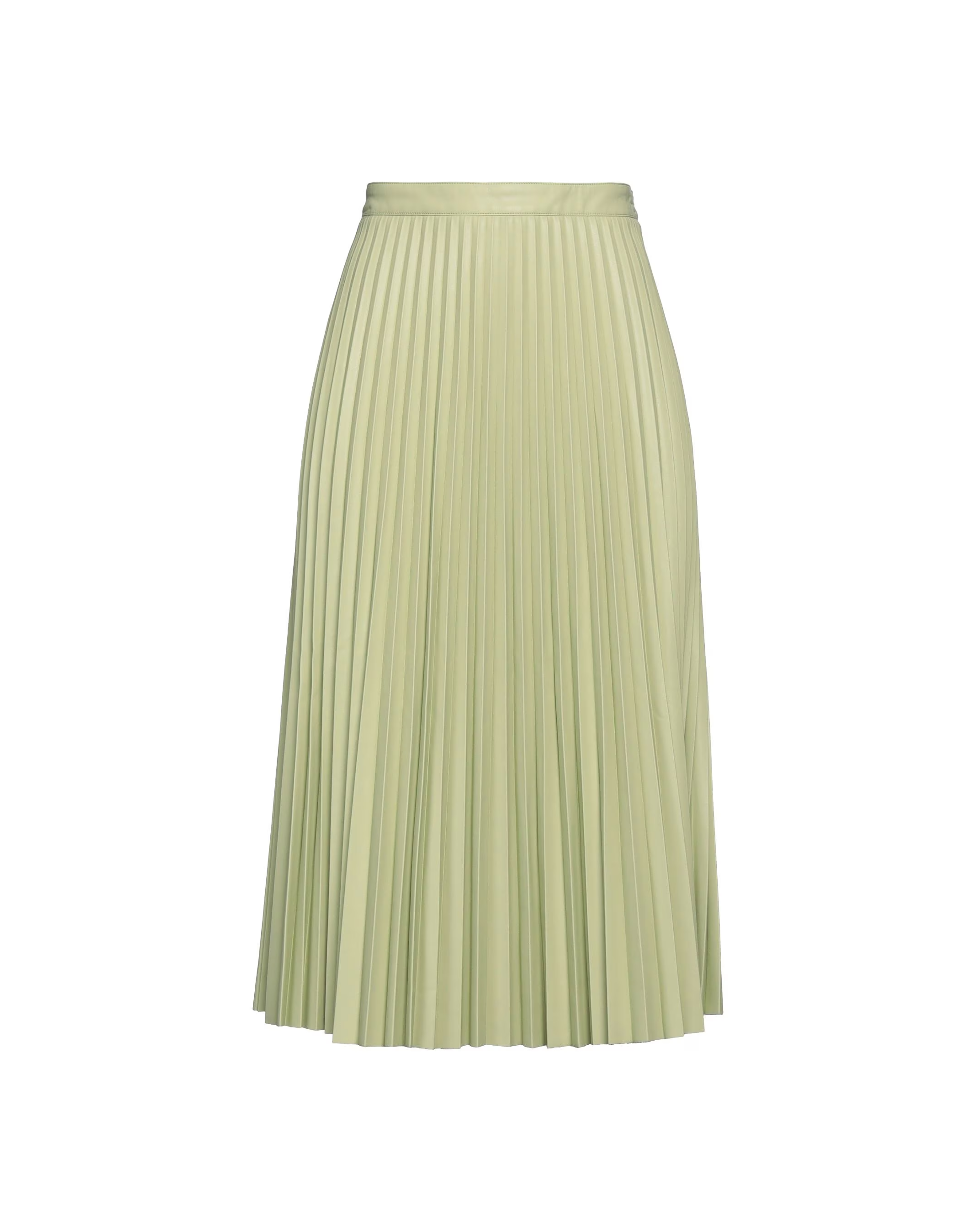 The Proenza Schouler midi skirt, notable for its light green color and pleated design, is completed with a side zipper detail.