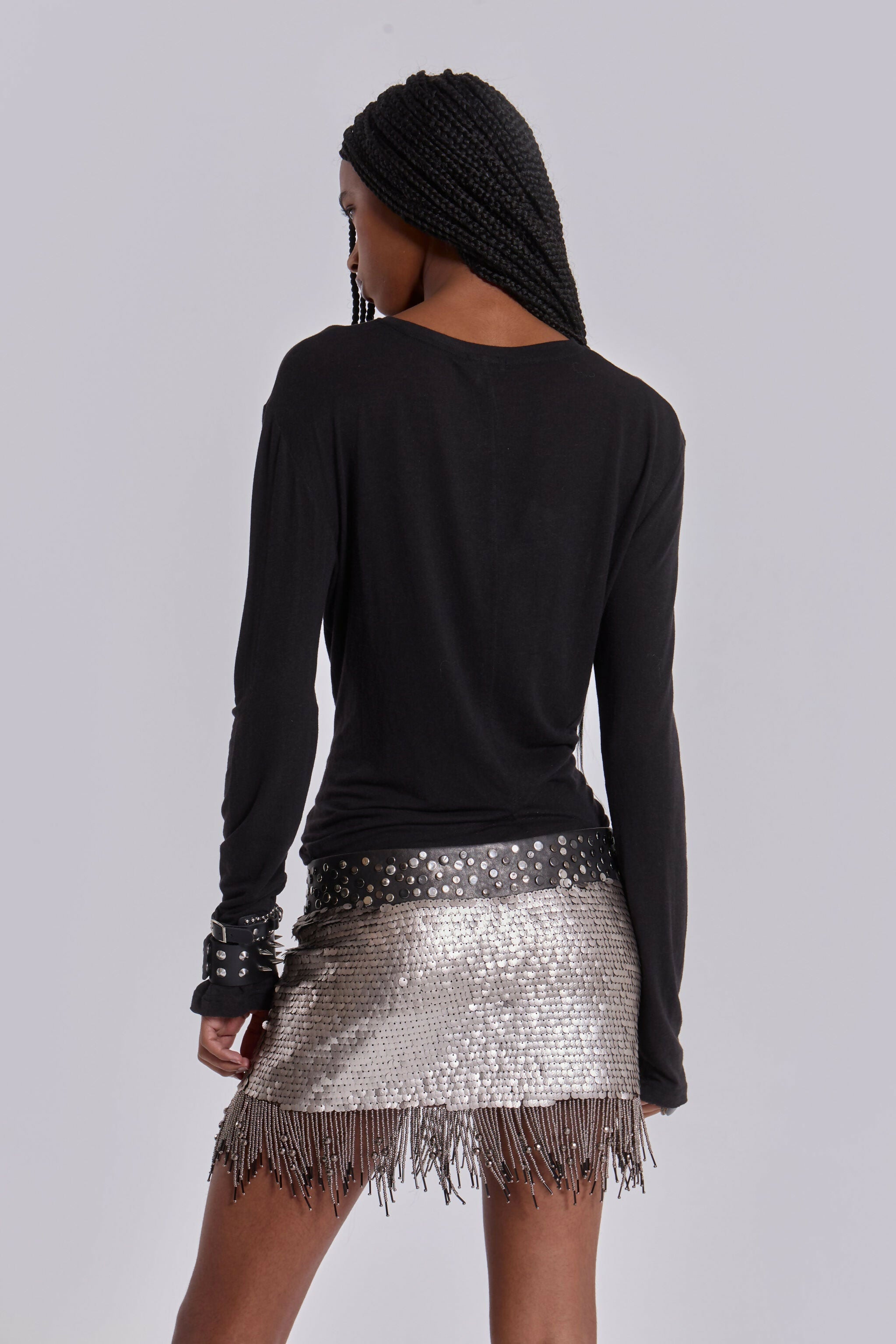 This Sequin Fringe Skirt is a glamorous addition to your wardrobe, featuring a striking matte silver sequin fabric that catches the light beautifully. The concealed side zip fastening ensures a seamless fit, while the faux leather waistband adorned with mixed silver studs adds an edgy touch. The staggered gunmetal bead trim at the hem enhances its stylish flair. With its mini length, this skirt is perfect for making a bold statement at any event or night out.