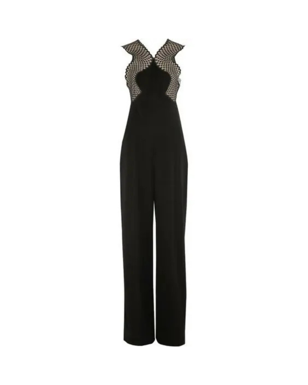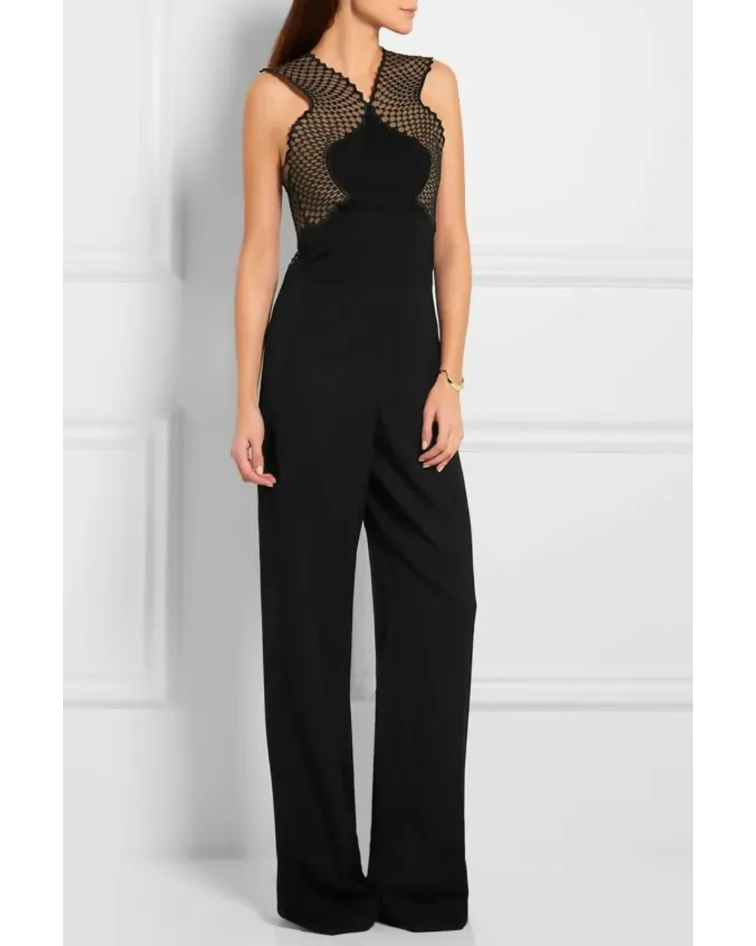 The Stella McCartney "Alexandrine" Mesh Catsuit is a sophisticated and modern all-in-one piece that seamlessly blends elegance with edge. Crafted in sleek black, this catsuit features a form-fitting bodice with an intricate mesh overlay, creating a dramatic contrast against the solid fabric. The scalloped detailing along the neckline and shoulders adds a touch of femininity, while the wide-leg silhouette elongates the figure for a flattering, statuesque look. Perfect for evening events or upscale gatherings, this jumpsuit showcases Stella McCartney's signature aesthetic sharp tailoring with a sustainable, cruelty-free ethos. Designed to be both bold and refined, it can be styled with minimal accessories for maximum impact.