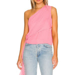 This Krisa one-shoulder top is crafted in lightweight pink chiffon with soft draping that falls elegantly across the body. Designed with an asymmetric neckline and a long, flowing tie detail for subtle movement, it’s an effortless statement piece that elevates denim or tailored separates.