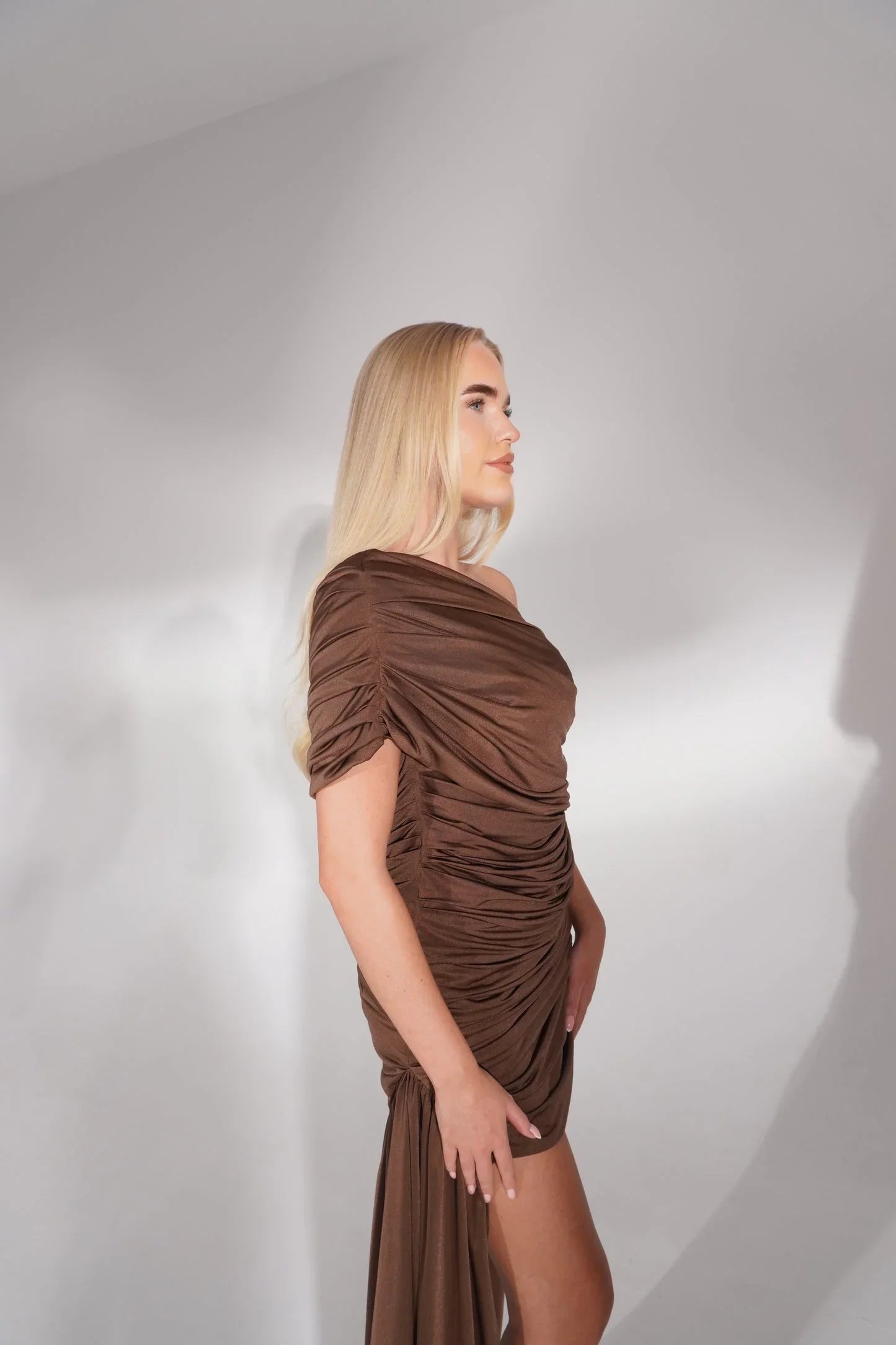 âBlair' a fully ruched mini with a classic one draped shoulder.