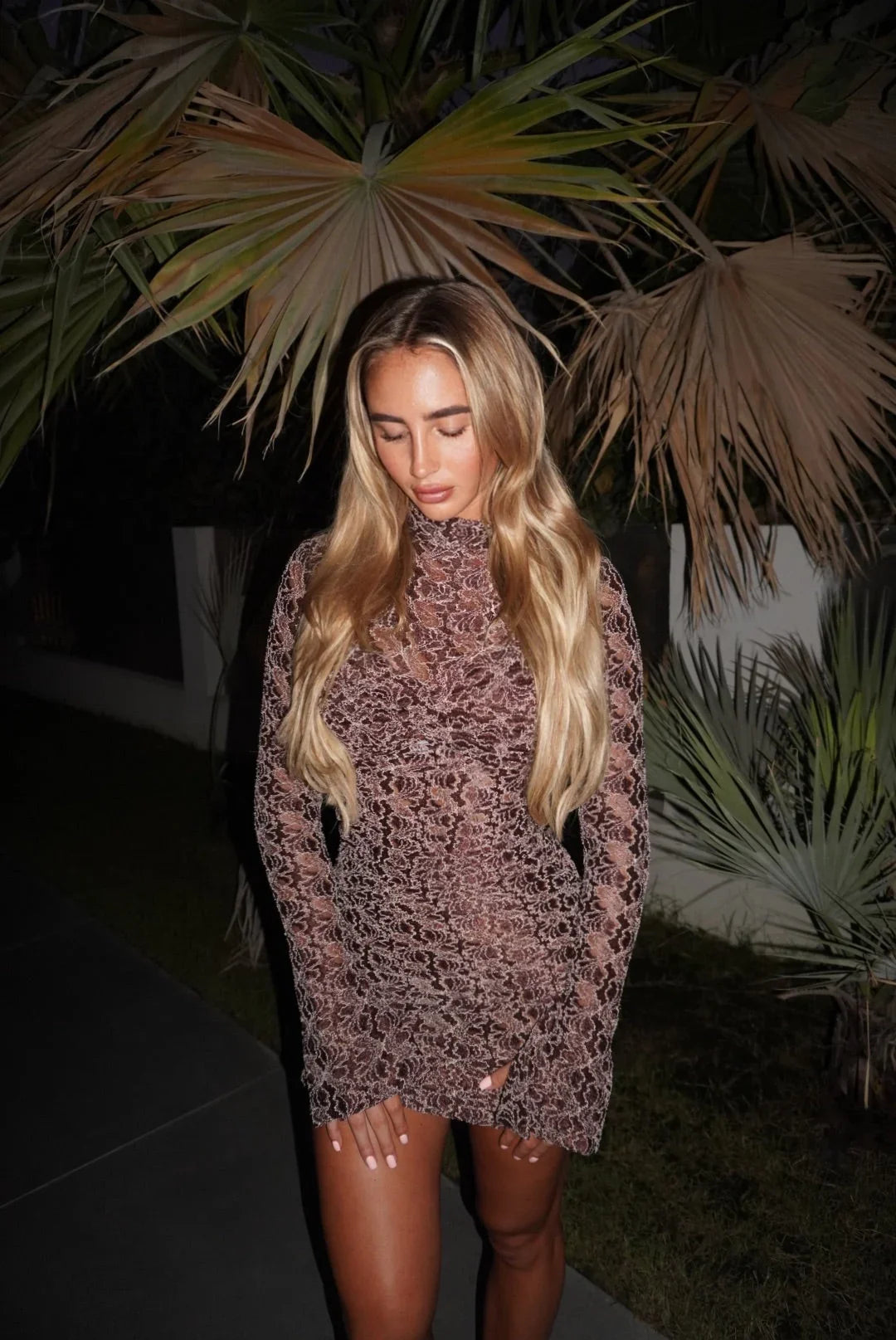 âHarlo' our stretch mini in brown lace featuring slit sleeve and an over bust detailing.