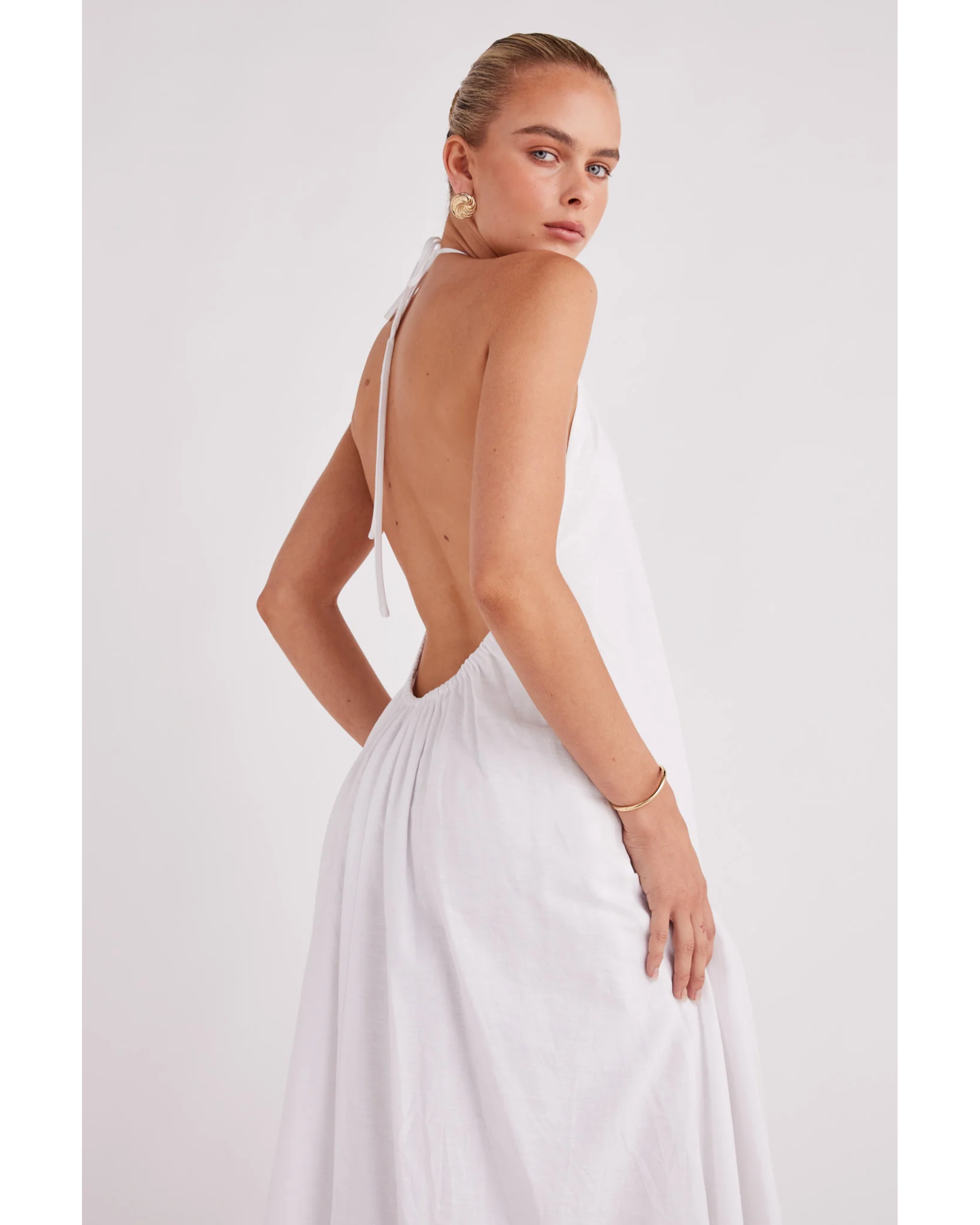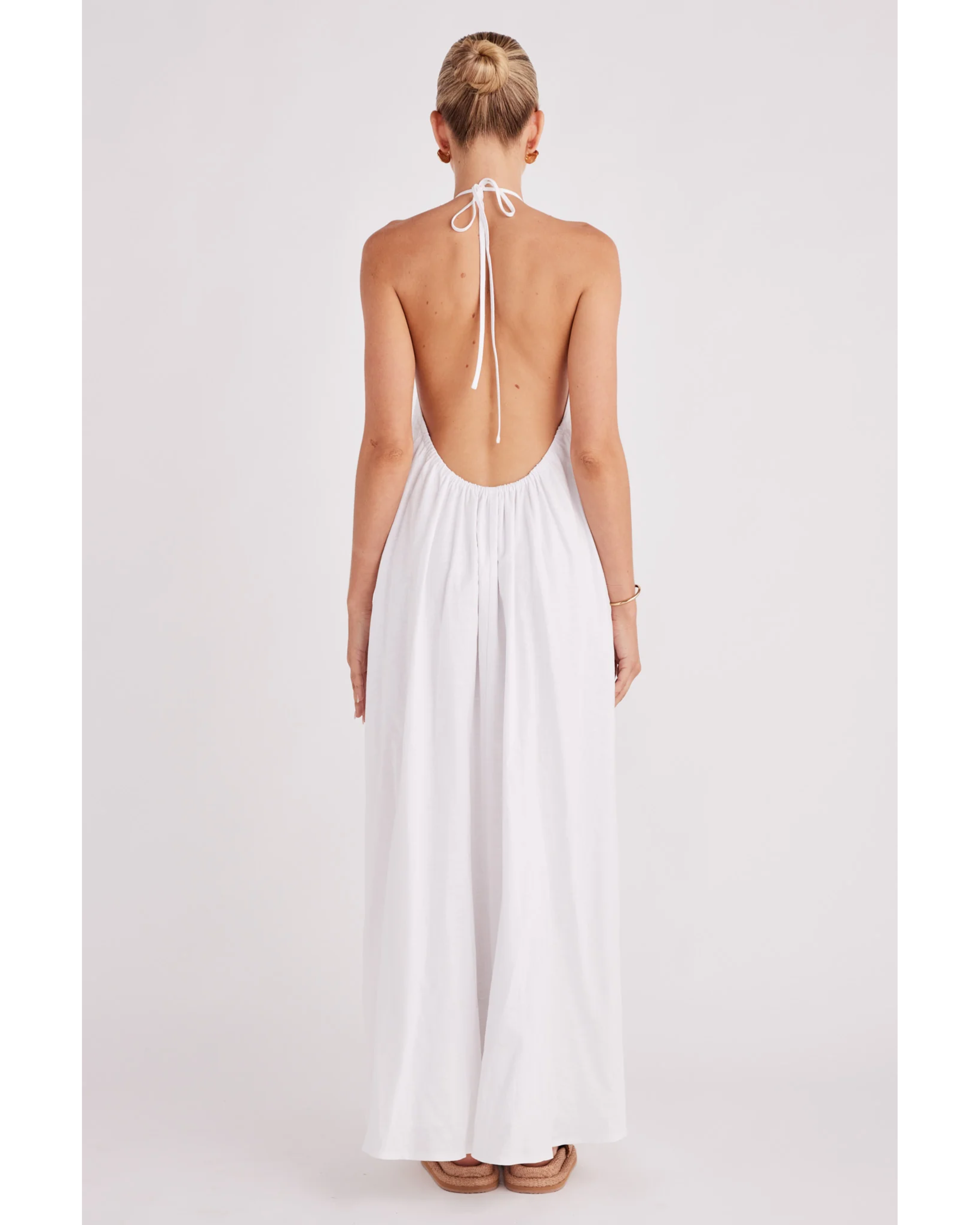 - Maxi length dress with exposed back and elasticated waistline