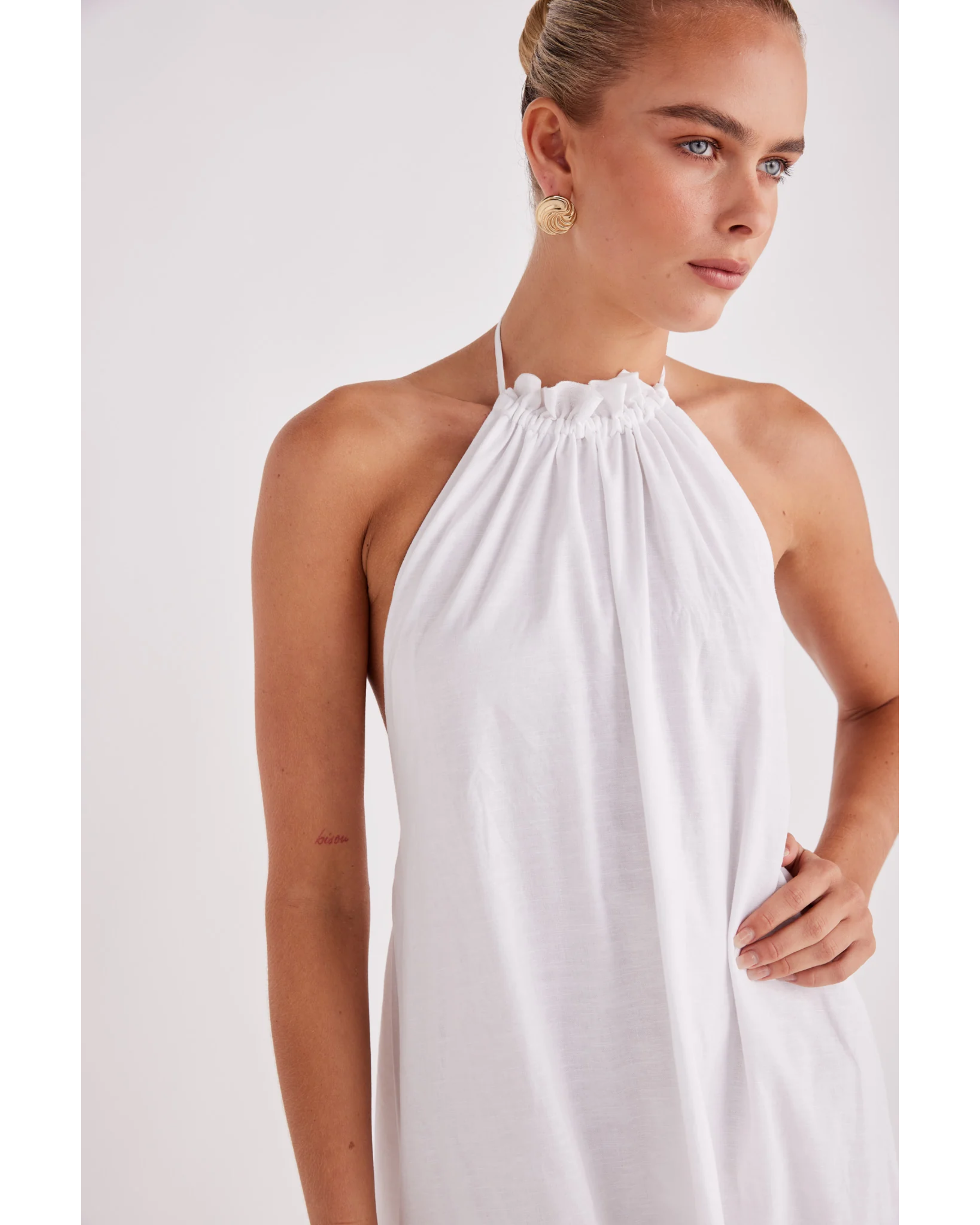 - High neck halter top with drawstring neckline