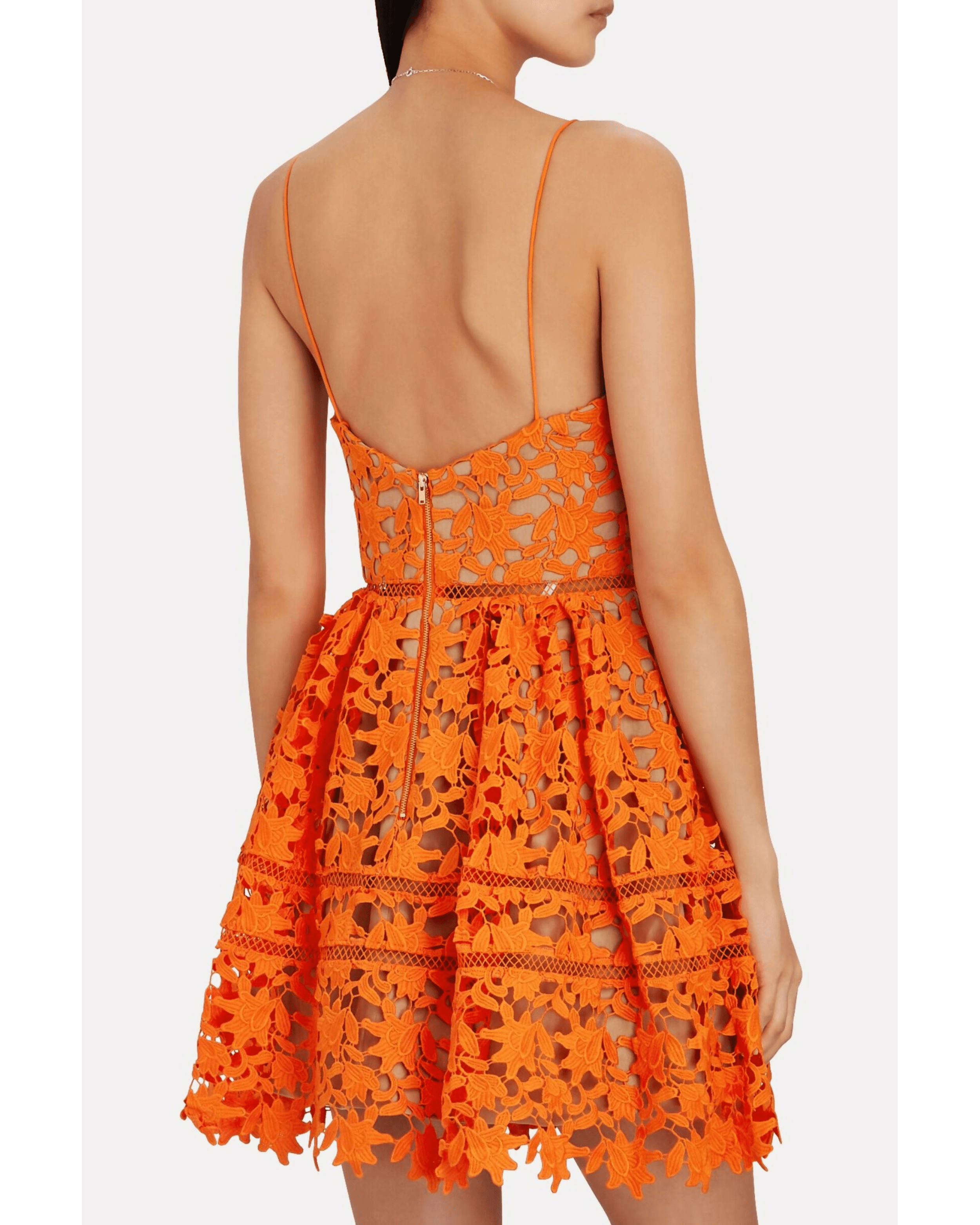 Self-Portrait's orange Azalea dress is crafted from patterned guipure lace as a tribute to its namesake bloom, one of Han Chong's hallmark styles for occasion dressing since his label's launch in 2013. It's shaped for a slim fit with skinny, adjustable shoulder straps and ladder lace that splices the slender bodice, then fitted with a flared mini skirt lined with beige mesh