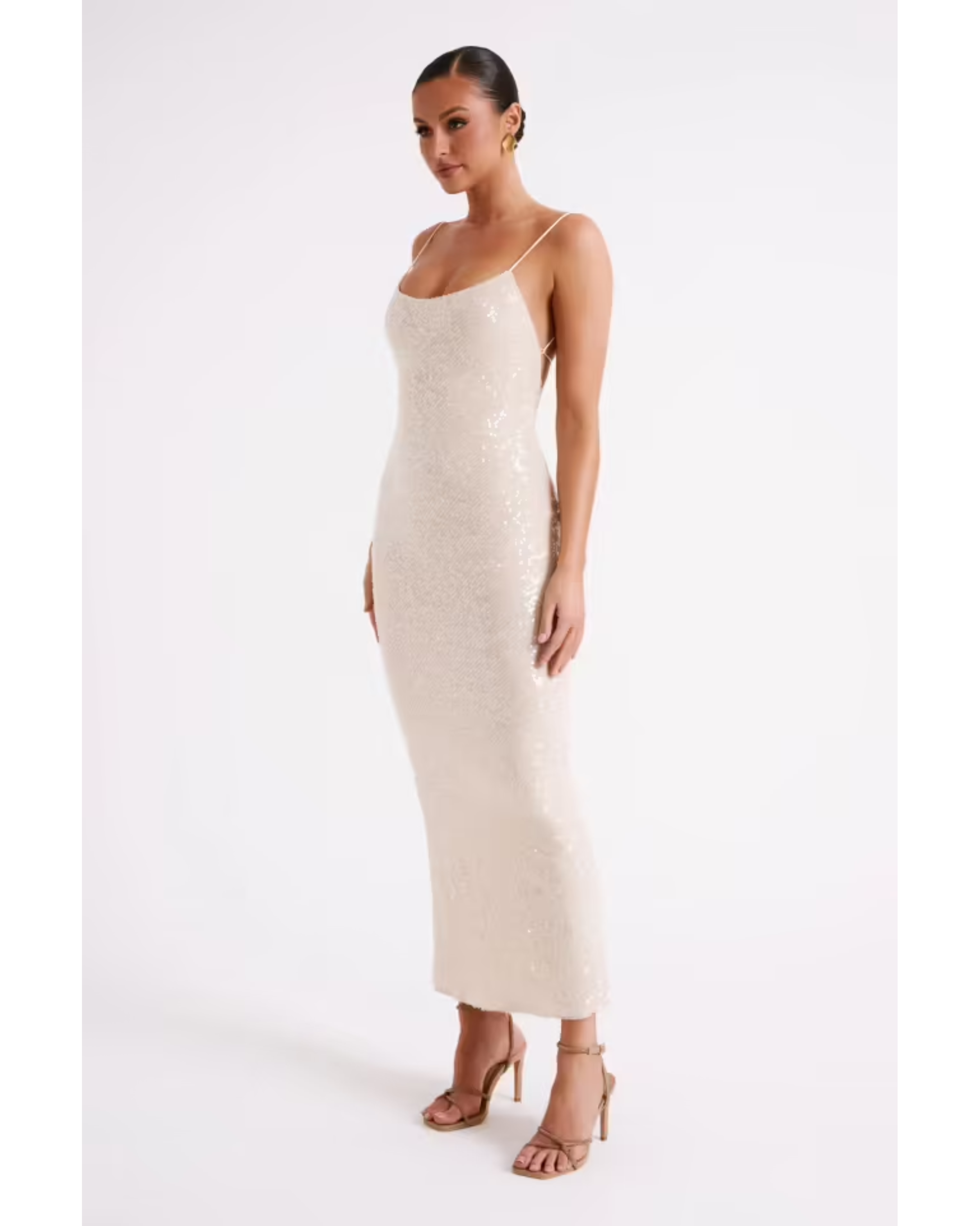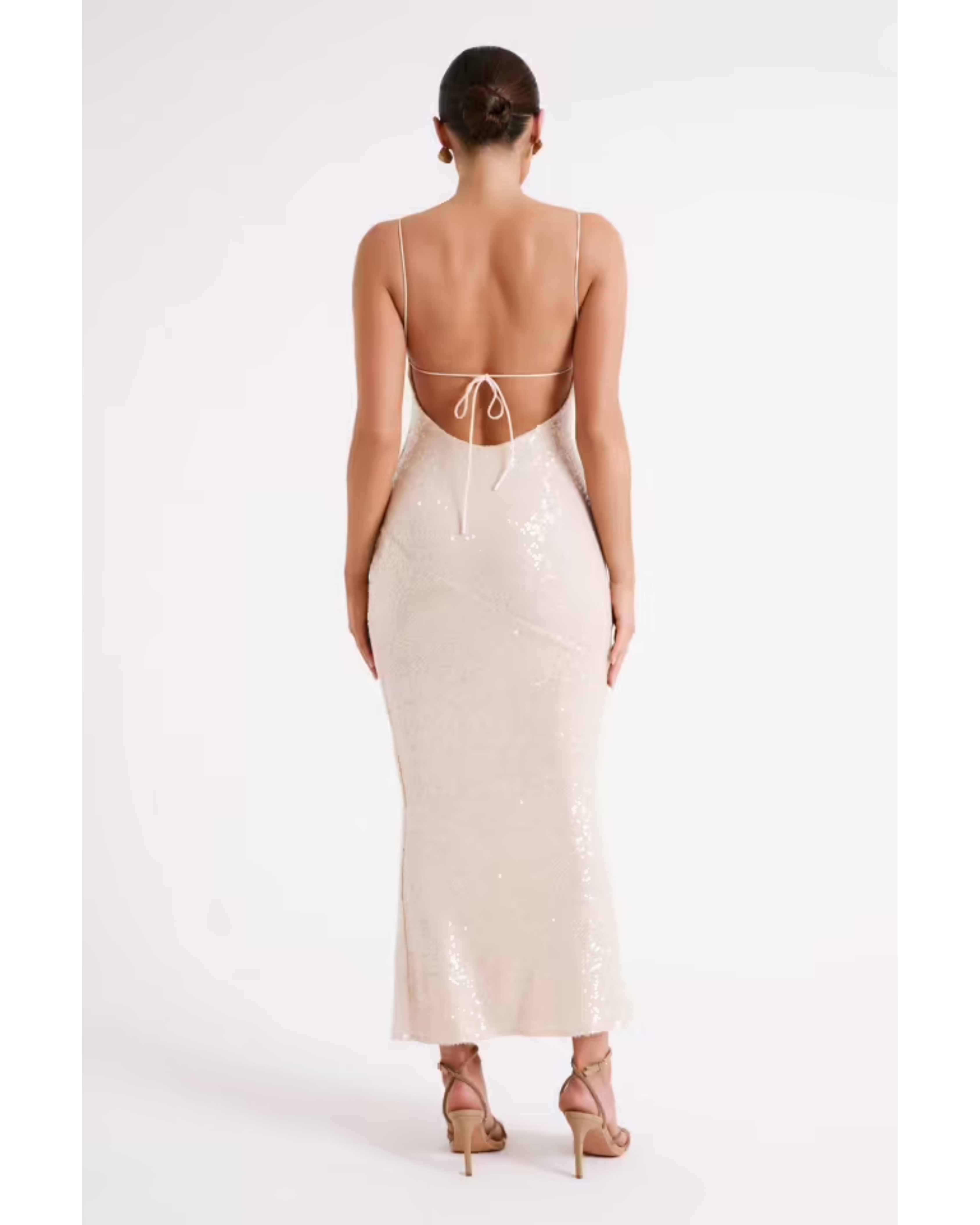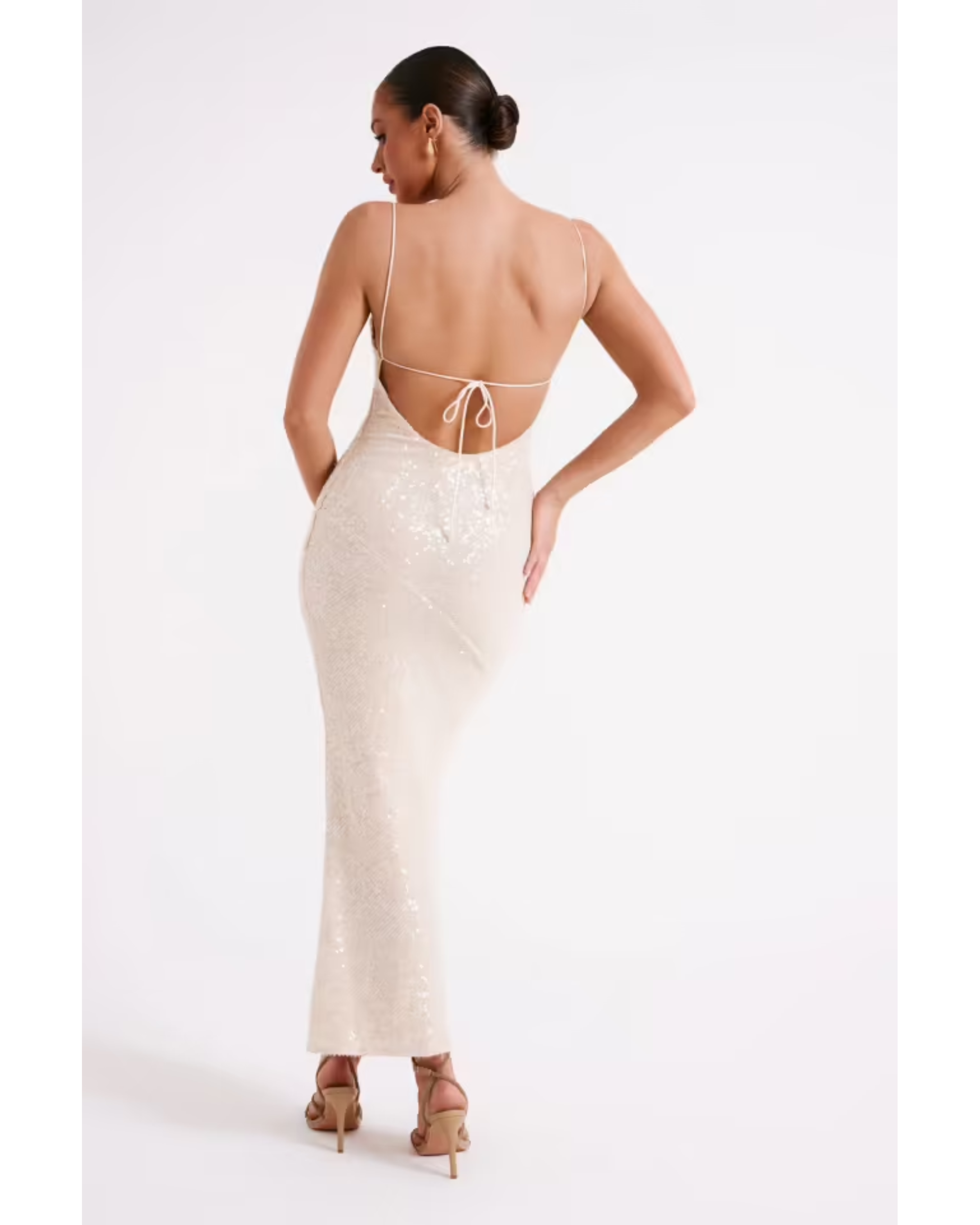High shine.The BRIANNA is a sequinned party dress tailored in a sophisticated maxi silhouette. It is adorned with disk-shaped sequin, cut to perfection for the right amount of shine and shimmer. For a minimalist touch, it is designed with thin straps, adjustable to your desired fit. The open back with tie detail flows down into a fishtail hem.