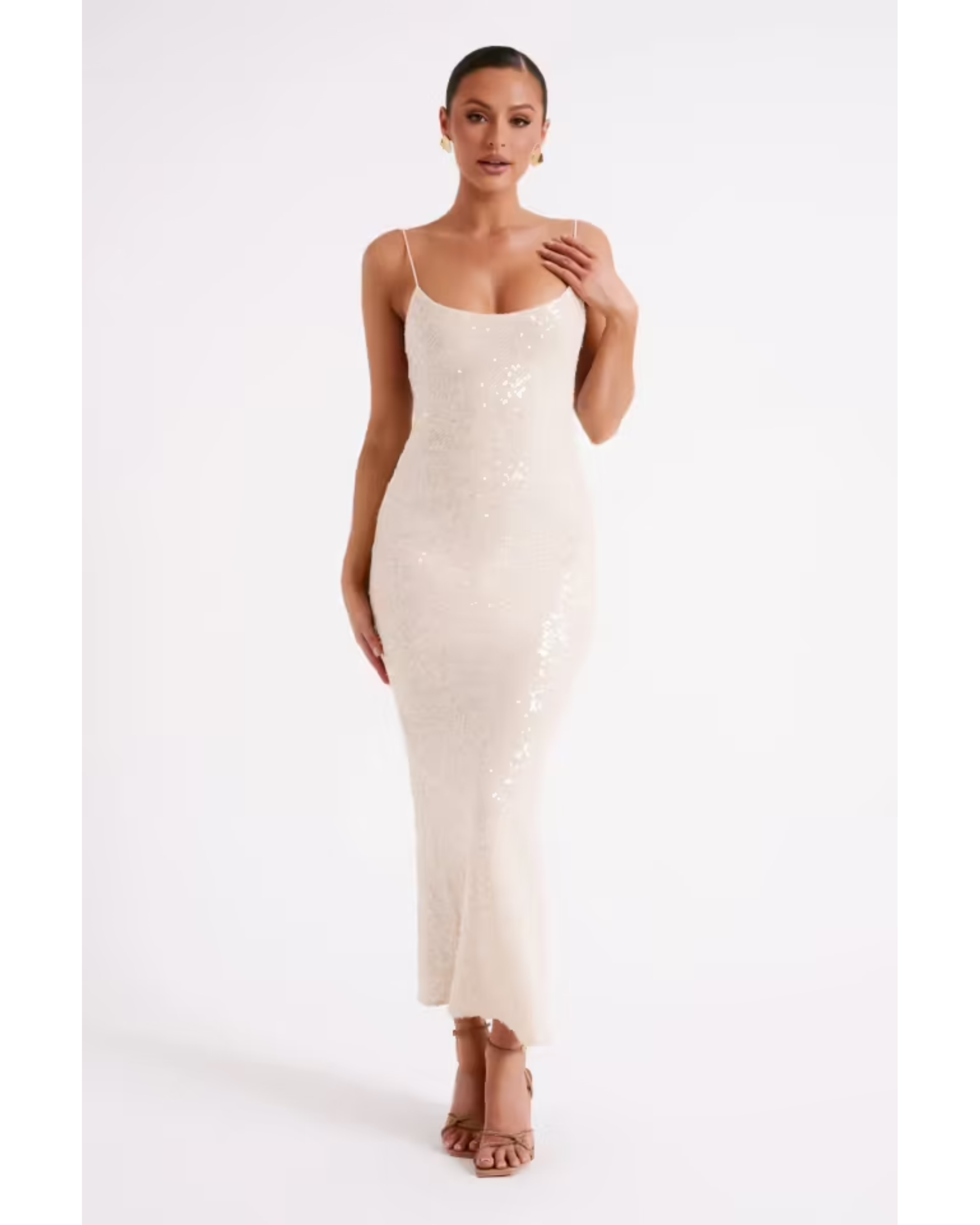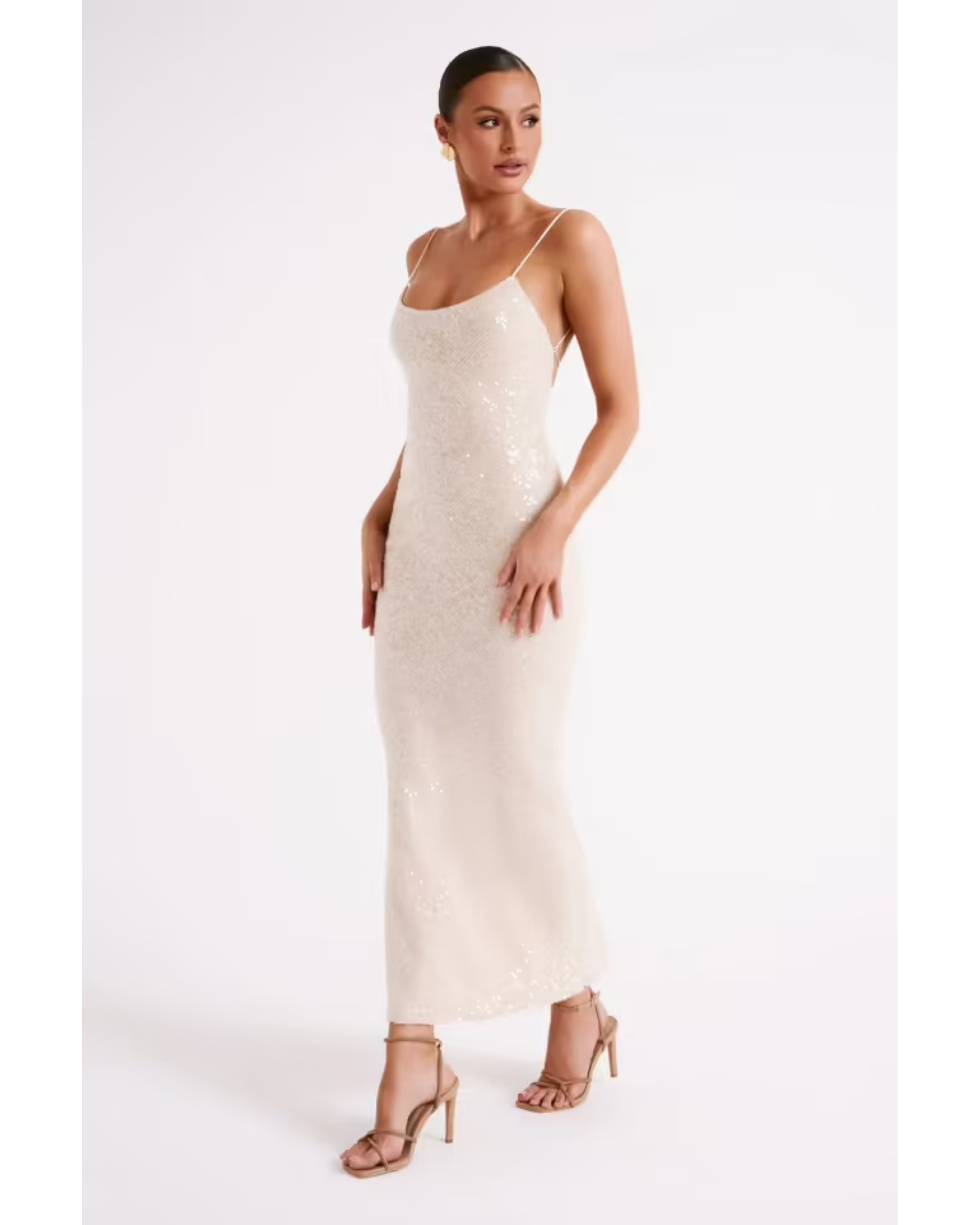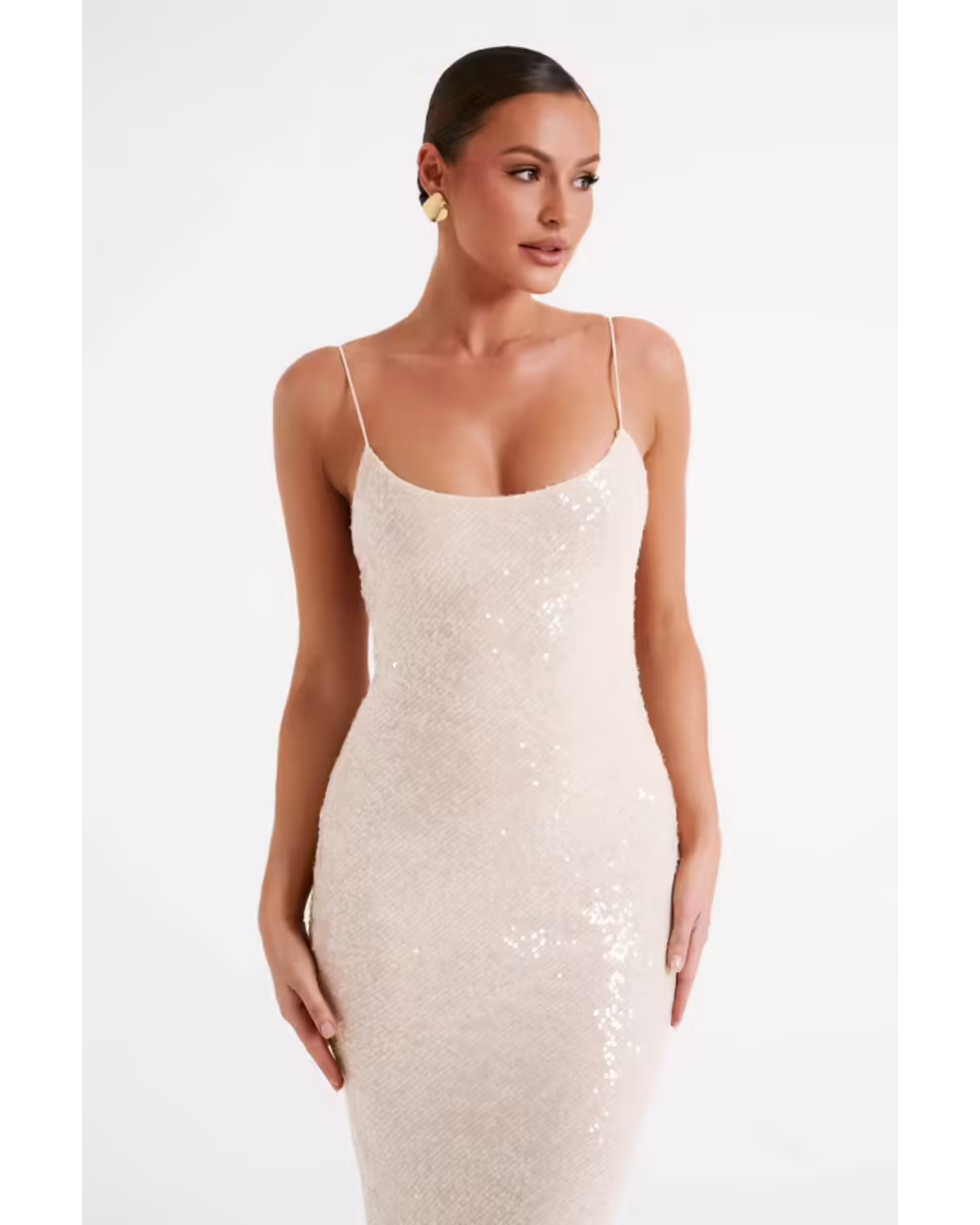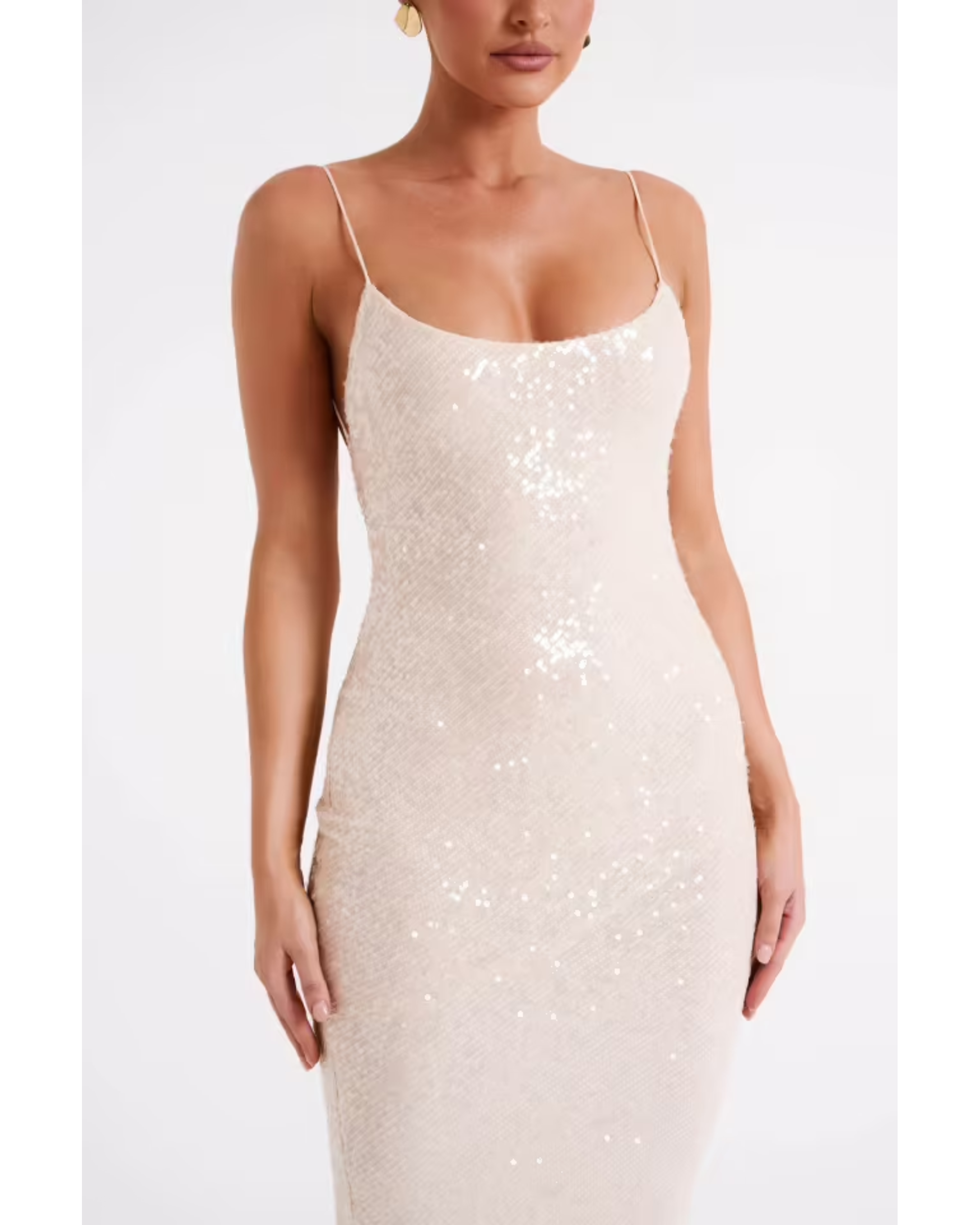 High shine.The BRIANNA is a sequinned party dress tailored in a sophisticated maxi silhouette. It is adorned with disk-shaped sequin, cut to perfection for the right amount of shine and shimmer. For a minimalist touch, it is designed with thin straps, adjustable to your desired fit. The open back with tie detail flows down into a fishtail hem.