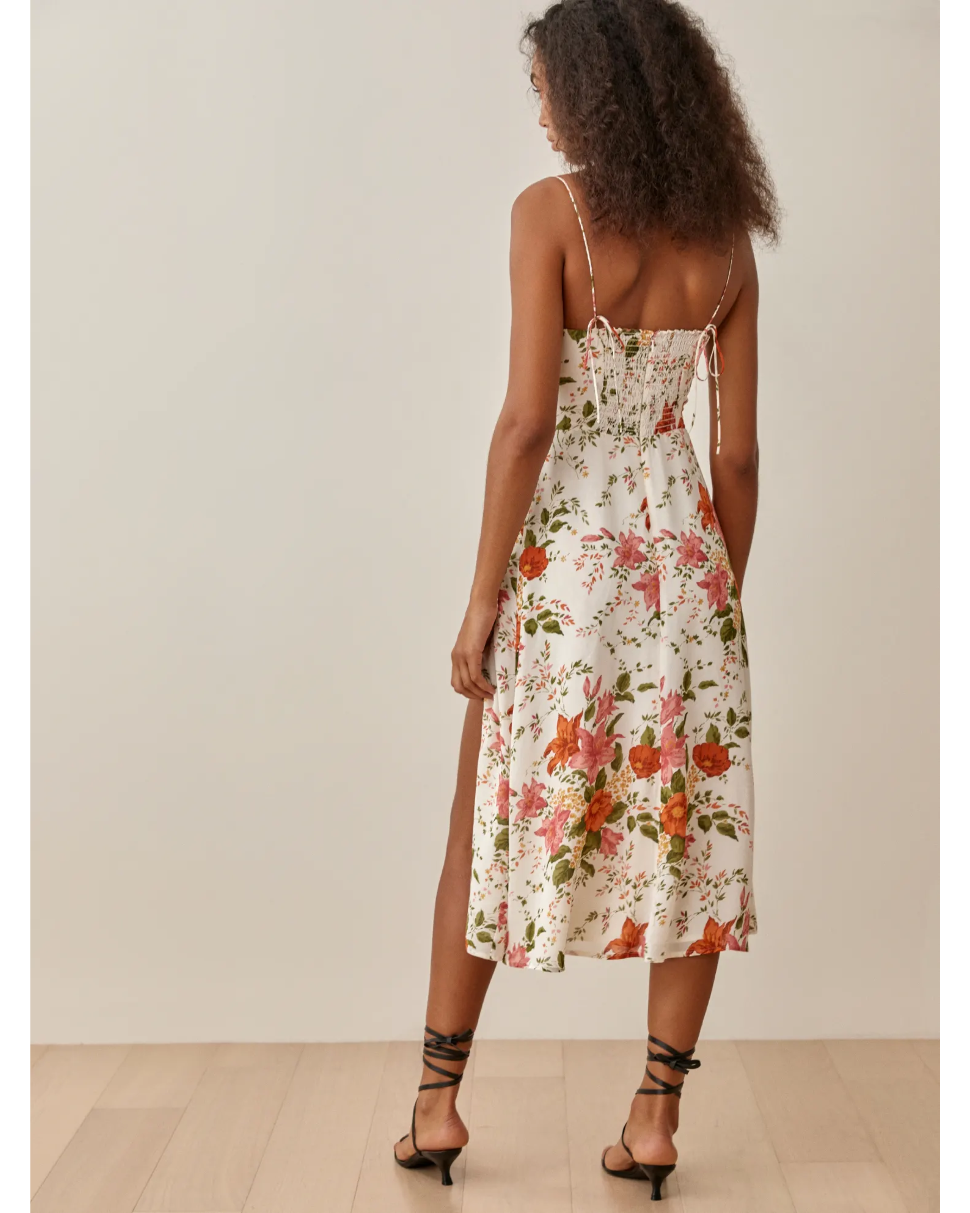- Tie straps, sweetheart neckline, side slit, lined. back zipper.