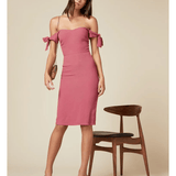 The "Reformation Marla Dress" is an elegant off-shoulder midi dress with sleeve ties. and charming bow accents on the sleeves. Its timeless design makes it perfect for both casual and formal occasions.