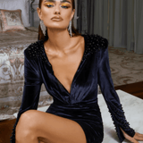 This deep V-neck velvet dress,adorned with black pearl detaling on the shoulders and sleeves, creates an unforgettable look for any special night.