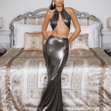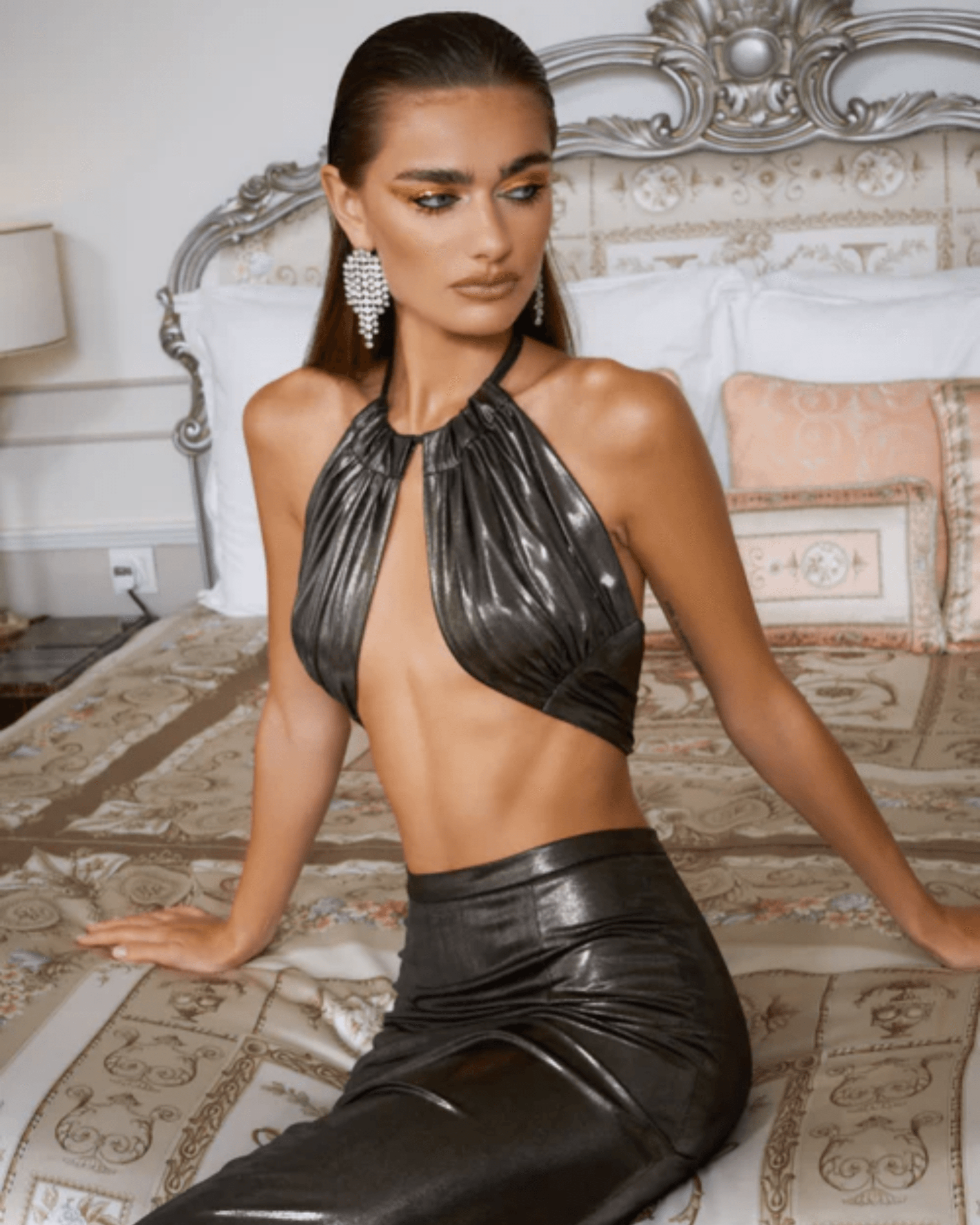 This versatile metalic crop top offers two different wearing styles, with adjustable neck straps for added comfort and customization.