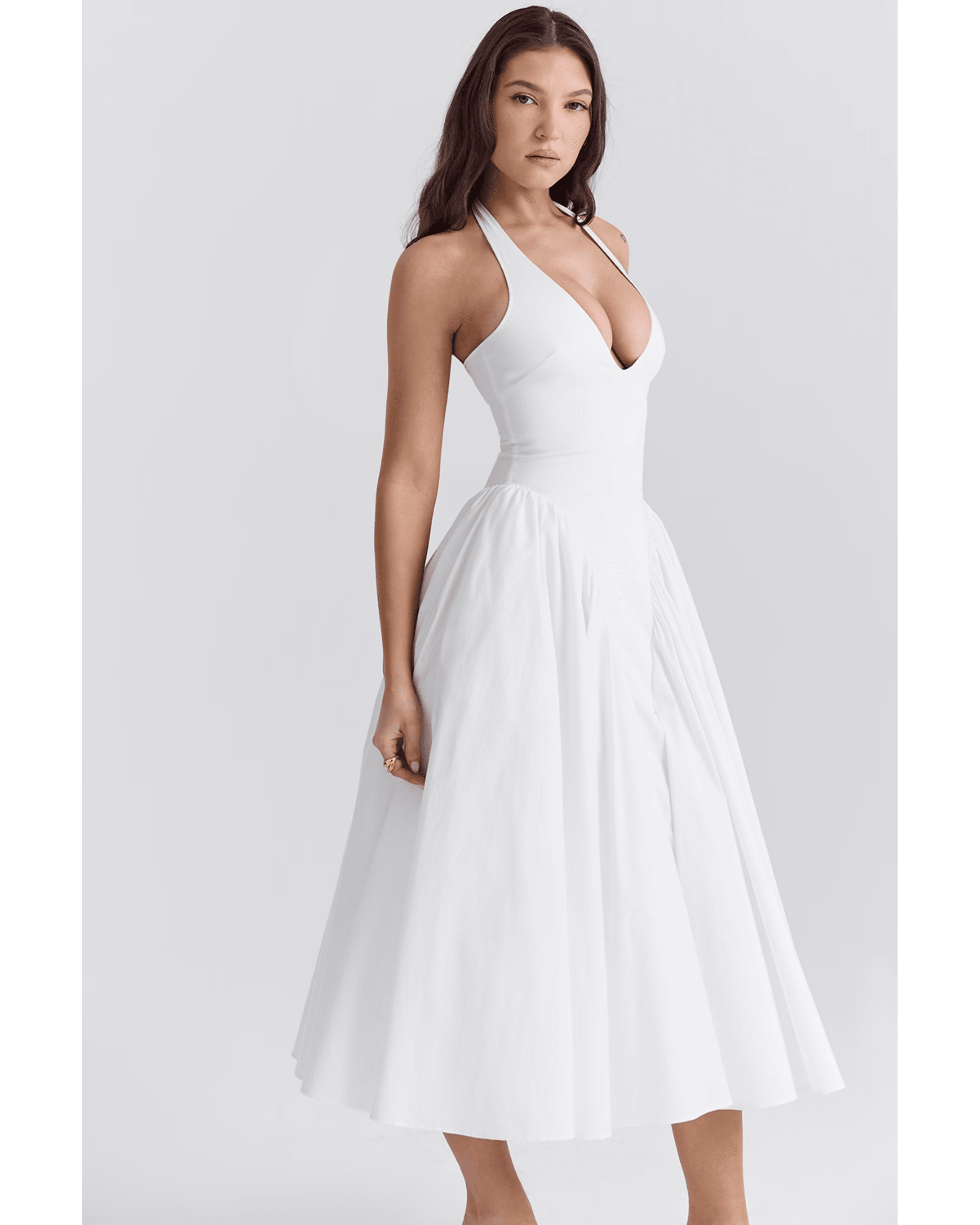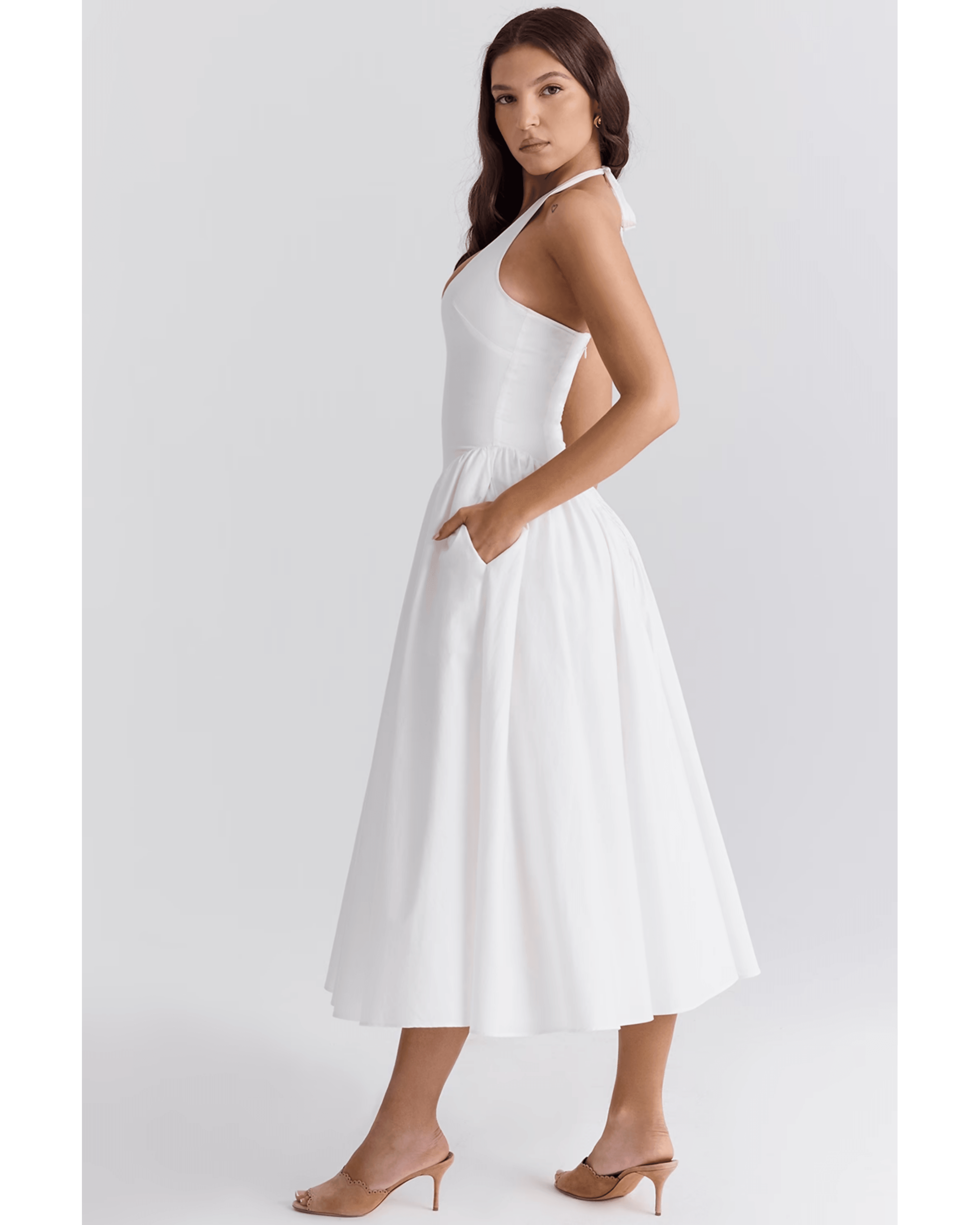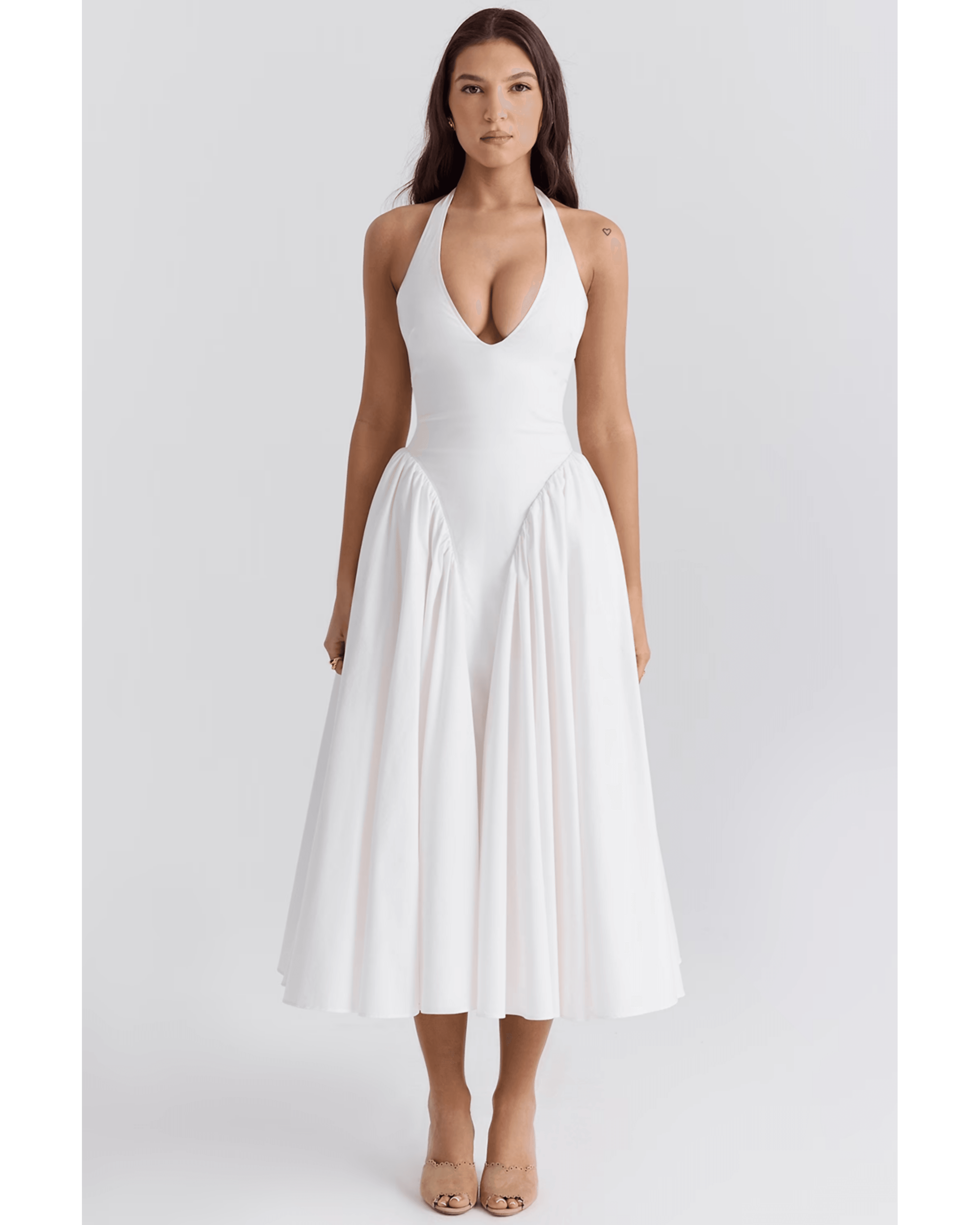 With a shape reminiscent of vintage Hollywood eras, Marilyn is your perfect Italian Summer sundress. THE ultimate vacation dress, 'Marilyn' is made from a cotton-rich fabric and has a gorgeous silhouette with a fitted bodice. The plunge halter neckline ties beautifully in a bow, at the neck showcasing the revealing open back.