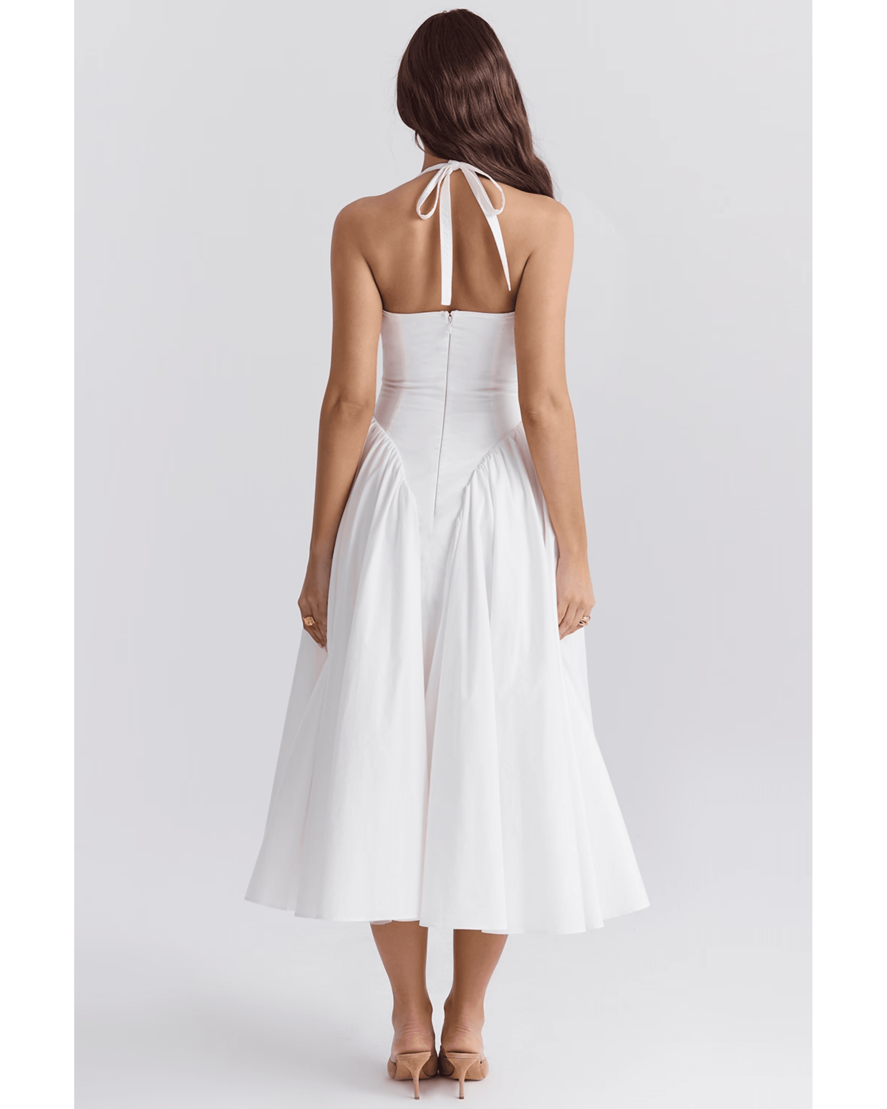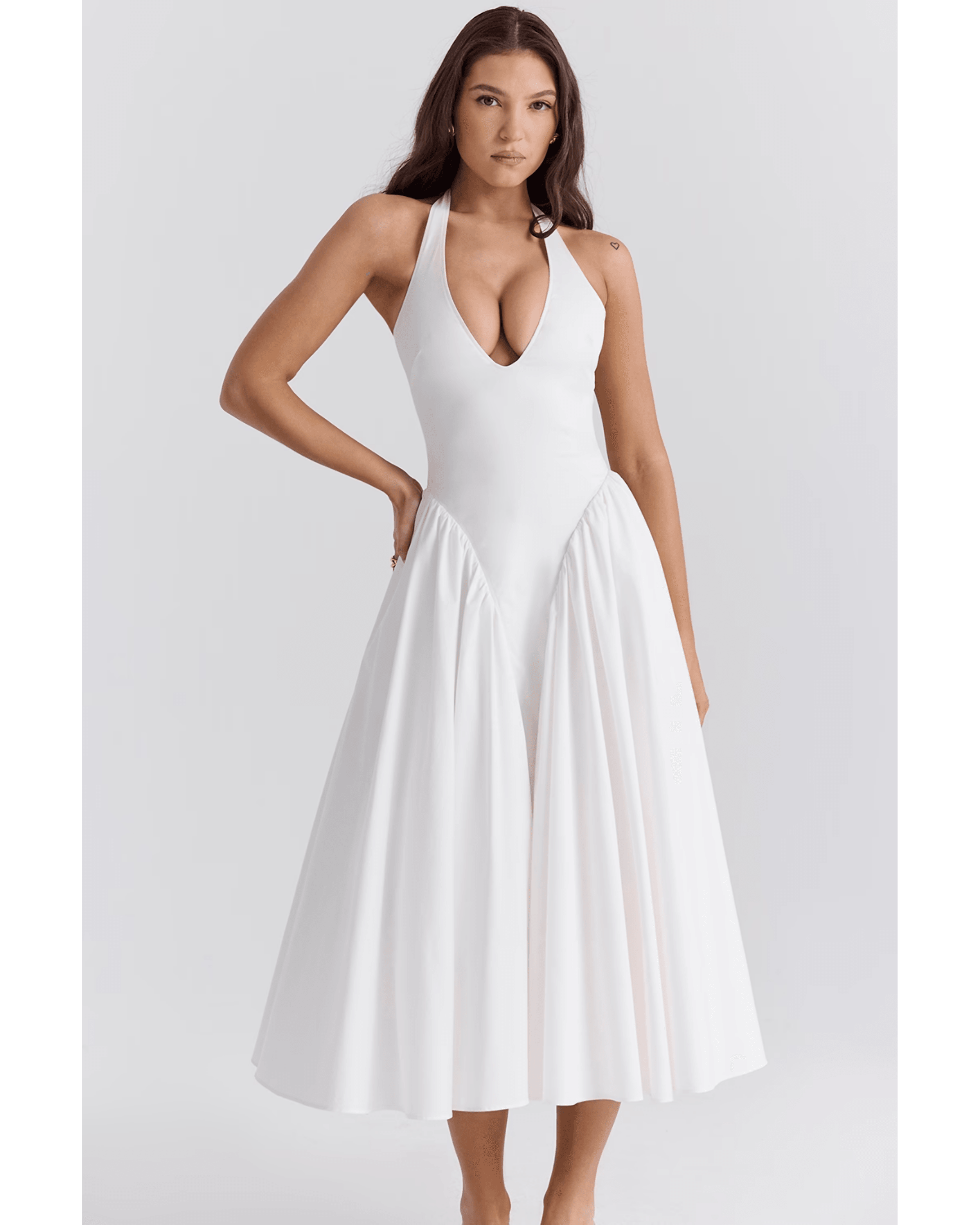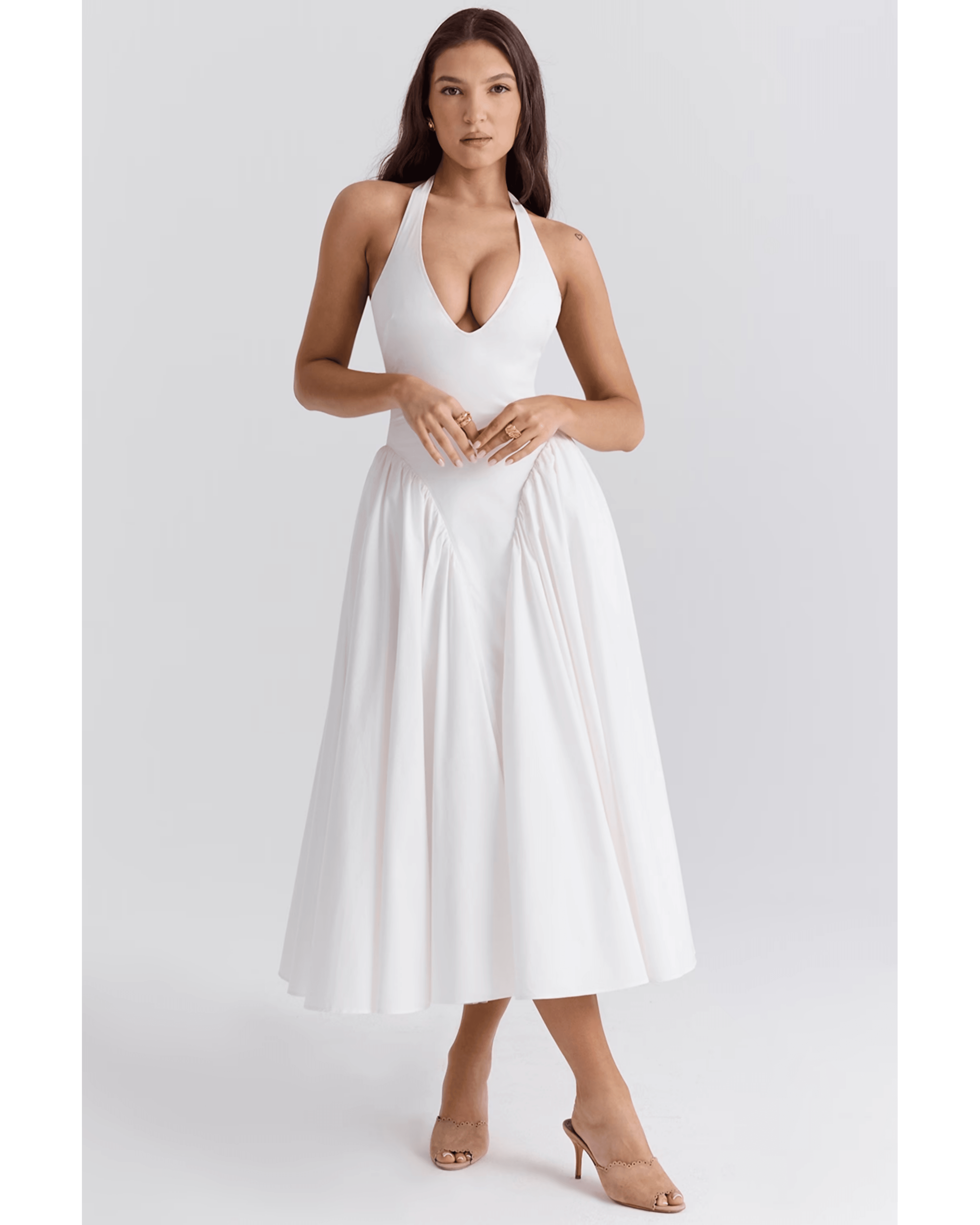 With a shape reminiscent of vintage Hollywood eras, Marilyn is your perfect Italian Summer sundress. THE ultimate vacation dress, 'Marilyn' is made from a cotton-rich fabric and has a gorgeous silhouette with a fitted bodice. The plunge halter neckline ties beautifully in a bow, at the neck showcasing the revealing open back.