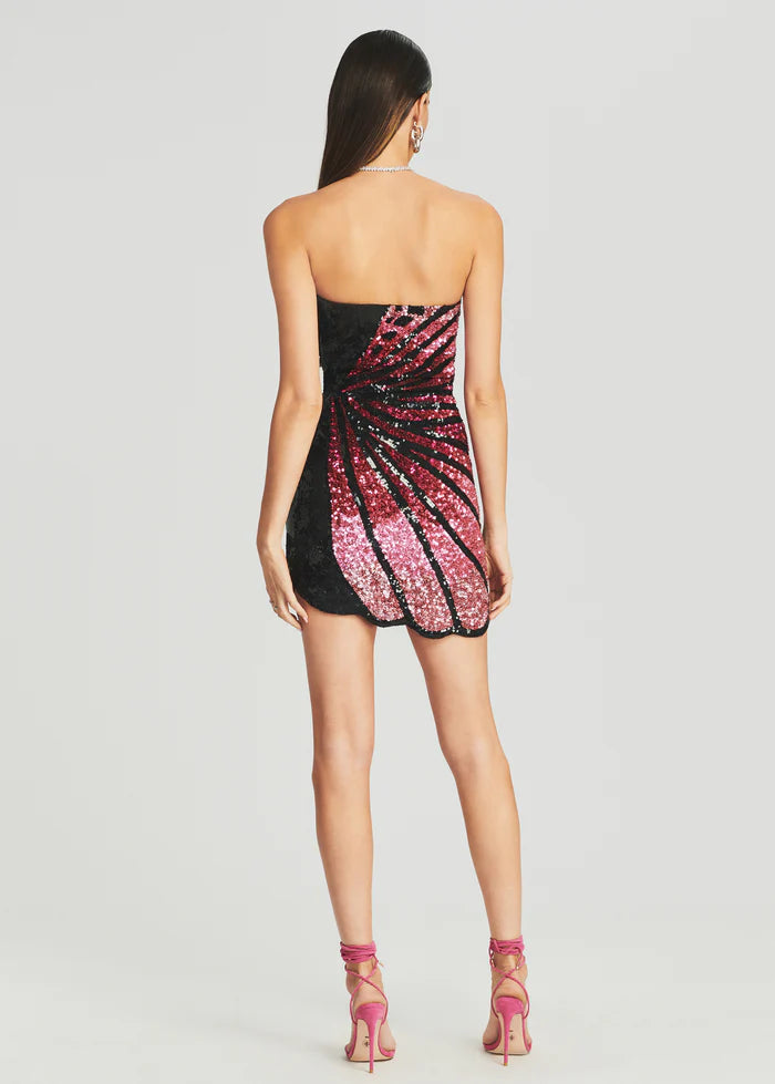 Featuring the motif of the season, our Arabelle Dress brings to life euphoric dreams. Crafted with scores of glistening sequins in pink ombre hues, the mini dress boasts a sleek strapless silhouette with a scalloped hem. Shown here in Black/Pink.