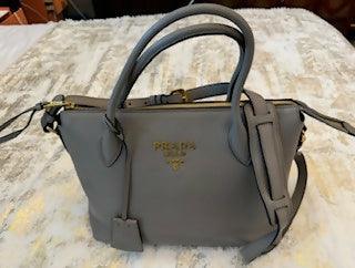 This Prada Vitello Phenix Leather handbag is so classy and pairs well with your wardrobe. The elegant gold Prada logo looks so beautiful on the gray leather. There is plenty of storage space inside of the handbag for your personal belongings. The adjustable strap makes it easy to wear over the shoulder or as a crossbody. The handles are also great for carrying when you are on the go.
