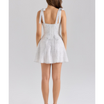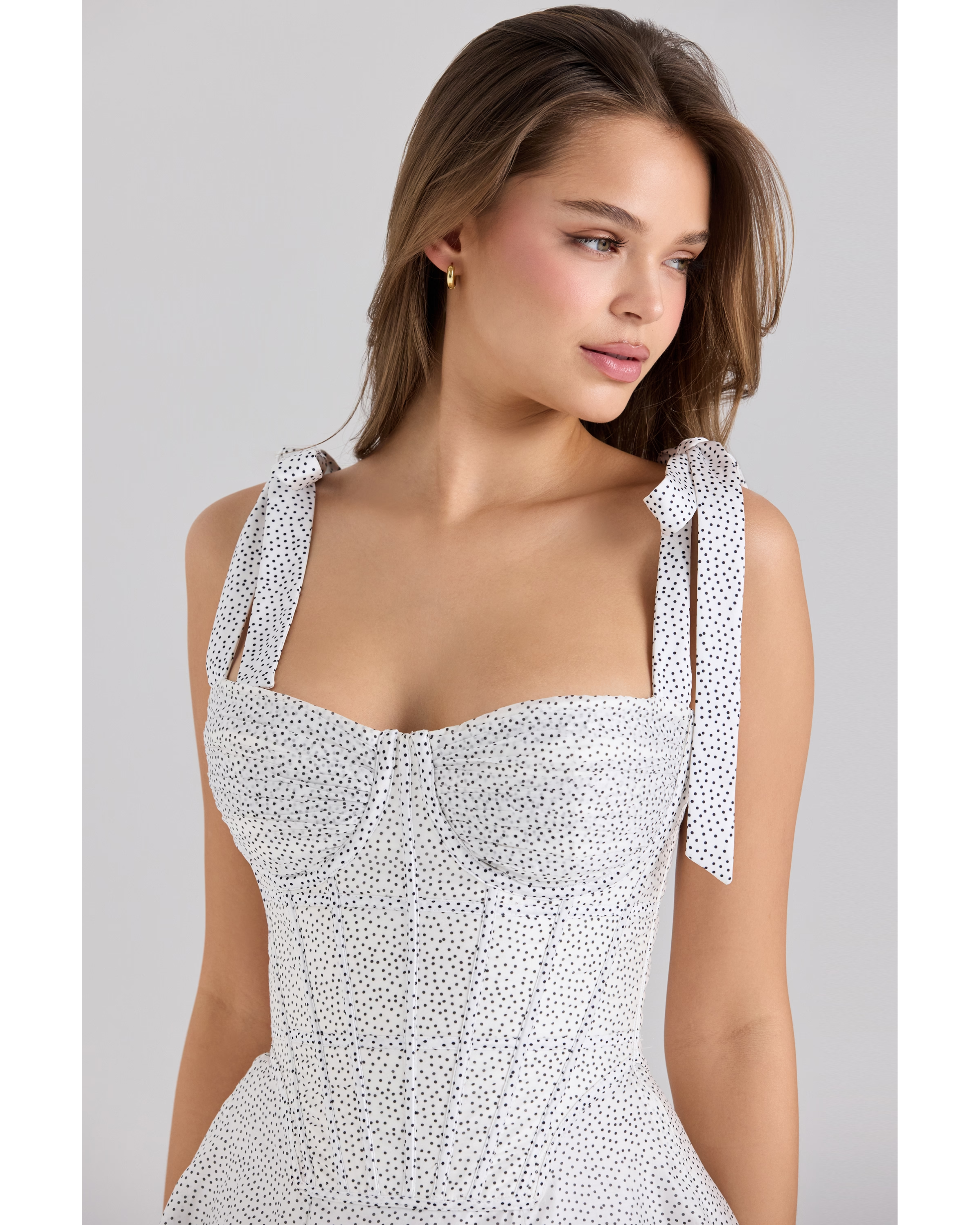 For soft structuring that goes with the flow, we just love 'Ariella', the cutest mini dress with the most adorable details. Made from floaty chiffon with an all over dotty print, 'Ariella' is cut to a mini silhouette with an underwired bust and slim-fitting corseted waist that laces up at the back. The straps can be adjusted with bow ties, and we've added a side zip for easy on. And to complete the silhouette? The skirt skims over the hips for a floaty finish. We love the 'Ariella' for its soft and sweet finish that works for any spring occasion.