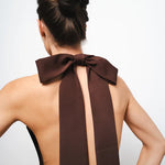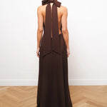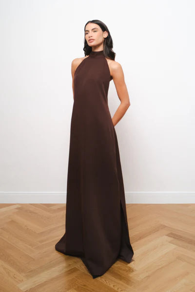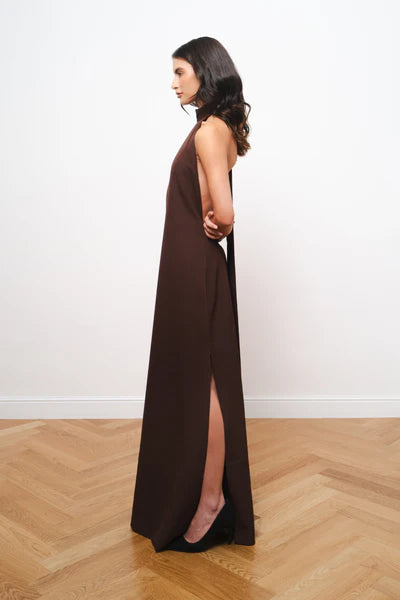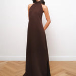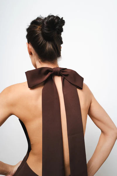 Make a statement in our Ava dress, a brown maxi dress designed with an open back detail, subtle side slit and halter neck design that ties into a soft, dramatic bow. The Ava dress offers ease without compromising on shape, it skims the body with a soft fit that flatters the waist while leaving room to move comfortably. Made from polyester and lined with 100% cotton, it holds its shape while allowing for ease and movement.