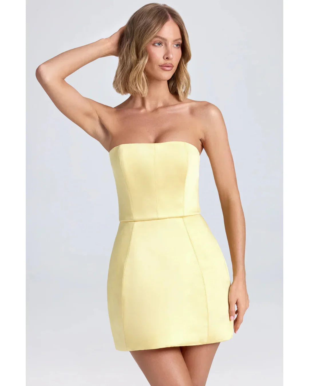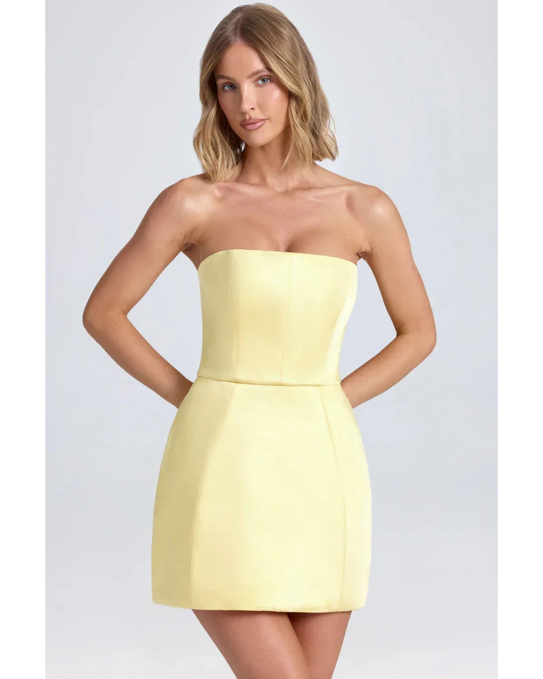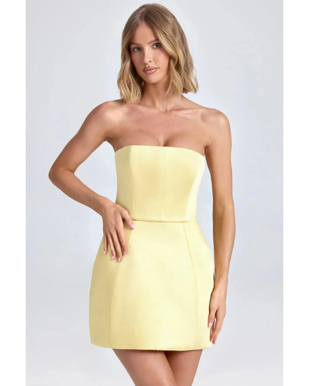 Classic minimalism with a structured twist. Modelled on timeless styles, the Haisley mini dress is cut from recycled heavyweight satin to a shapely A-line silhouette that sculpts the waist and flares out at the hips. It features a built-in corset for enhanced shaping and support, as well as contouring seams that create an hourglass look. Bandeau neck Built-in corset bodice Shaping seams Structured tulip skirt Concealed rear zip fastening A-line silhouette