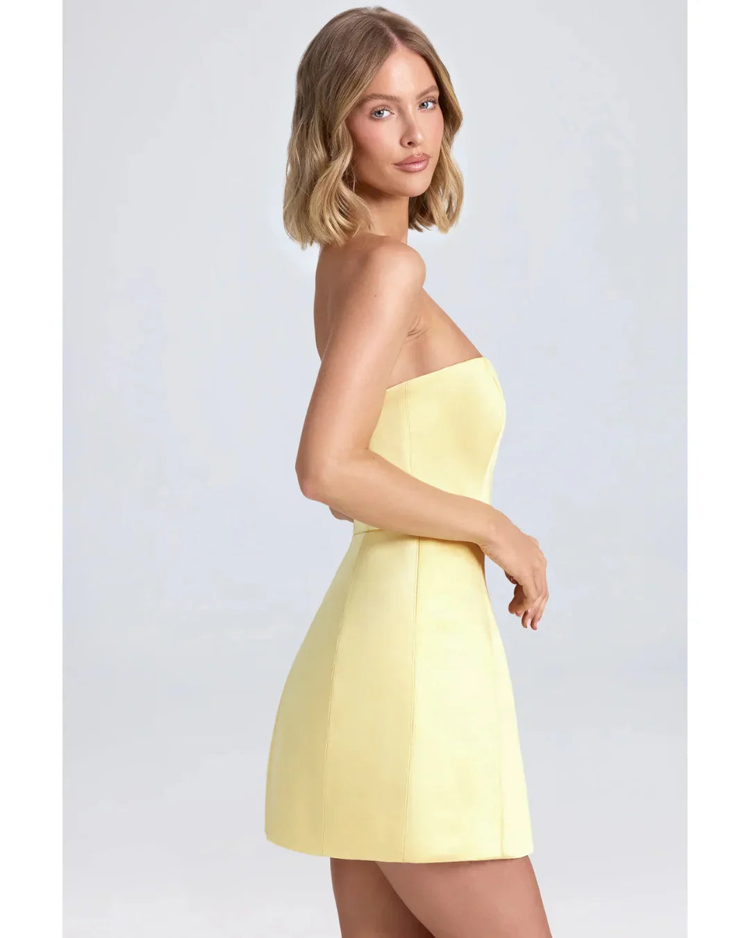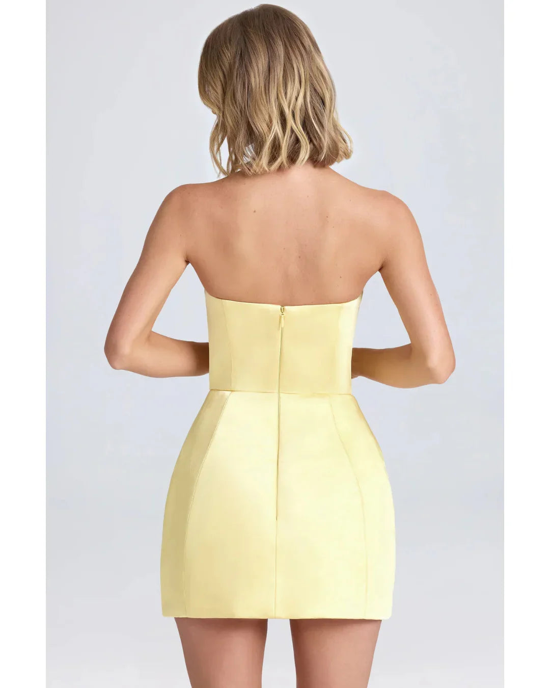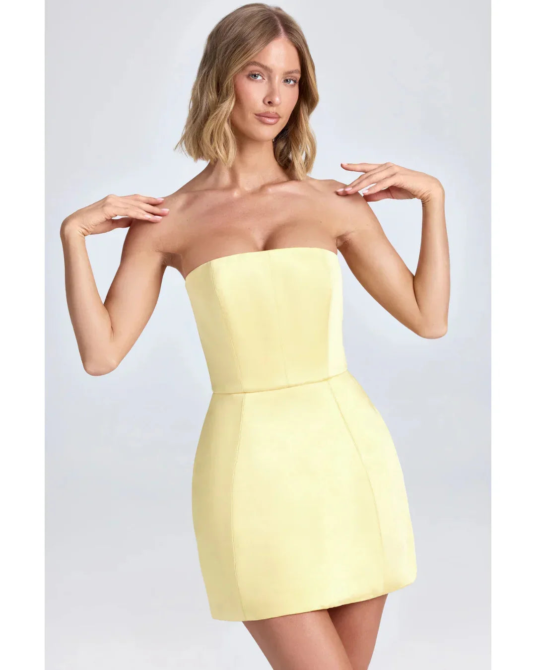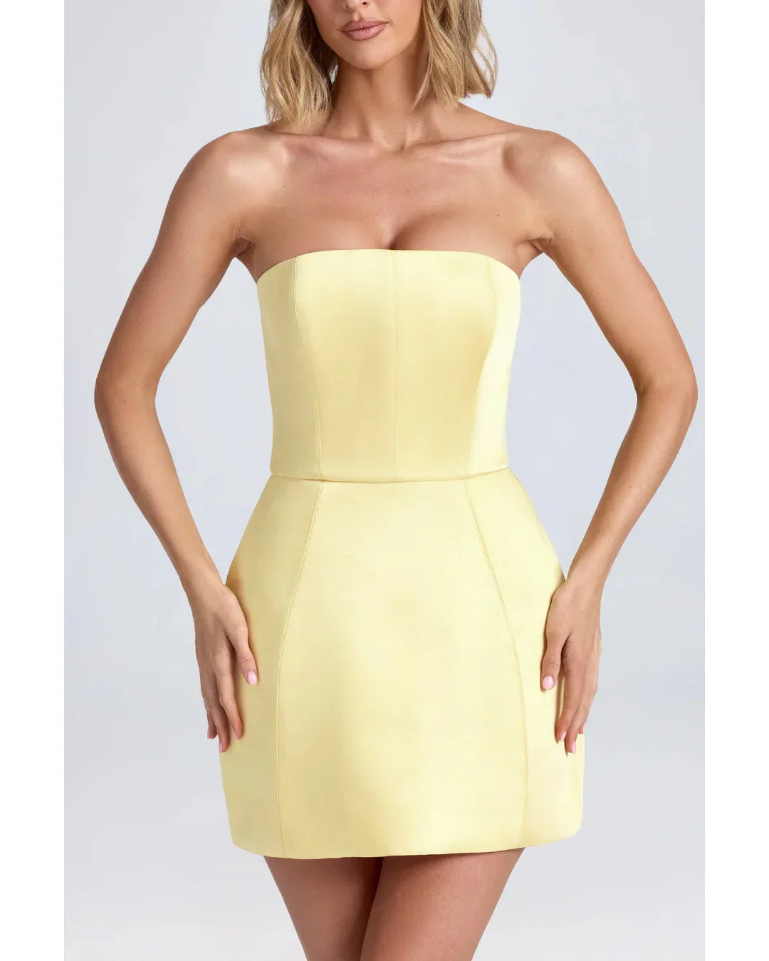 Classic minimalism with a structured twist. Modelled on timeless styles, the Haisley mini dress is cut from recycled heavyweight satin to a shapely A-line silhouette that sculpts the waist and flares out at the hips. It features a built-in corset for enhanced shaping and support, as well as contouring seams that create an hourglass look. Bandeau neck Built-in corset bodice Shaping seams Structured tulip skirt Concealed rear zip fastening A-line silhouette