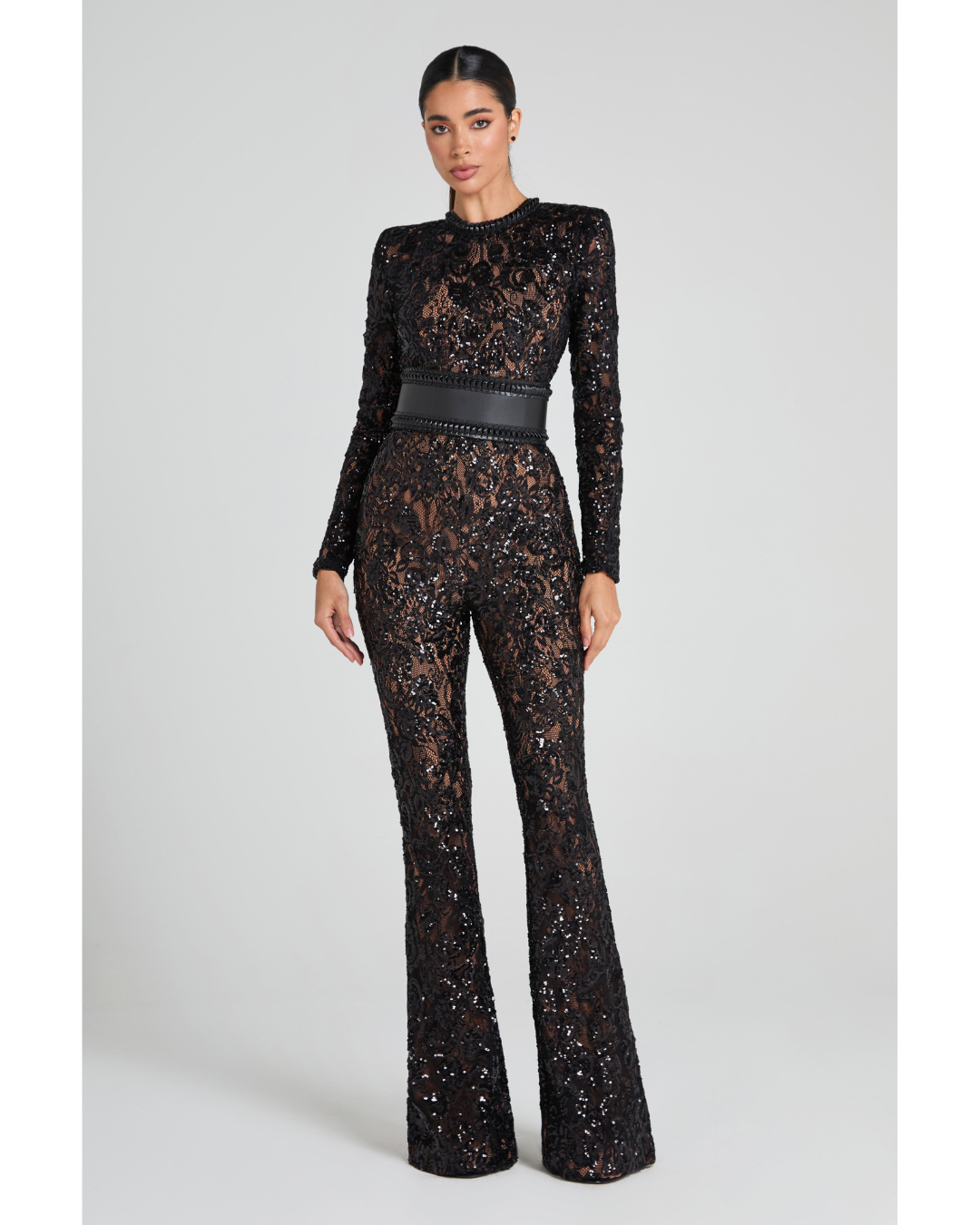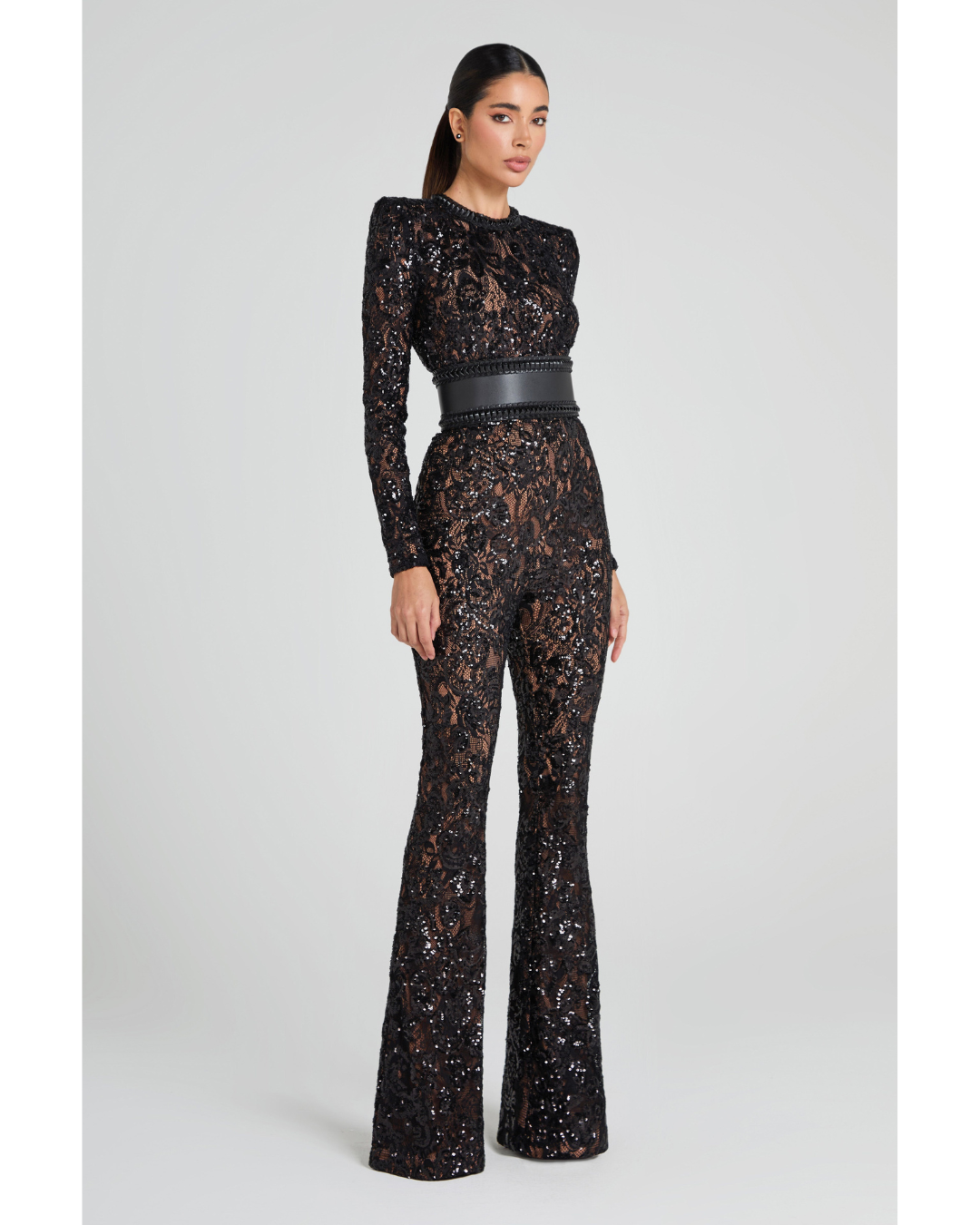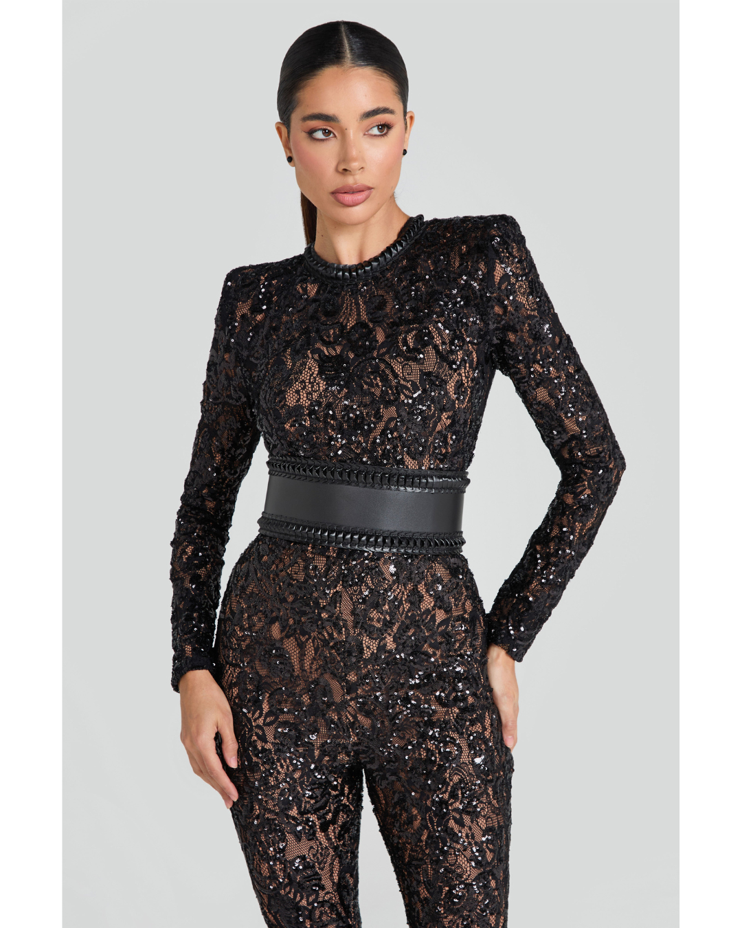 Inspired by Parisian style, our BELLA jumpsuit takes a modern twist on a traditional design. The nude lining provides coverage, whilst accentuating the intricate sequin embellished lace detailing. This style looks equally as good paired with or without the leather corset belt.