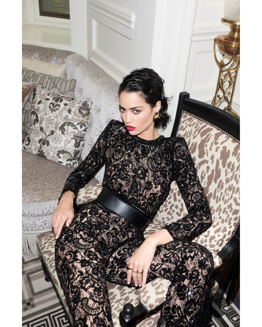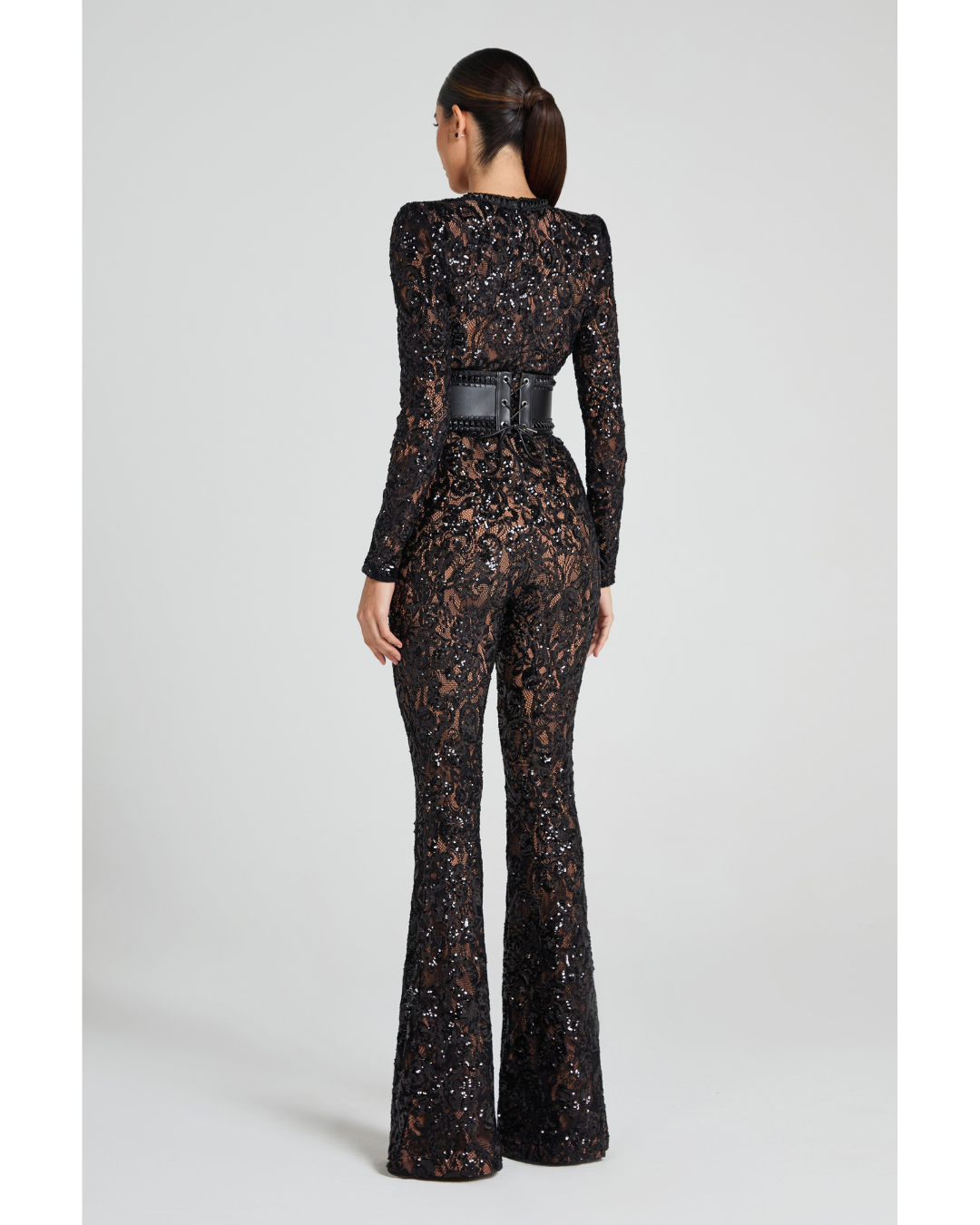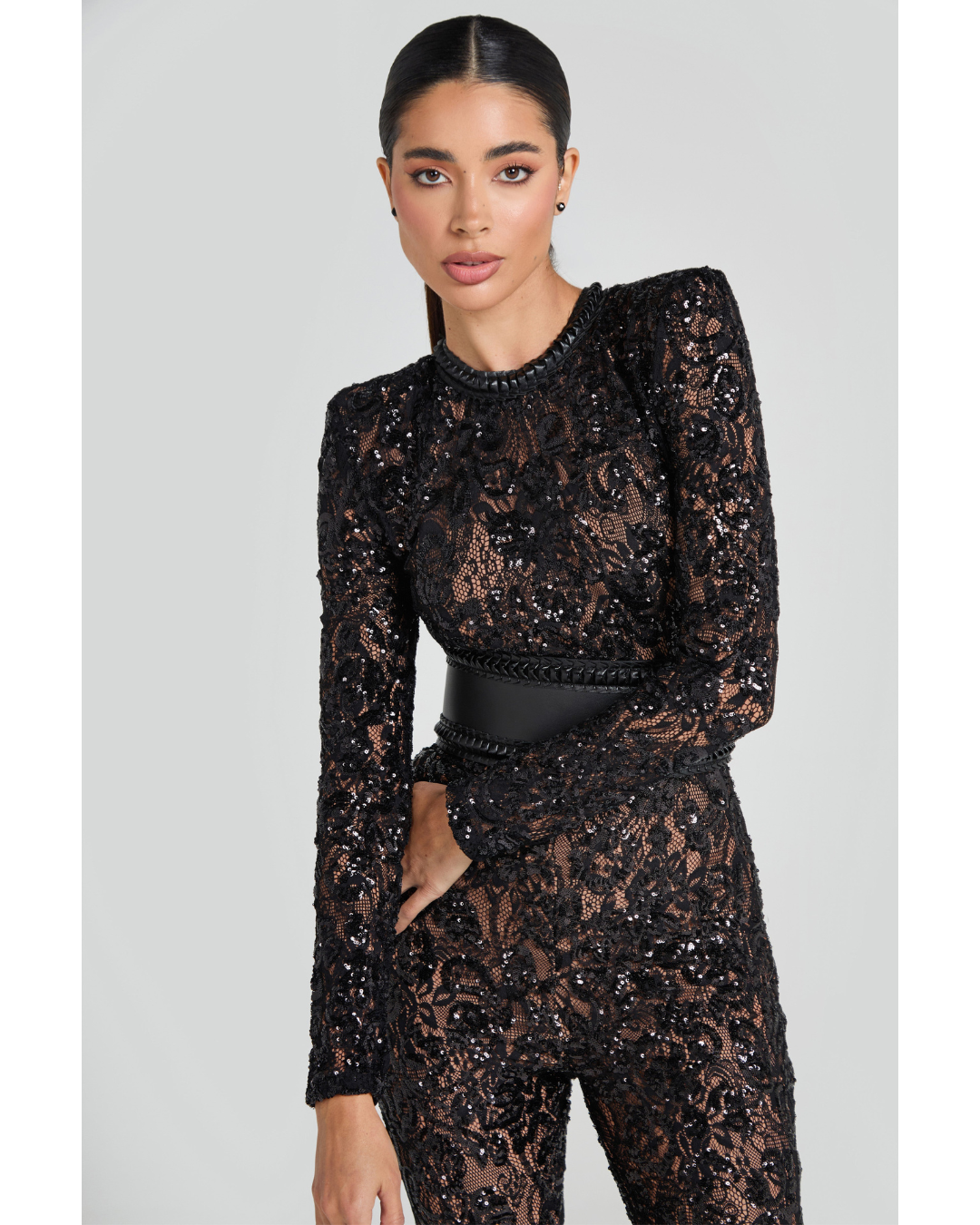 Inspired by Parisian style, our BELLA jumpsuit takes a modern twist on a traditional design. The nude lining provides coverage, whilst accentuating the intricate sequin embellished lace detailing. This style looks equally as good paired with or without the leather corset belt.