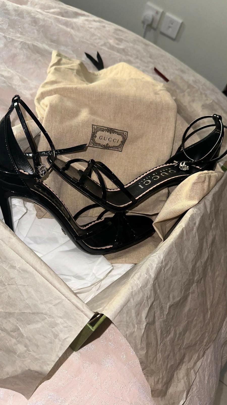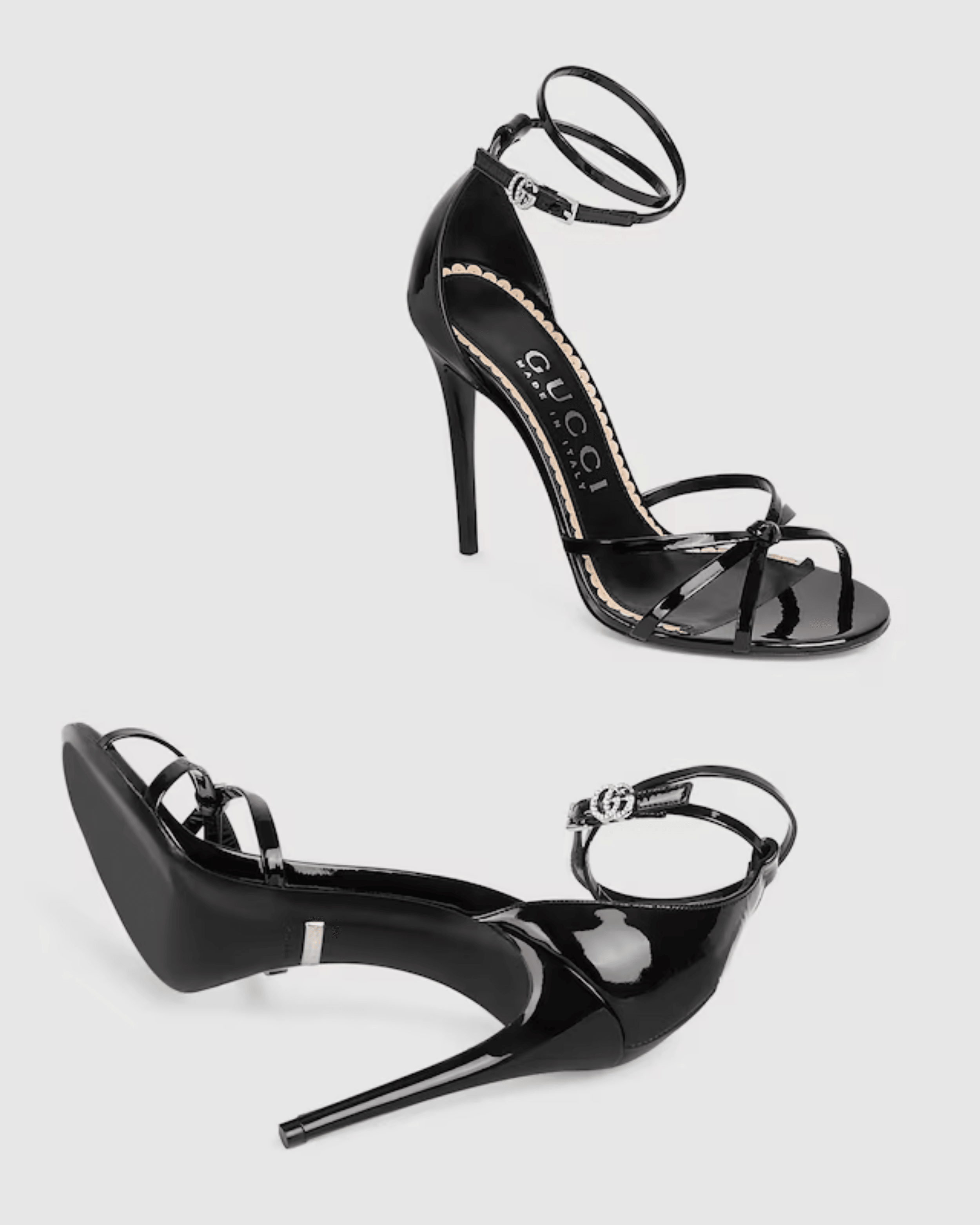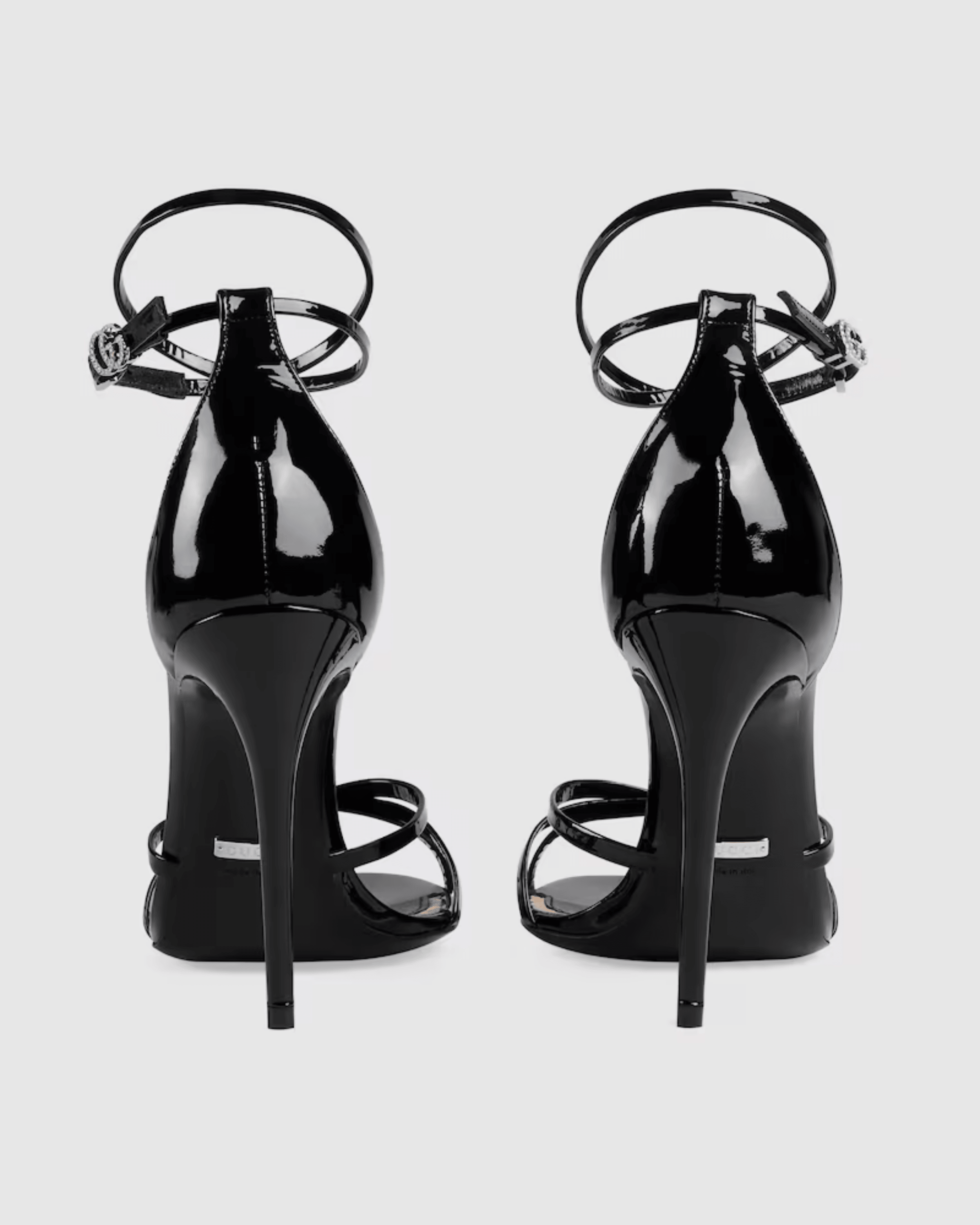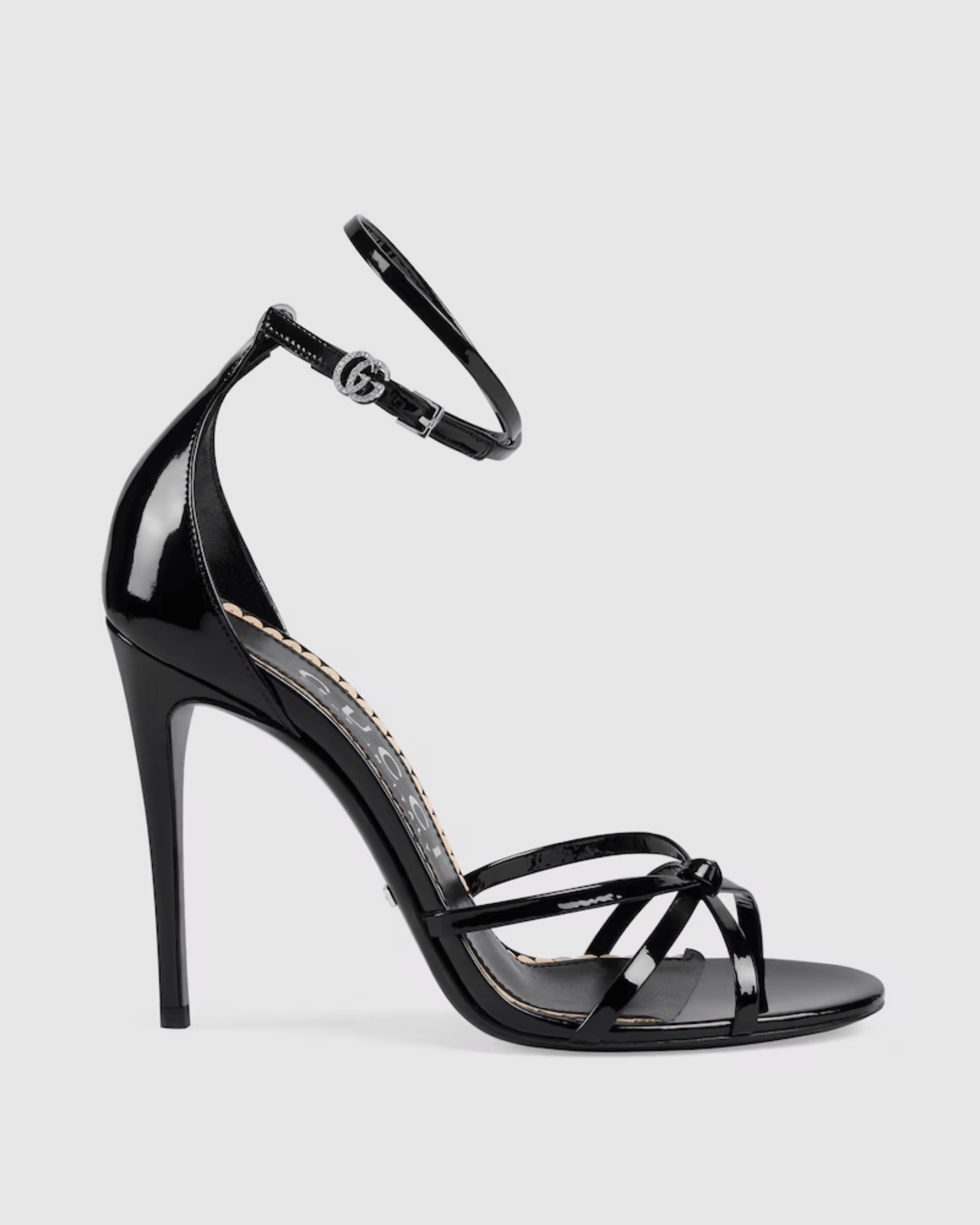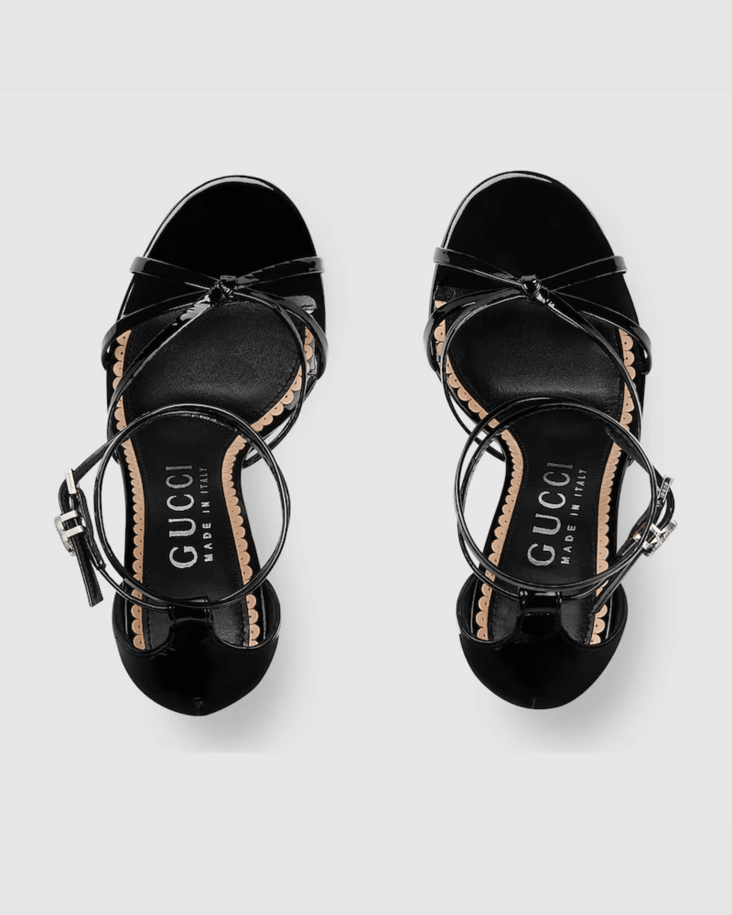 A classic silhouette, the heeled sandal is presented for the latest Gucci collection in shiny patent leather. Minimal silhouettes enhance elegant looks, with a sophisticated touch.