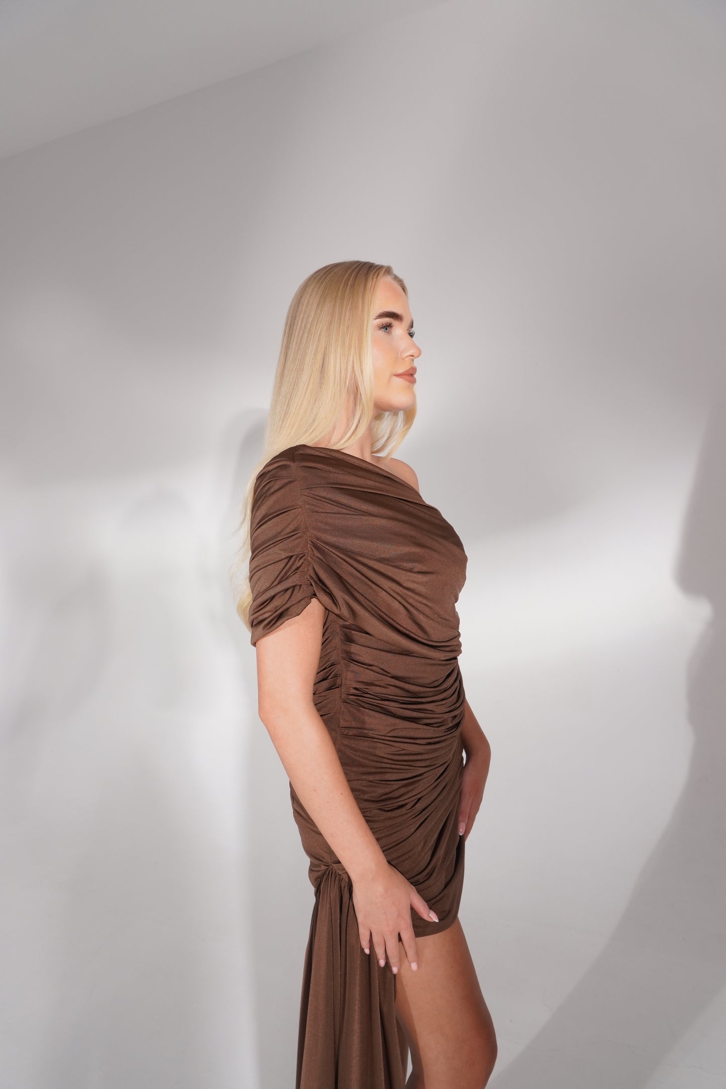 âBlair' a fully ruched mini with a classic one draped shoulder.