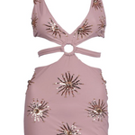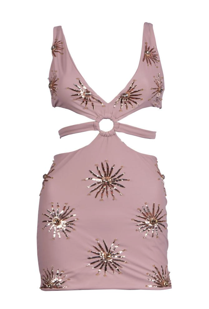 Blush Oceanus Callie Nightdress with gold sequin starburst detailing. Features a plunge neckline, ring-front cut-out and adjustable tie detail. Finished in a fitted silhouette with a sleek, sculpting feel, the perfect statement for evening events.