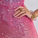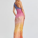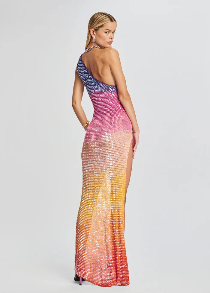 Embody the sunset in our Candice Crochet Dress. Perfect for oceanside days, this style marries delicate crochet with statement sequins. This one-shoulder silhouette hugs the body and features a sexy cutout at the chest. It's finished with a dramatic thigh-high slit. Shown here in Sunset Ombre.