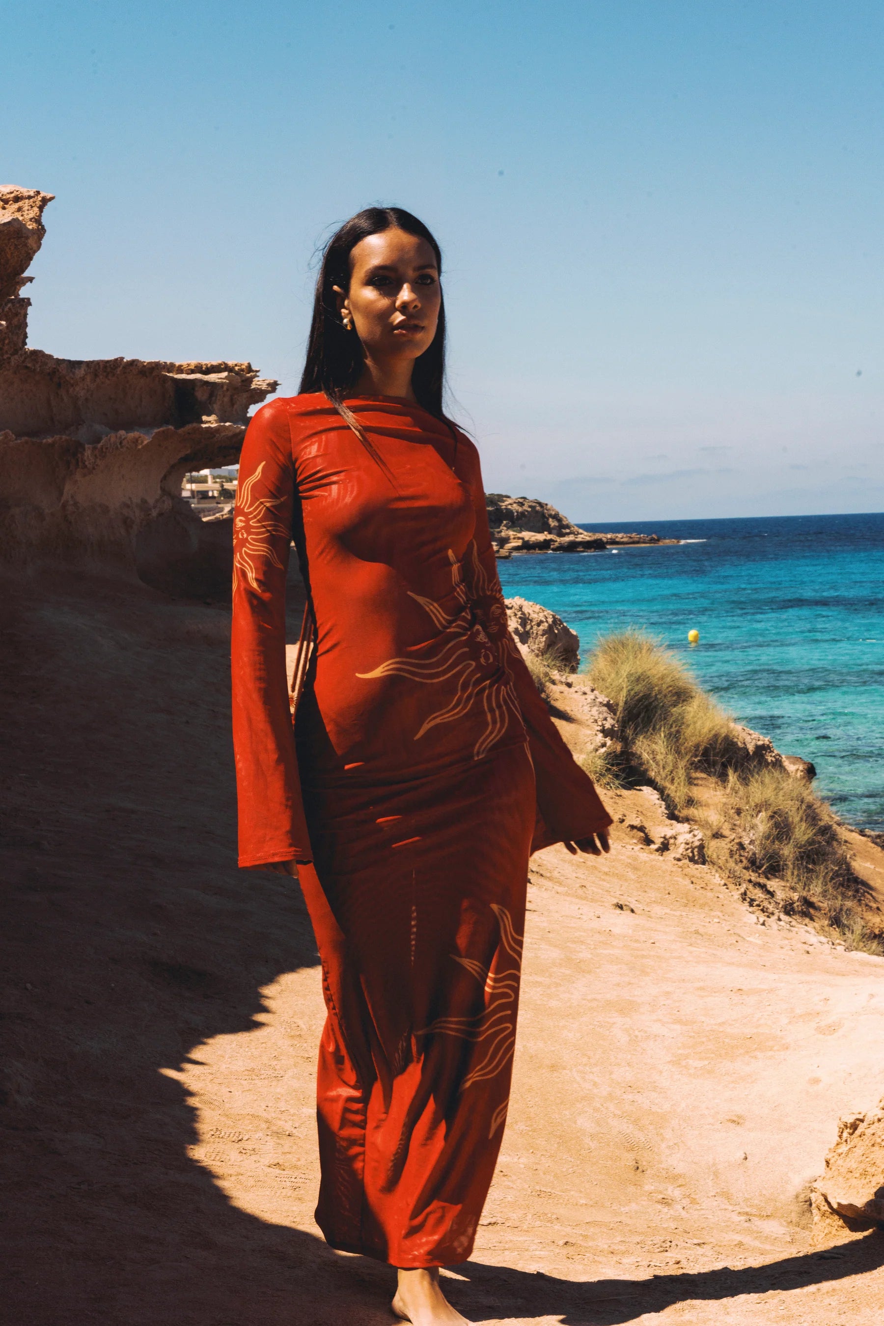 Featuring a a bold open back with tie fastening and luxury gold charm details, flared sleeve and in our signature mermaid maxi shape all perfectly completed with our Celeste print on the color of the season.